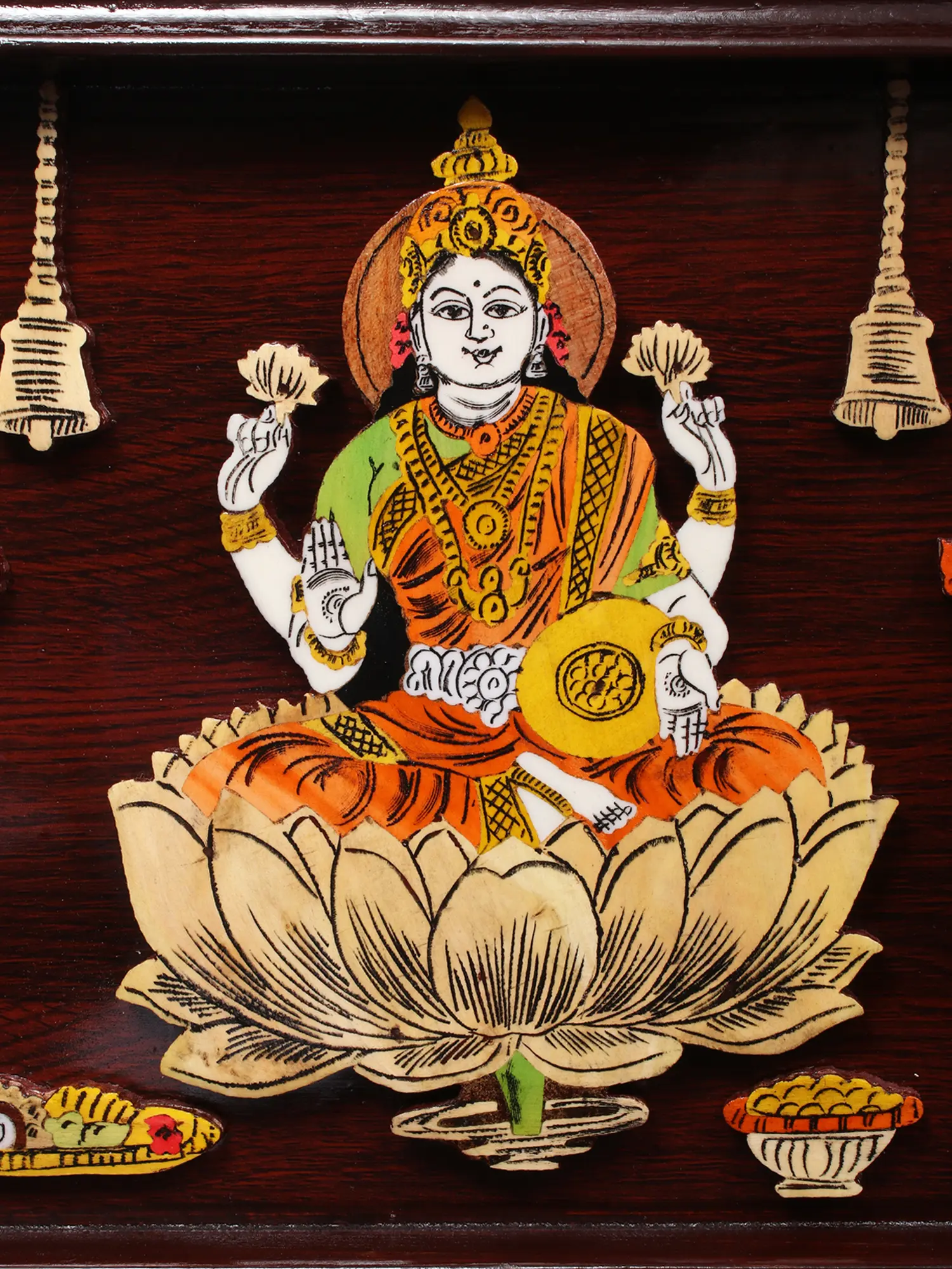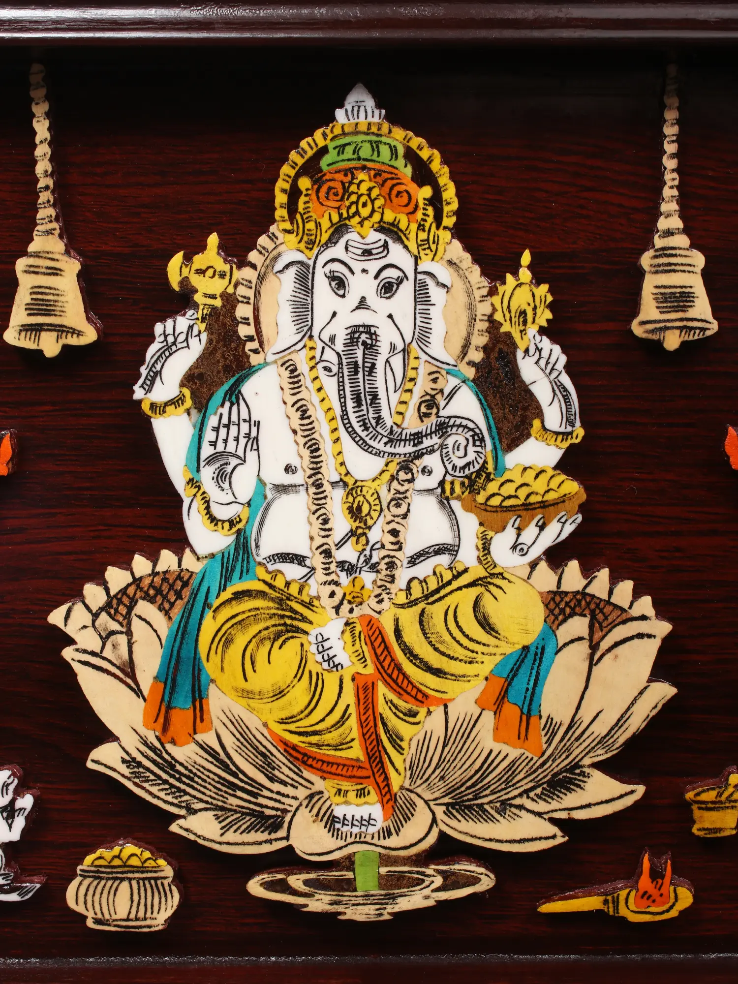 You'll appreciate the vibrant portrayal of Goddess Lakshmi, seated gracefully on a lotus, symbolizing wealth and fortune. Beside her, Lord Ganesha, the remover of obstacles, radiates benevolence. To her right, Goddess Saraswati, the embodiment of knowledge and the arts, is depicted with her serene countenance. The intricate inlay work extends to the decorative elements, including hanging lamps and bells, as well as the offerings laid at their feet, all rendered with stunning accuracy on a generous 12.7-inch height and 30.7-inch width panel, with a substantial 1.5-inch depth that adds to its sculptural quality.