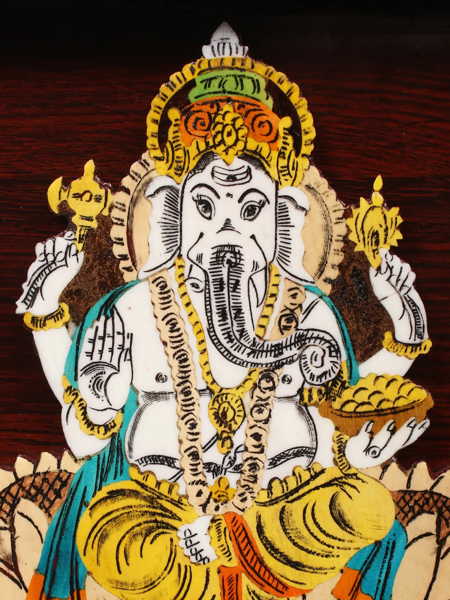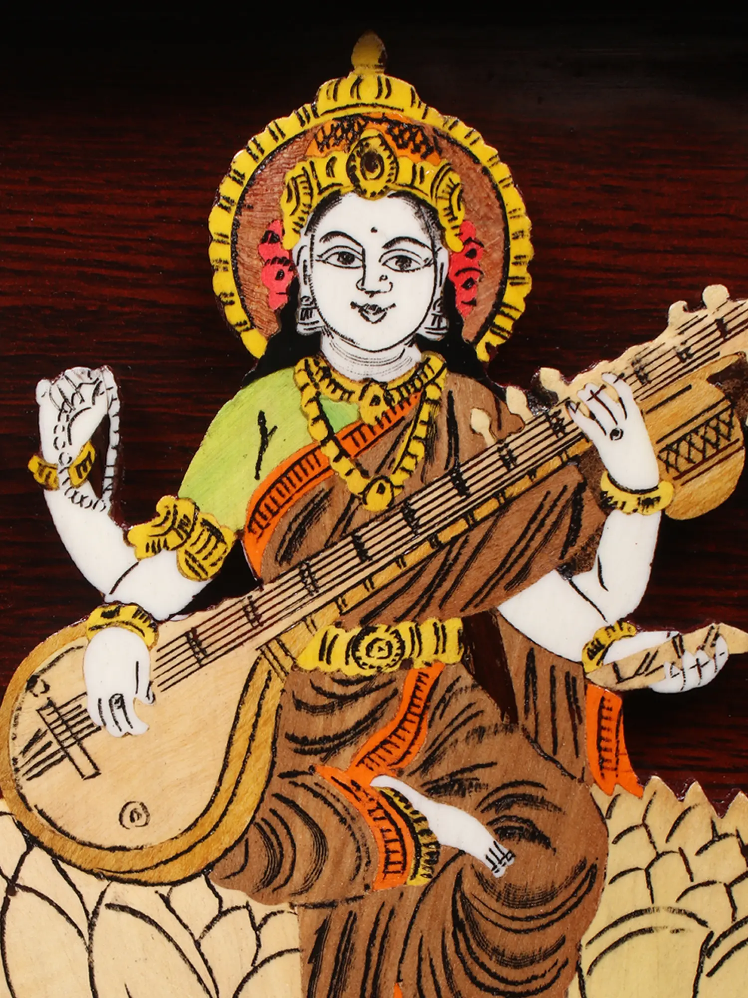 Crafted with meticulous attention to detail, this artwork showcases the esteemed Mysore tradition of wood inlay. Each element is brought to life using natural colors applied with exceptional skill onto a rich wooden base. The three-dimensional effect achieved through precise inlay work elevates the imagery, creating a tactile and visually captivating experience that speaks volumes of the artisan's dedication.