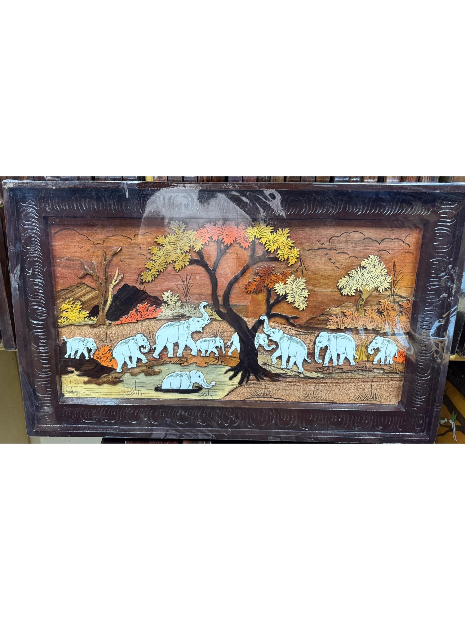 Immerse yourself in the serene beauty of this exquisite rosewood panel painting, a masterpiece of traditional Indian craftsmanship. Measuring 30 inches in width, this artwork depicts a tranquil village scene, centered around a majestic herd of elephants gracefully navigating their natural habitat. The rich, deep tones of rosewood form the canvas, providing a warm and natural foundation for the intricate inlay work that brings the scene to life. The artist has masterfully captured the essence of a peaceful coexistence between nature and its inhabitants. A central, artfully rendered tree, its branches adorned with vibrant, contrasting inlaid leaves of yellow and autumnal hues, stands as a sentinel. Around it, a family of elephants, rendered with delicate precision, moves in a soft, flowing procession. From the grand matriarchs to the playful calves, each figure exudes a sense of calm and purpose. One gentle giant rests, its form a study in repose, while others amble along, their ivory tusks gleaming. The background is a textured tapestry of warm, earthy tones, suggesting rolling hills and a serene sky, further enhanced by subtle inlay work that mimics the gentle undulations of the landscape.