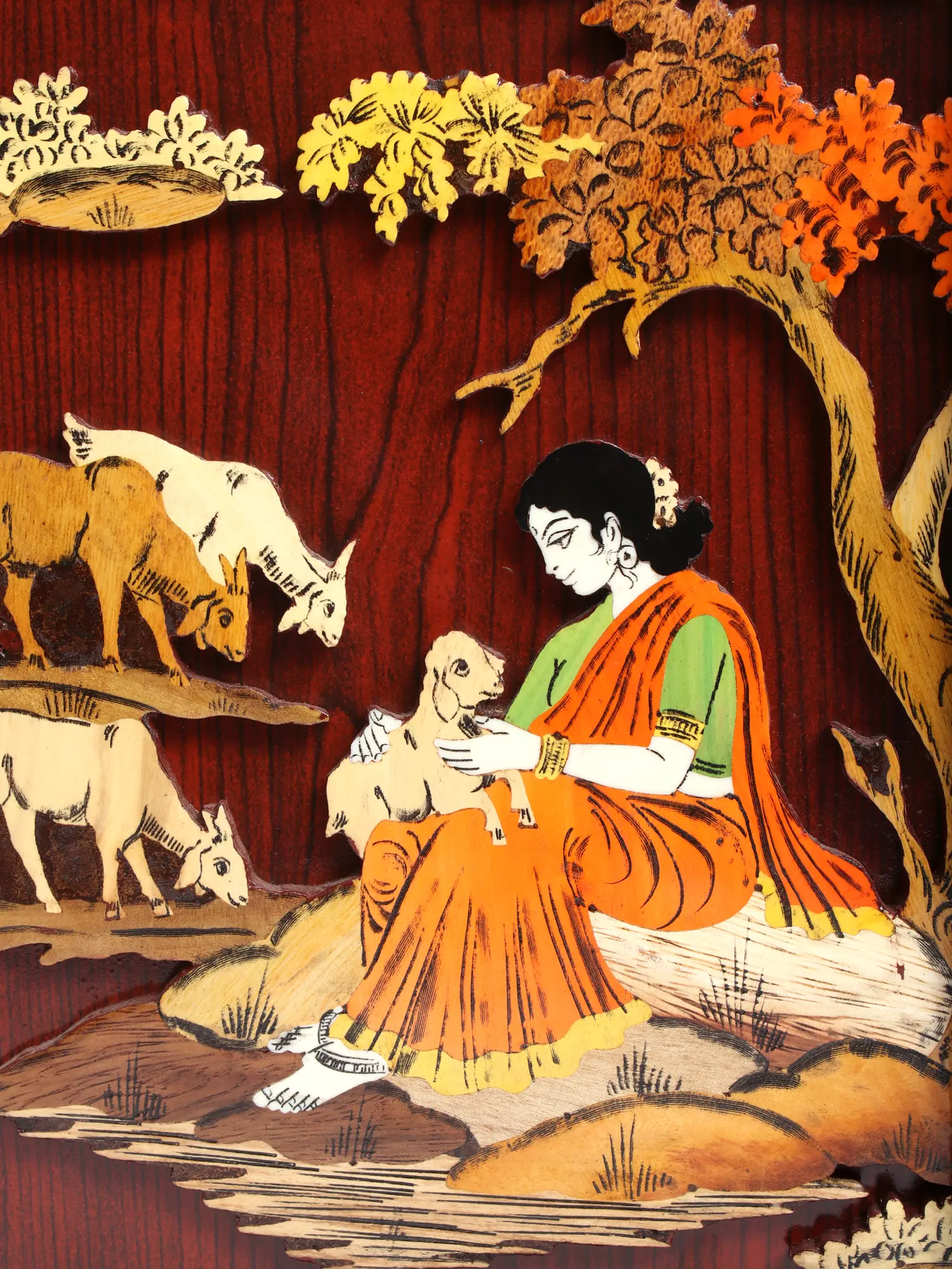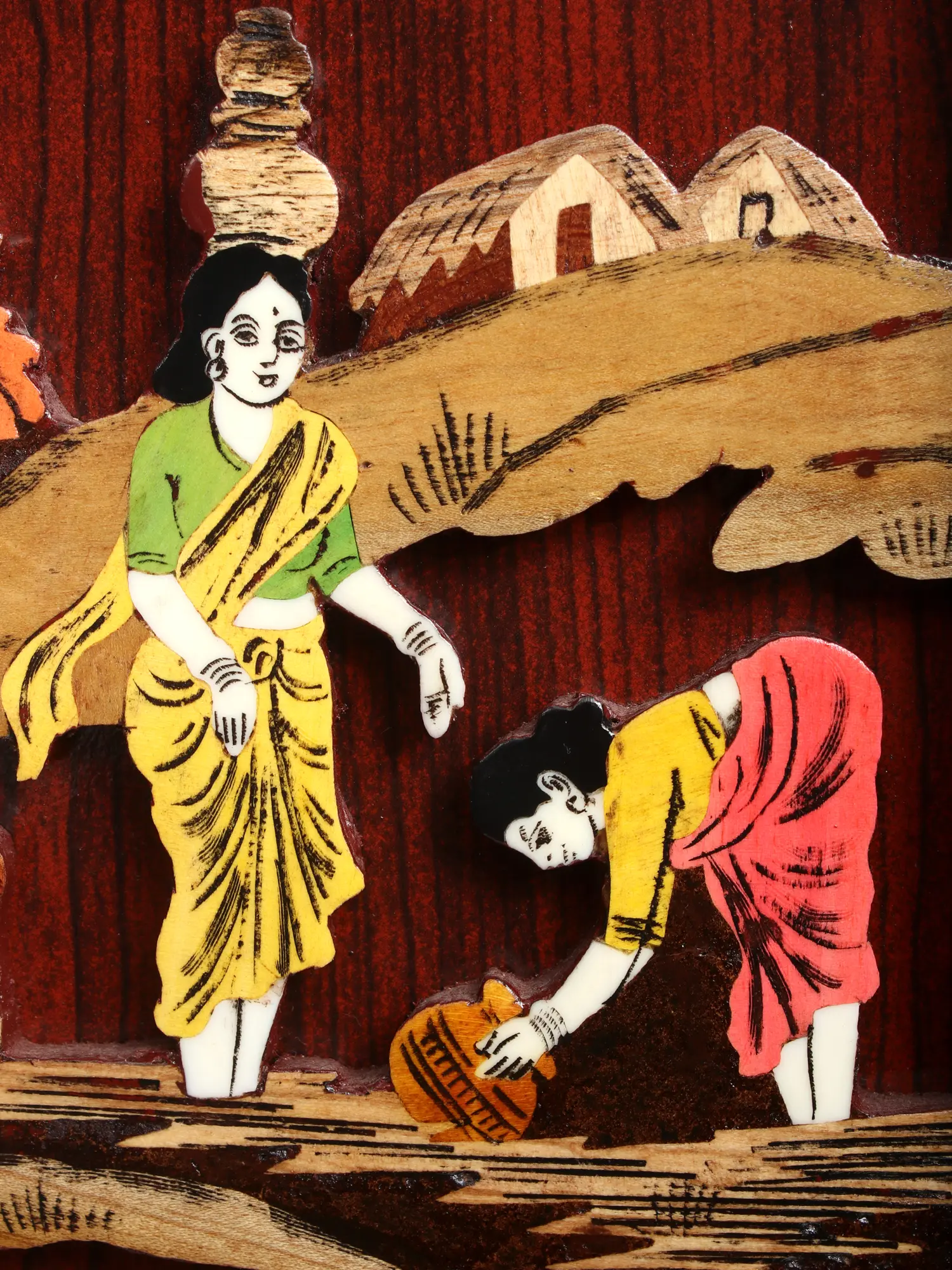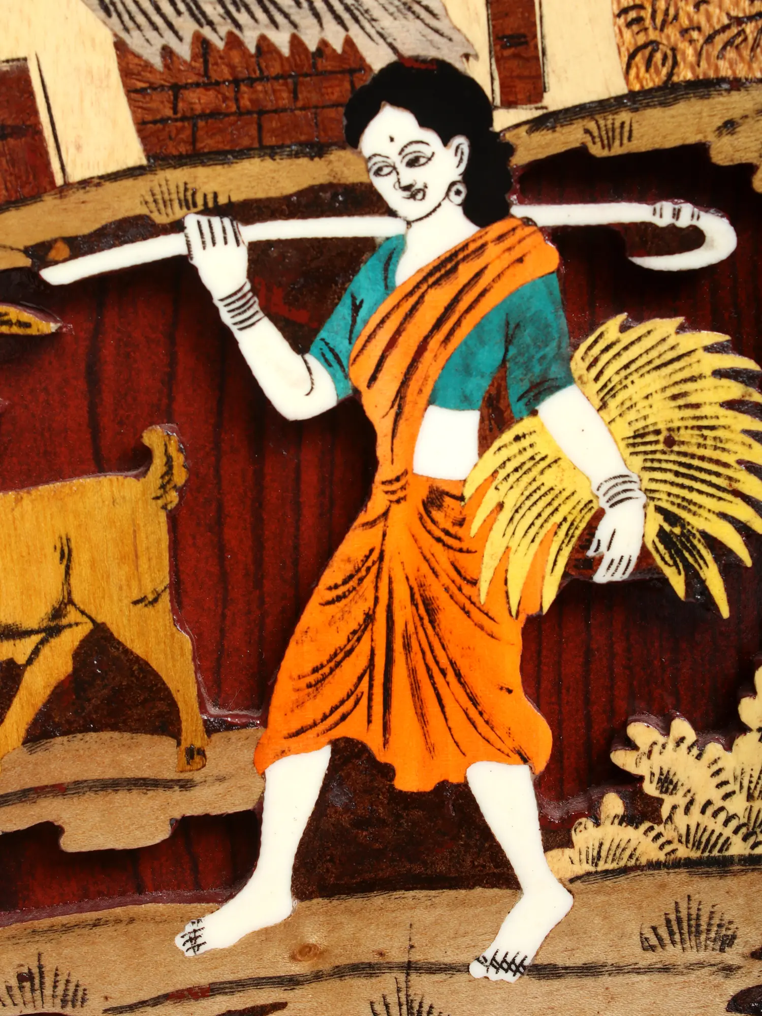 This artwork draws inspiration from the rich cultural tapestry of rural India, echoing the timeless scenes found in the traditional art of Mysore inlay. It captures the essence of a community deeply connected to the land, where daily chores and simple pleasures form the fabric of life. The depiction of women engaged in domestic tasks, tending to livestock, and cultivating the land speaks to a heritage of resilience and harmony with nature, reflecting motifs that have been cherished for generations.