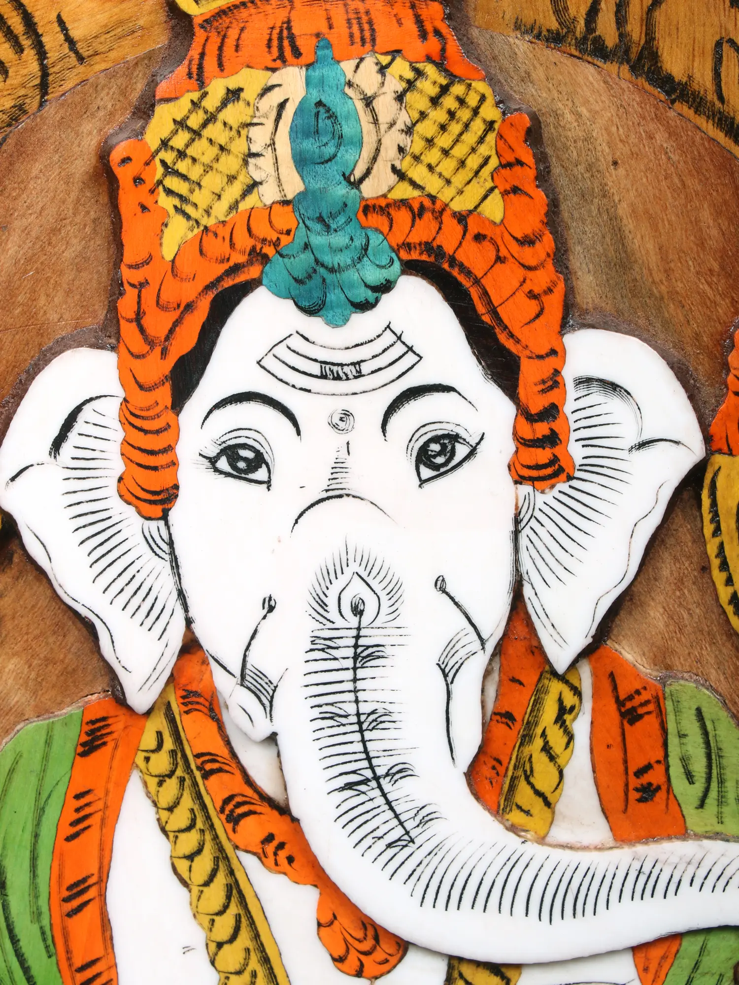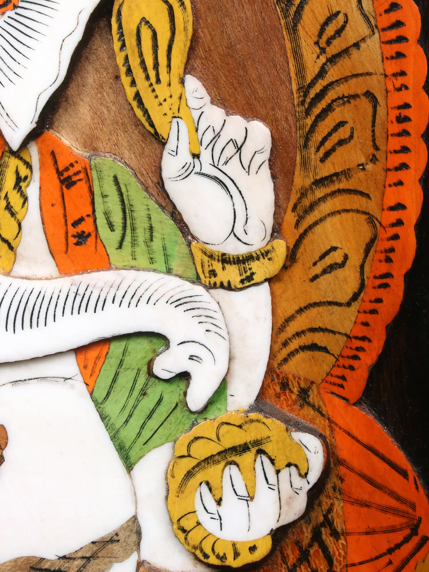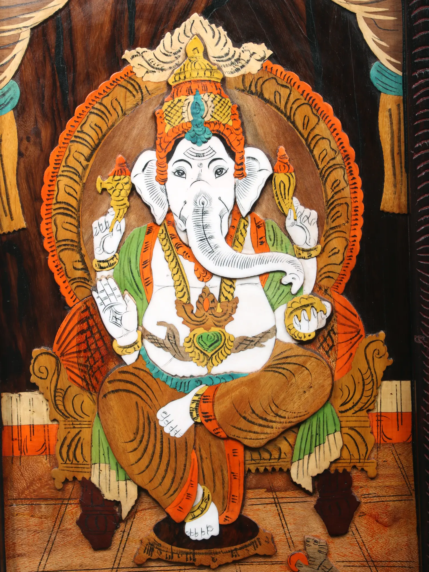 30" Lord Ganapati On Throne | Natural Color On 3D Wood Painting With Inlay Work