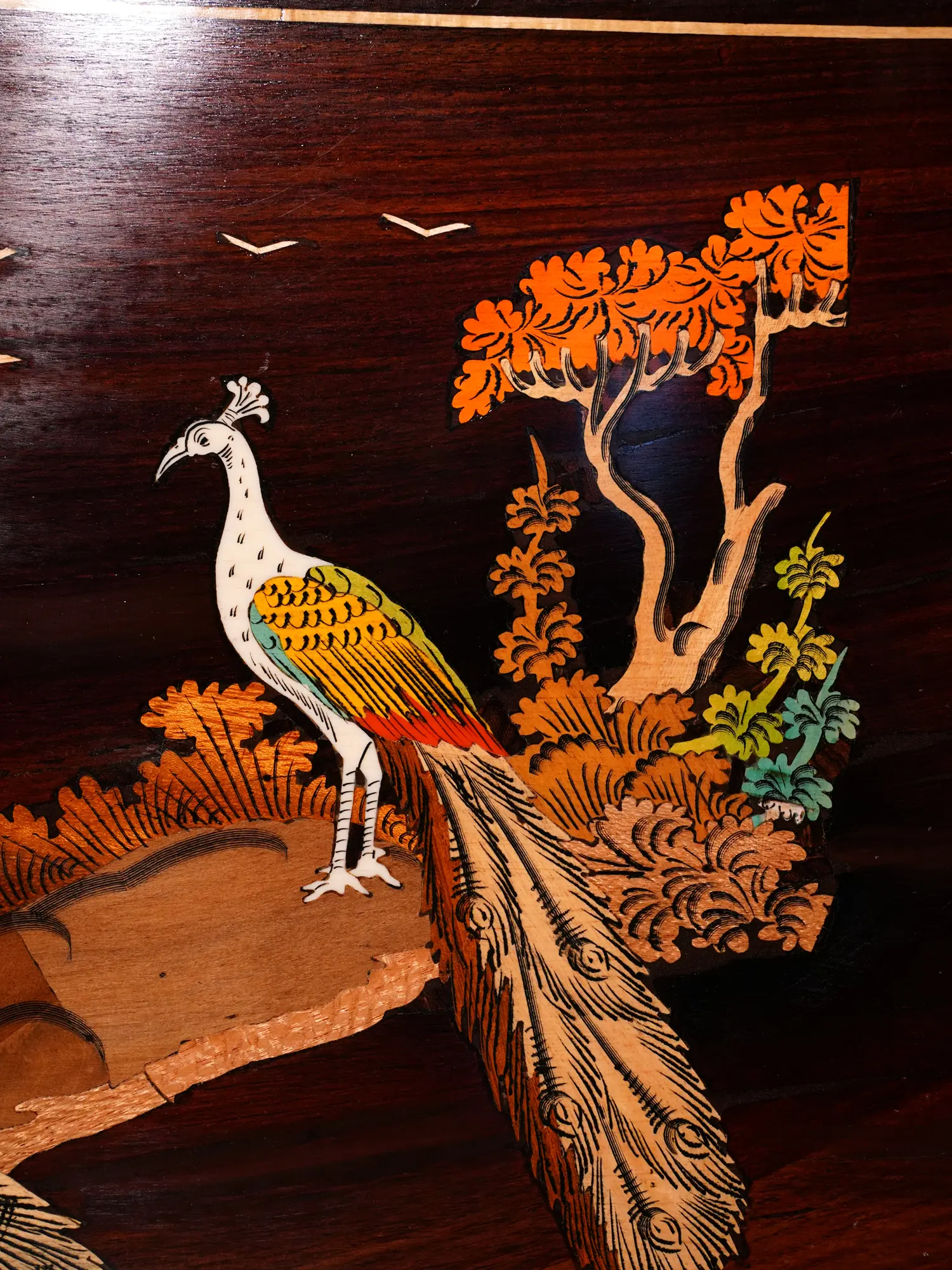 This piece is a beautiful example of Mysore inlay work, a traditional art form originating from the Mysore region of Karnataka, India. This intricate technique involves delicately embedding pieces of ivory, sandalwood, or other precious materials into a wooden base to create stunning designs. The level of precision and skill required to execute such detailed work is truly remarkable. It's a technique passed down through generations of artisans, preserving a rich heritage of artistic expression. The rich, dark wood of the base provides a dramatic contrast to the vibrant colors of the peacocks and foliage, enhancing the overall visual impact of the artwork. The careful selection of materials and the meticulous execution of the inlay work demonstrate the dedication to quality and the desire to create a lasting impression.