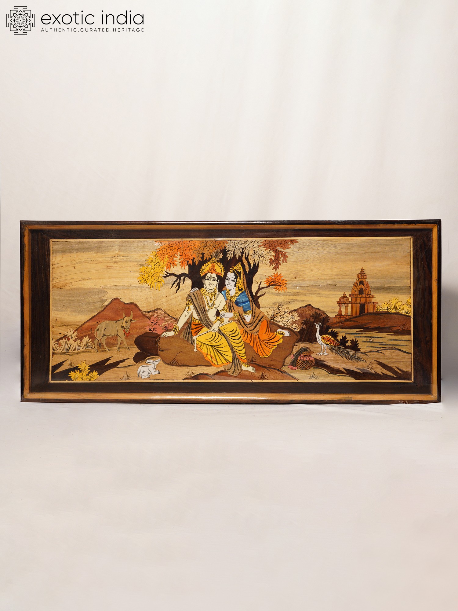 48" Divine Radha And Krishna In Vrindavan | Natural Color On 3D Wood Painting With Inlay Work
