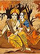 Depicted here is a scene of profound love and devotion: Radha and Krishna, the divine couple, seated together in tranquil harmony. The artistic expression captures the essence of their eternal bond, one that transcends earthly love and embodies the ultimate union of the soul with the divine. Krishna, the eighth avatar of Vishnu, known for his playful nature, divine wisdom, and enchanting flute, is often portrayed with Radha, symbolizing the epitome of love, devotion, and spiritual yearning. Their tale is woven into the very fabric of Indian culture, celebrated through countless songs, poems, and artistic representations. Radha, the embodiment of pure devotion (bhakti), is Krishna's beloved, and their relationship exemplifies the devotee's unwavering love for the divine. It's a love that's selfless, unconditional, and deeply personal. The intimacy shared between Radha and Krishna extends beyond the physical, encompassing a profound spiritual connection that inspires countless hearts. Their presence together is often portrayed in idyllic settings, reminiscent of Vrindavan, where Krishna spent his childhood, surrounded by lush greenery, playful animals, and the sweet melodies of nature.