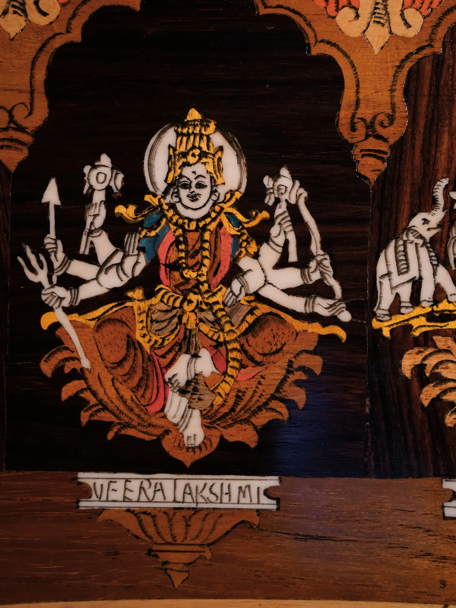 This exquisite wooden panel presents a harmonious tableau of the Ashta Lakshmi, the eight manifestations of the Hindu Goddess Lakshmi, who embodies wealth, fortune, love, and prosperity. Each form of Lakshmi is meticulously depicted in natural colors, carefully inlaid into the wood, showcasing the rich artistic heritage of Mysore craftsmanship. The panel provides not only a beautiful visual, but also an auspicious presence, bringing blessings of abundance and well-being to its surroundings. Each of the eight Lakshmis is enshrined in a carved archway. From left to right, they are: *
