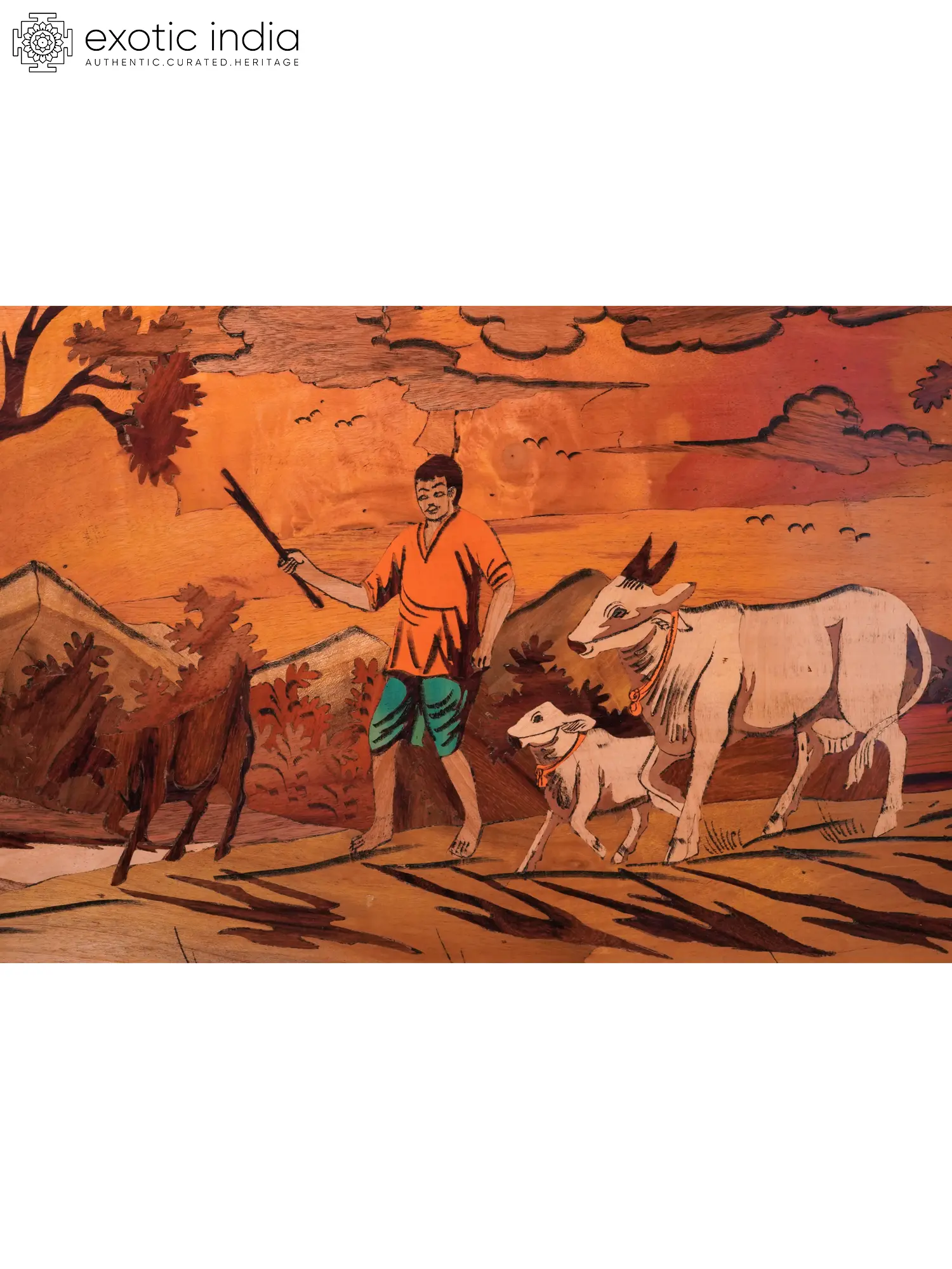 31" Farmer With Cows - Village Life | Natural Color On Wood Panel With Inlay Work