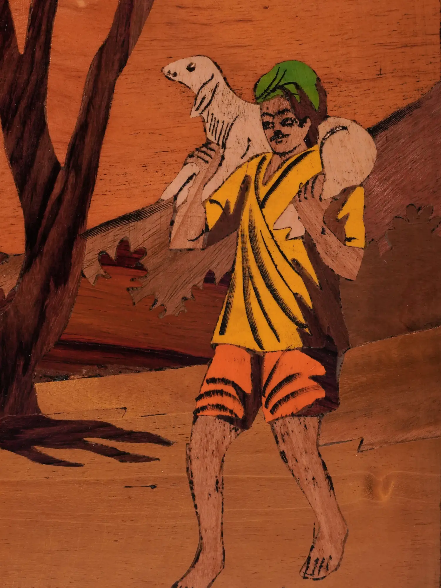 This exquisite wooden panel offers a window into the heart of rural life. Rendered with the meticulous art of Mysore inlay, the scene unfolds with a captivating naturalism. A farmer, staff in hand, guides his cattle, accompanied by a loyal dog, through a landscape of rolling hills and serene water bodies. In the background, another villager carries his goods, completing the pastoral tableau. The warm, earthy tones of the wood create a sense of tranquility and connection to the land, capturing the essence of a simpler, more harmonious existence. The artistry and attention to detail bring the entire scene to life, inviting you to step into this idyllic setting.