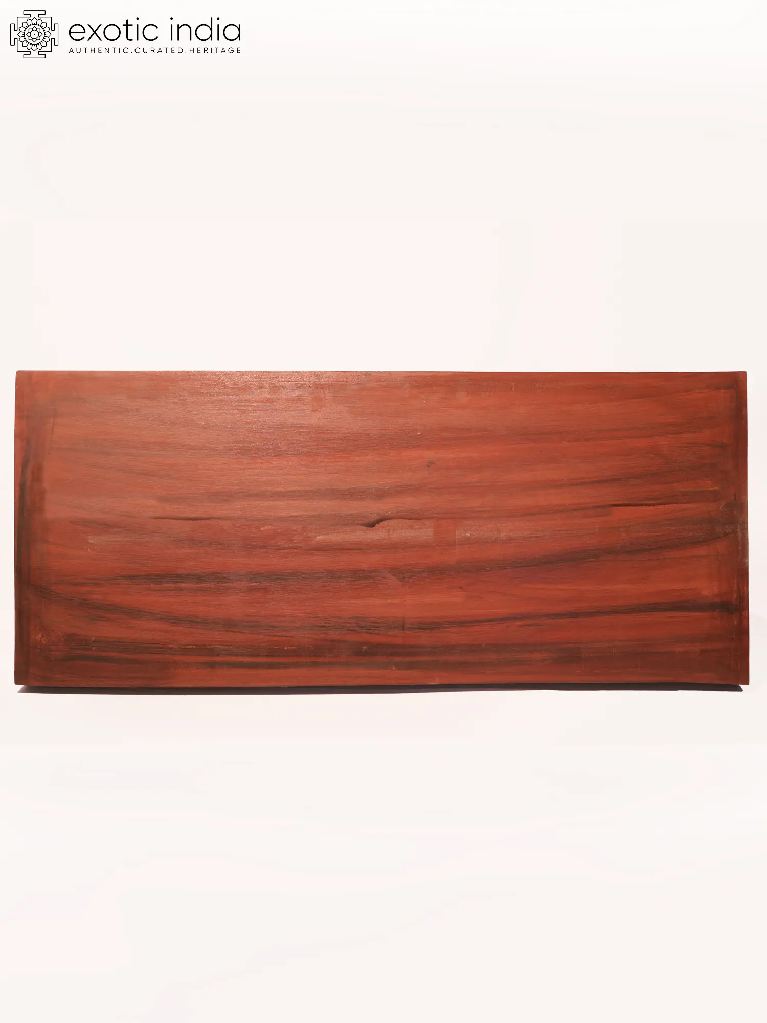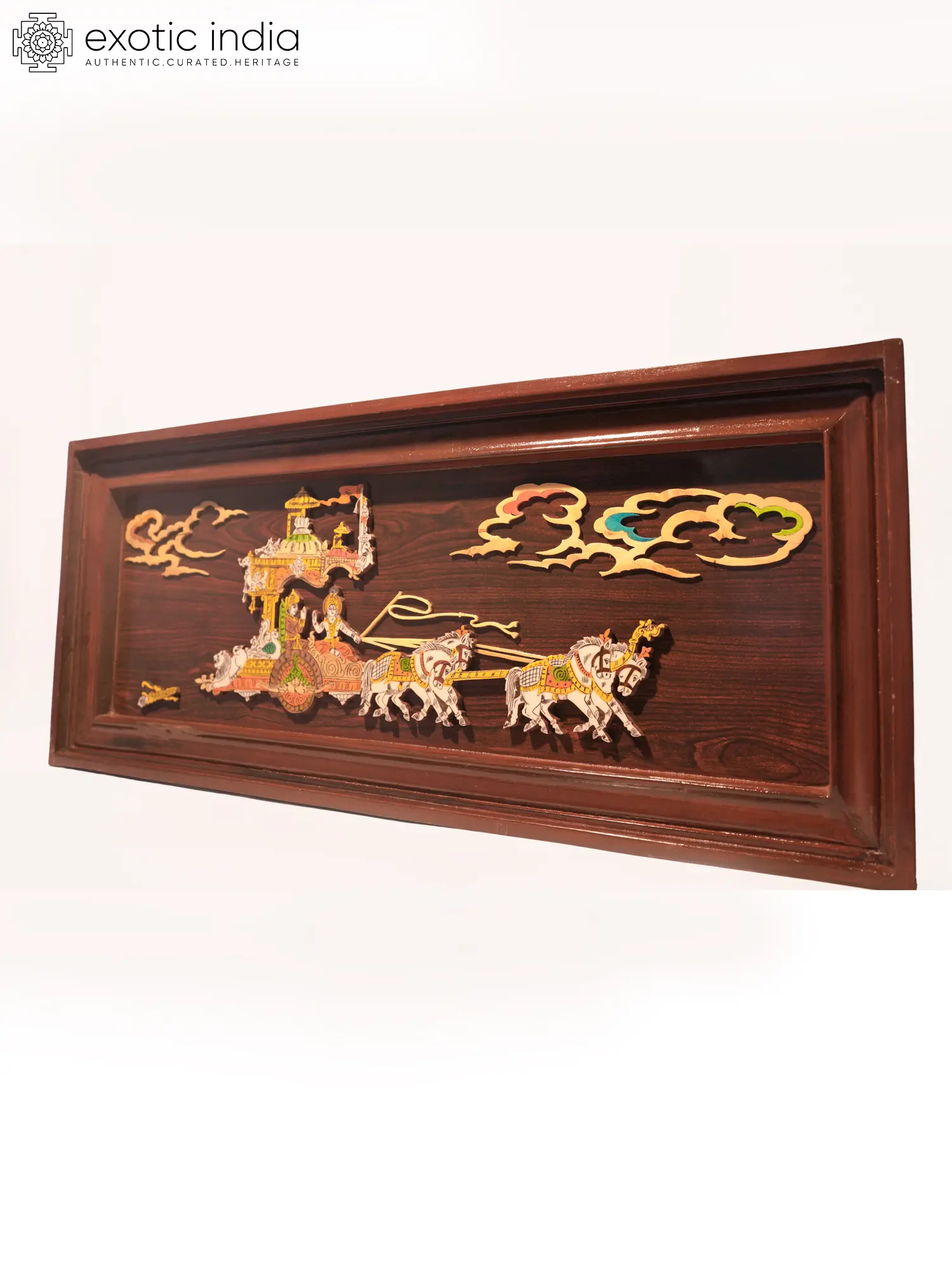 Witness the pivotal moment on the battlefield of Kurukshetra immortalized in this stunning wooden panel. The scene depicts Lord Krishna, the divine charioteer, imparting profound wisdom to Arjuna, the valiant warrior, on the eve of the epic Mahabharata war. The dialogue between them, famously known as the Bhagavad Gita, forms the essence of Hindu philosophy, exploring themes of duty, dharma, and the nature of reality. Every glance at this artwork serves as a potent reminder of this sacred discourse and its timeless relevance. The panel is crafted with intricate detail, showcasing the artistry of skilled artisans. The three-dimensional effect brings the characters to life, capturing the intensity of the moment and the depth of their relationship. Lord Krishna, with his serene countenance and commanding presence, guides Arjuna towards his righteous path. The horses pulling their chariot, also are depicted very realistically with intricate detailing.