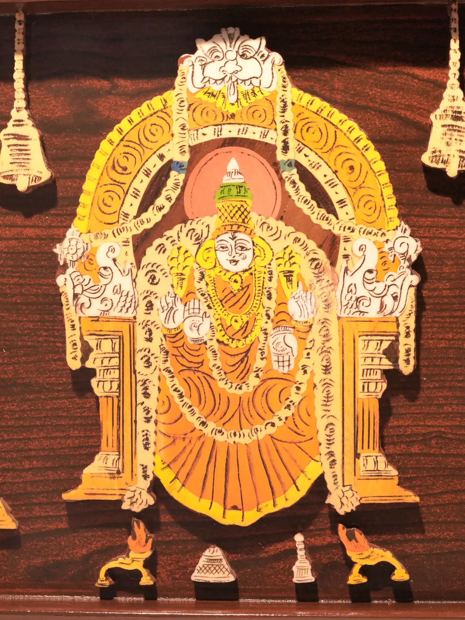 This stunning wooden panel is a devotional artwork, carefully crafted to capture the divine presence of Lord Balaji, also known as Venkateshwara, and his consort, Goddess Padmavati. This traditional art form has deep roots in South Indian culture, specifically linked to the sacred temple town of Tirupati, Andhra Pradesh, where Lord Venkateshwara's principal shrine stands as a beacon of faith and devotion. This piece serves not only as an aesthetic addition to your space, but also as a potent symbol of prosperity, love, and divine grace.
