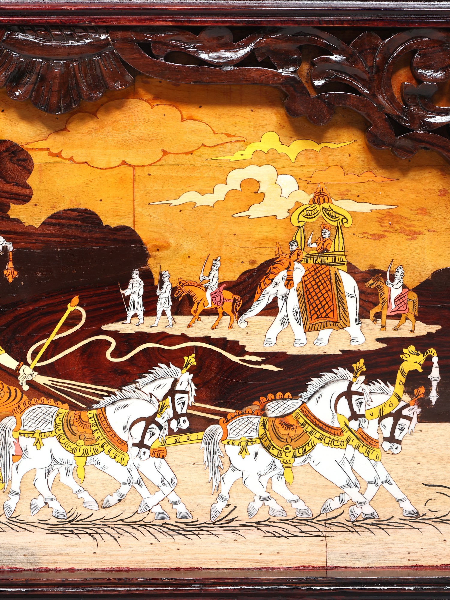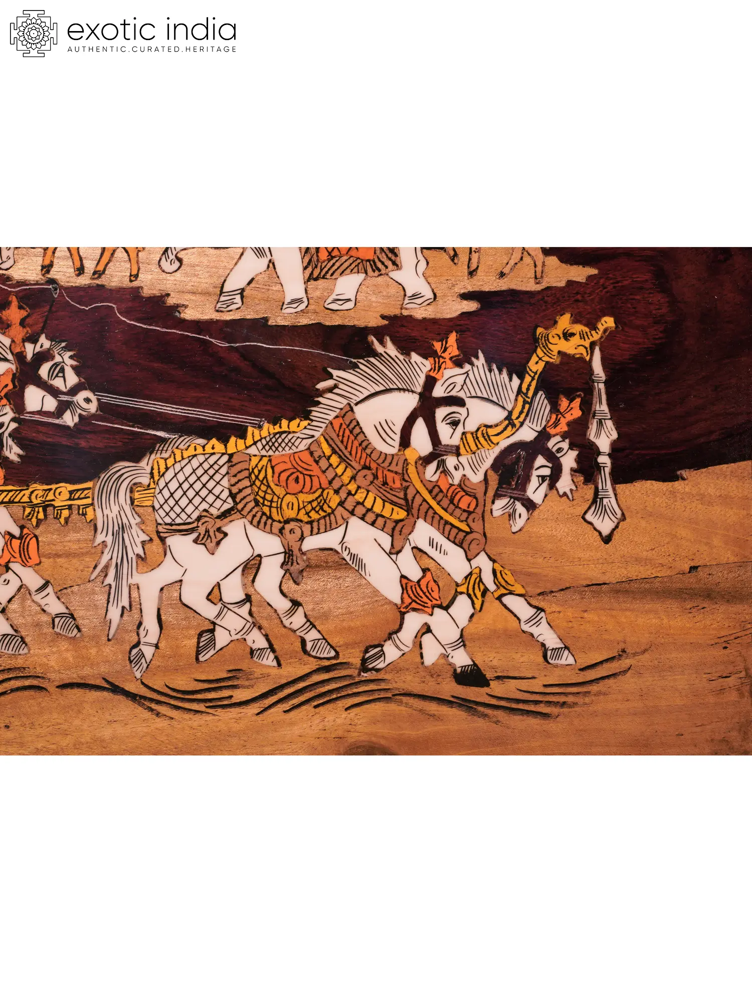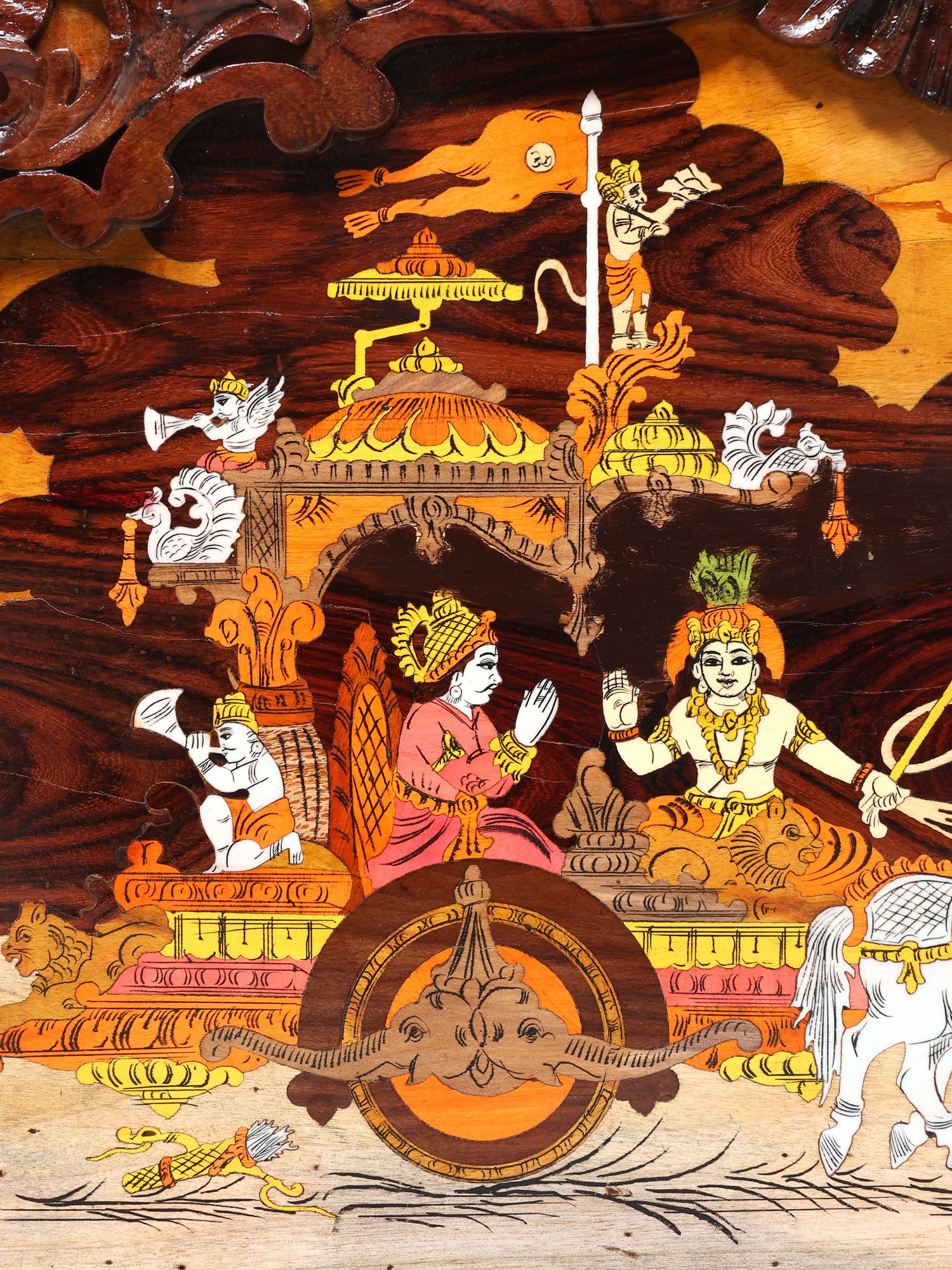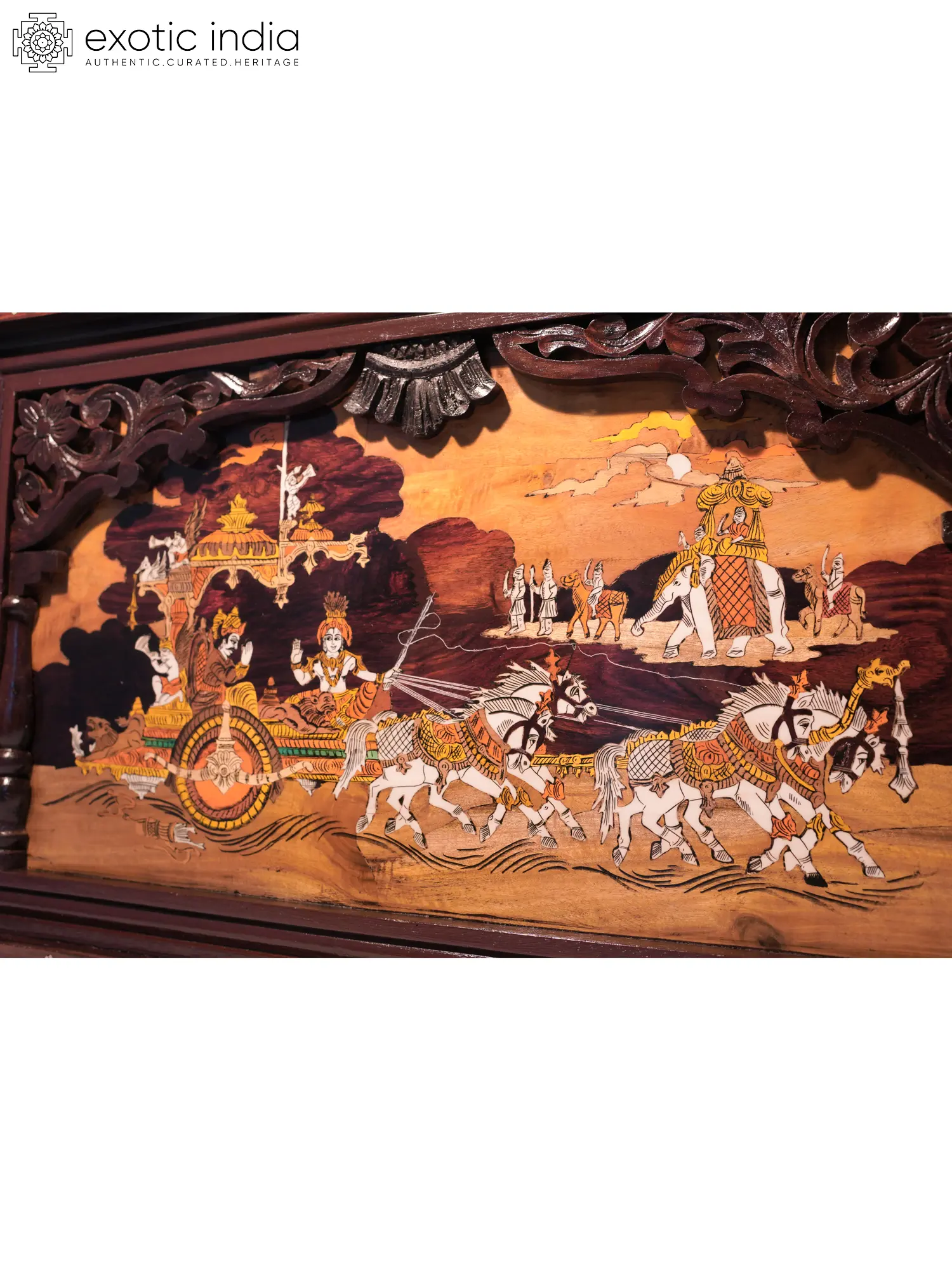 Created using the traditional art of Mysore wooden inlay, this panel is a testament to skilled craftsmanship. The natural colors of the wood are carefully chosen and meticulously arranged to bring the scene to life, enhancing the drama and emotion inherent in the epic tale. The intricate inlay work adds depth and texture, creating a piece that is both visually stunning and rich in cultural significance. The border surrounding the central panel features delicate carving, enhancing the artwork with a touch of traditional elegance. The use of natural colors allows the wood's inherent beauty to shine through, creating a warm and inviting piece of art. Mysore inlay work is a centuries-old art form originating from the region of Mysore in Karnataka, India. It involves carefully embedding small pieces of wood, ivory, or other materials into a wooden base to create intricate designs. The process requires precision and skill, as each piece must be perfectly fitted to create a seamless and visually stunning finished product. This piece will bring a sense of history, spirituality, and artistic beauty to any space, and serve as a reminder of the timeless lessons contained within the Mahabharata.