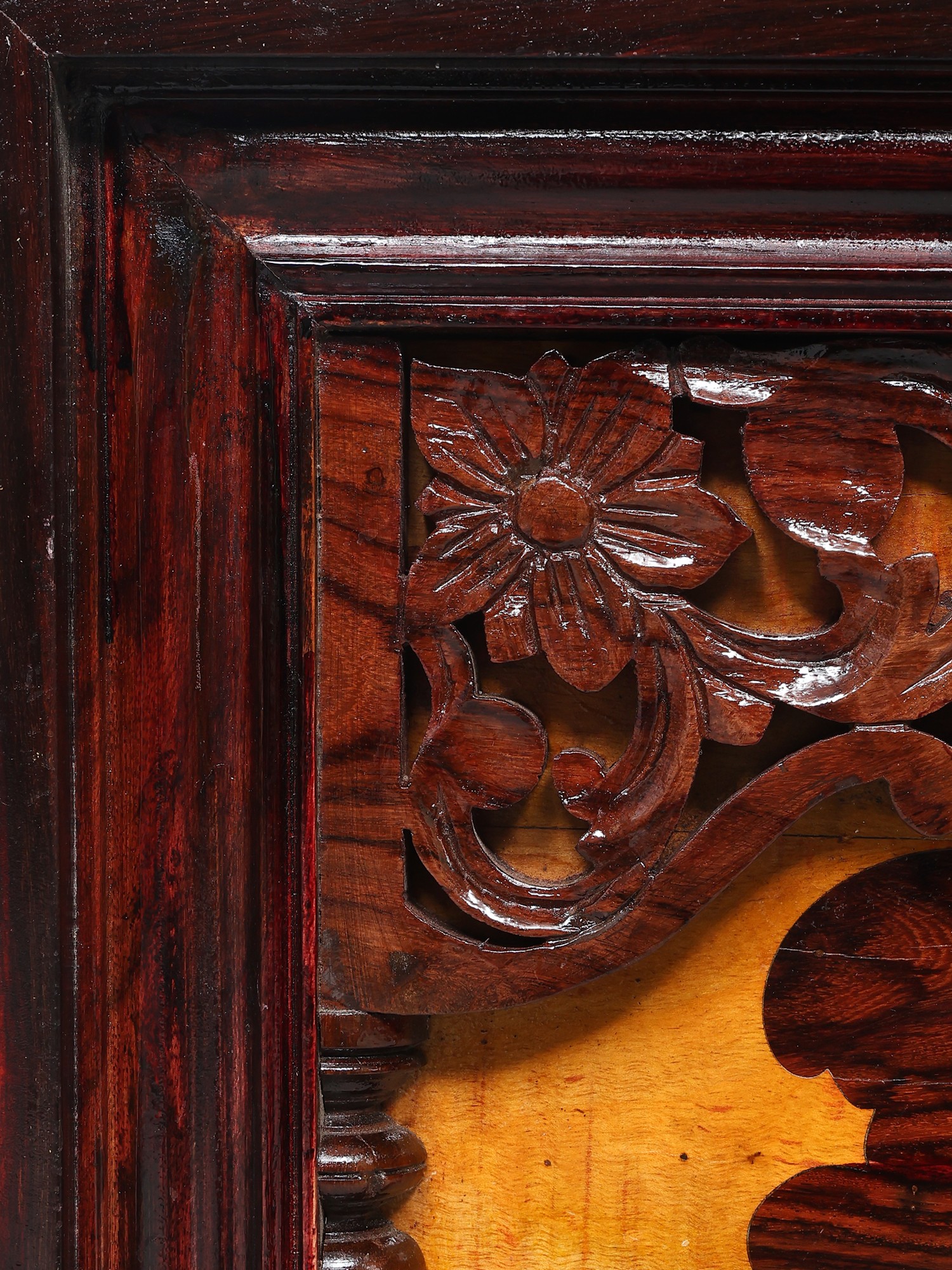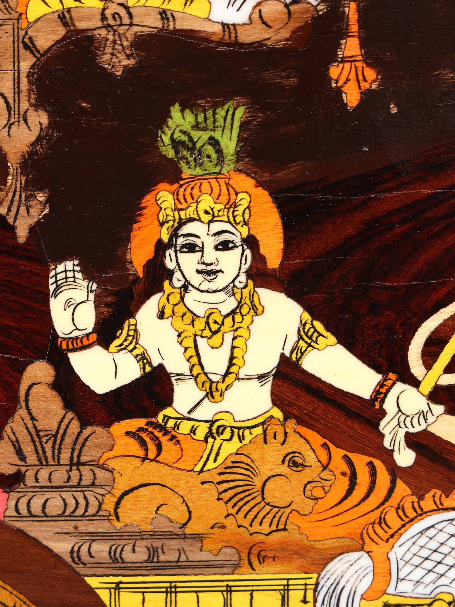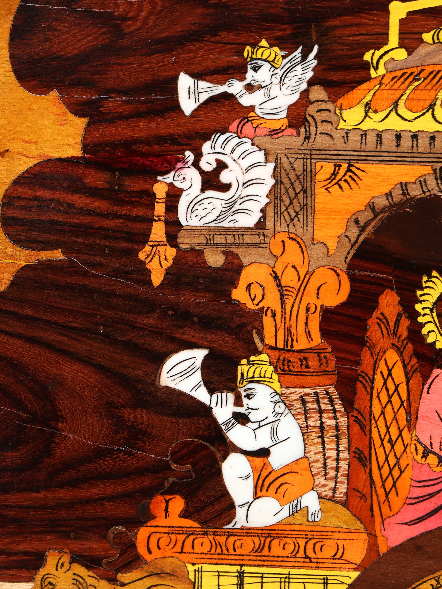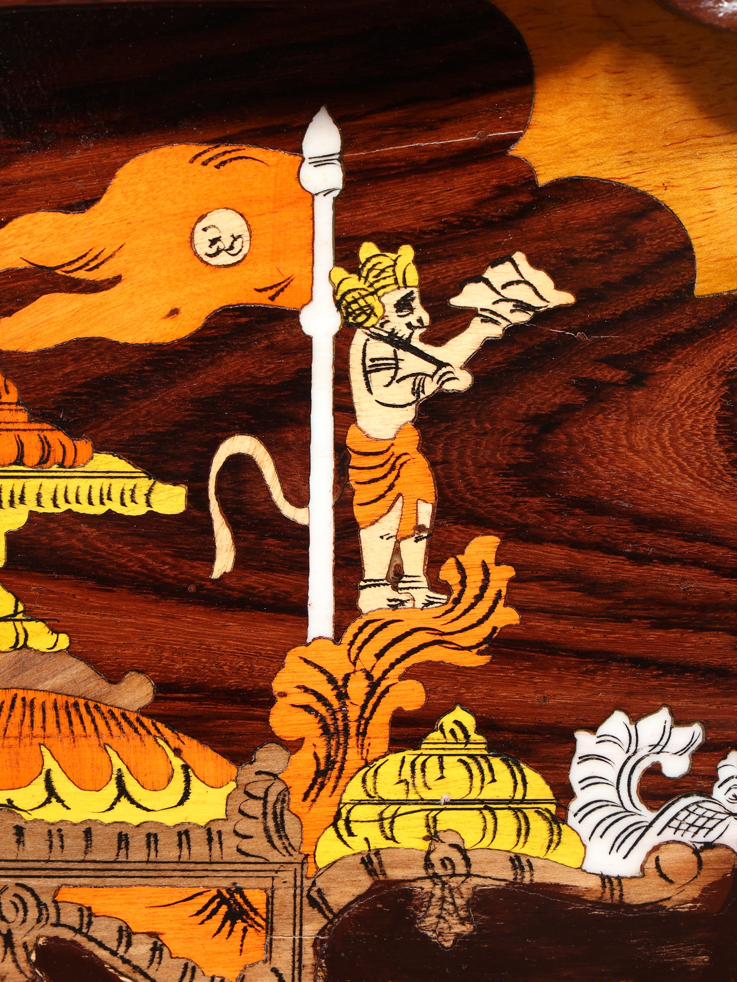 Created using the traditional art of Mysore wooden inlay, this panel is a testament to skilled craftsmanship. The natural colors of the wood are carefully chosen and meticulously arranged to bring the scene to life, enhancing the drama and emotion inherent in the epic tale. The intricate inlay work adds depth and texture, creating a piece that is both visually stunning and rich in cultural significance. The border surrounding the central panel features delicate carving, enhancing the artwork with a touch of traditional elegance. The use of natural colors allows the wood's inherent beauty to shine through, creating a warm and inviting piece of art. Mysore inlay work is a centuries-old art form originating from the region of Mysore in Karnataka, India. It involves carefully embedding small pieces of wood, ivory, or other materials into a wooden base to create intricate designs. The process requires precision and skill, as each piece must be perfectly fitted to create a seamless and visually stunning finished product. This piece will bring a sense of history, spirituality, and artistic beauty to any space, and serve as a reminder of the timeless lessons contained within the Mahabharata.