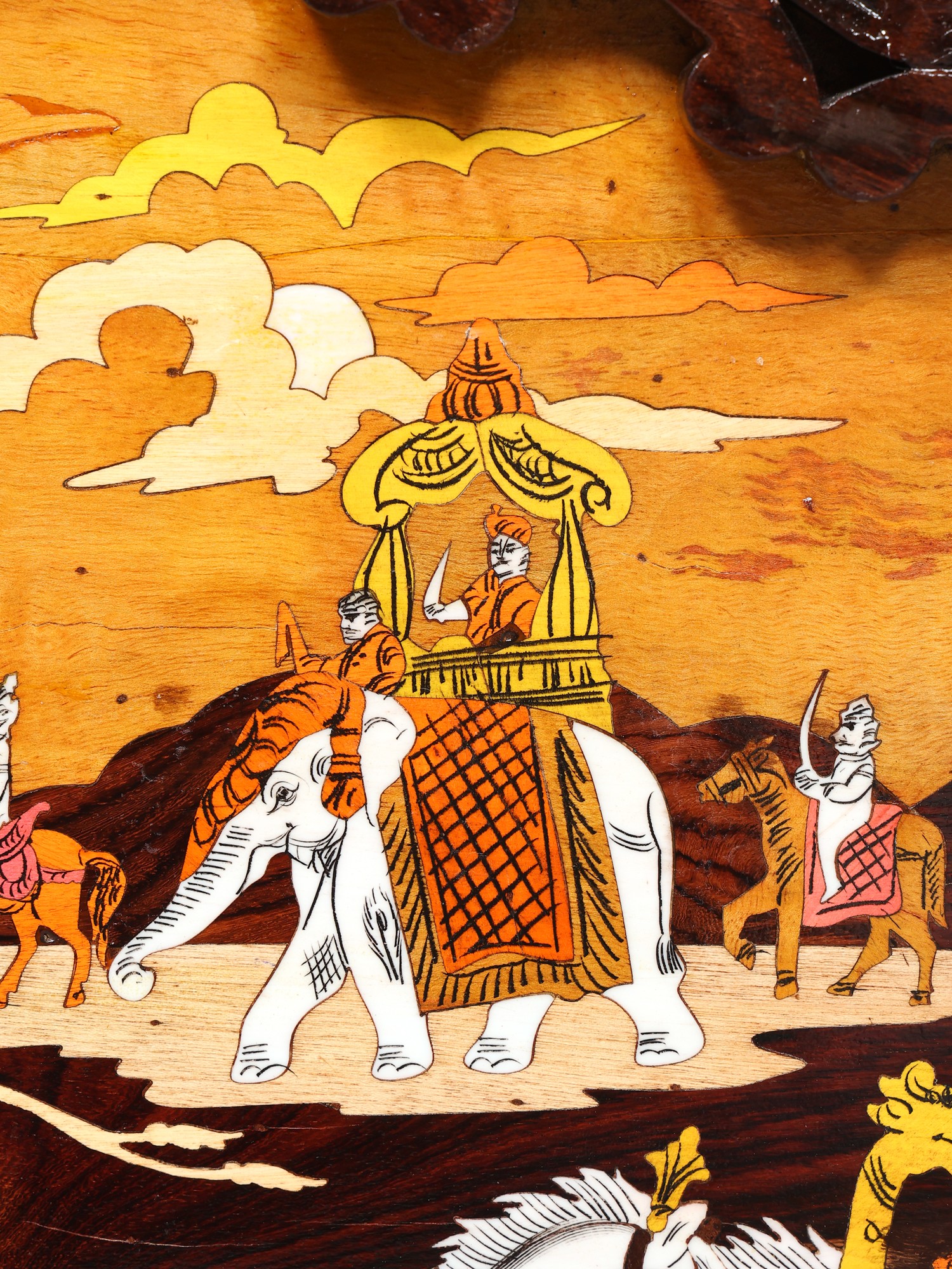 Wood inlay is a historically significant art form from the 18th century. It arrived in India through Srirangaptnam in Mysore from Persia but has become an inevitable part of the Indian heritage. Tipu Sultan and the Wodeyars/Wadiyars are credited with the growth of this 400-year-old art form in Mysore and its neighboring areas. Wood inlay work is usually done on a Mysore rosewood base, and other woods are used, like mango, kadam, jackfruit, rubber, doodhi, etc. Pieces of wood are adorned with beautiful motifs and patterns made from various materials. From wall hangings and paintings to jewelry boxes and furniture, many items are made using the Mysore wood inlay technique. An outline is etched on a piece of rosewood with a sharp tool. Then, the area inside the outline is hollowed out, and materials like lacquer, enamel, contrasting wood, and sometimes even gold and silver are placed inside it. A sandpaper is used to give a smooth finish to the surface.