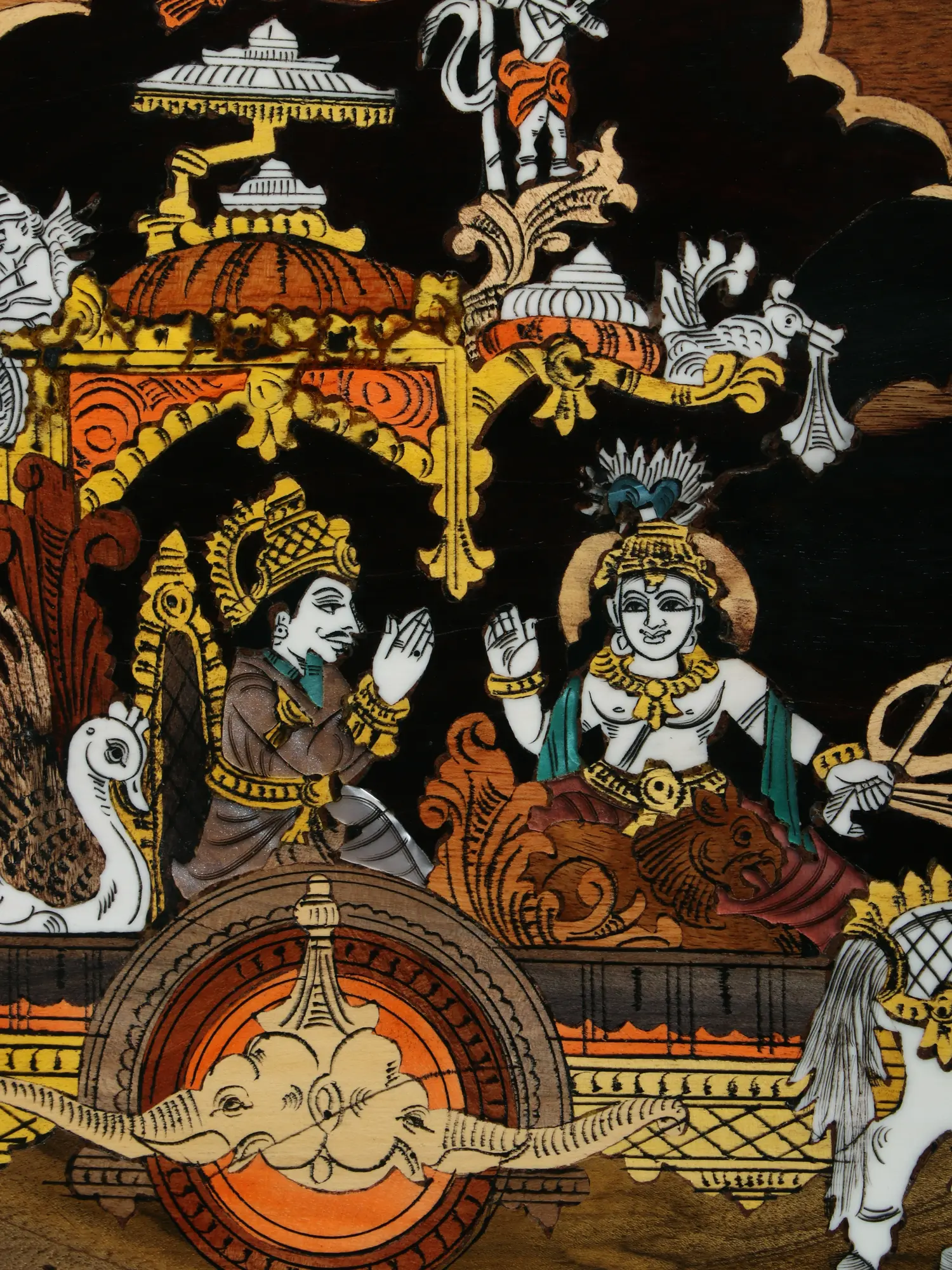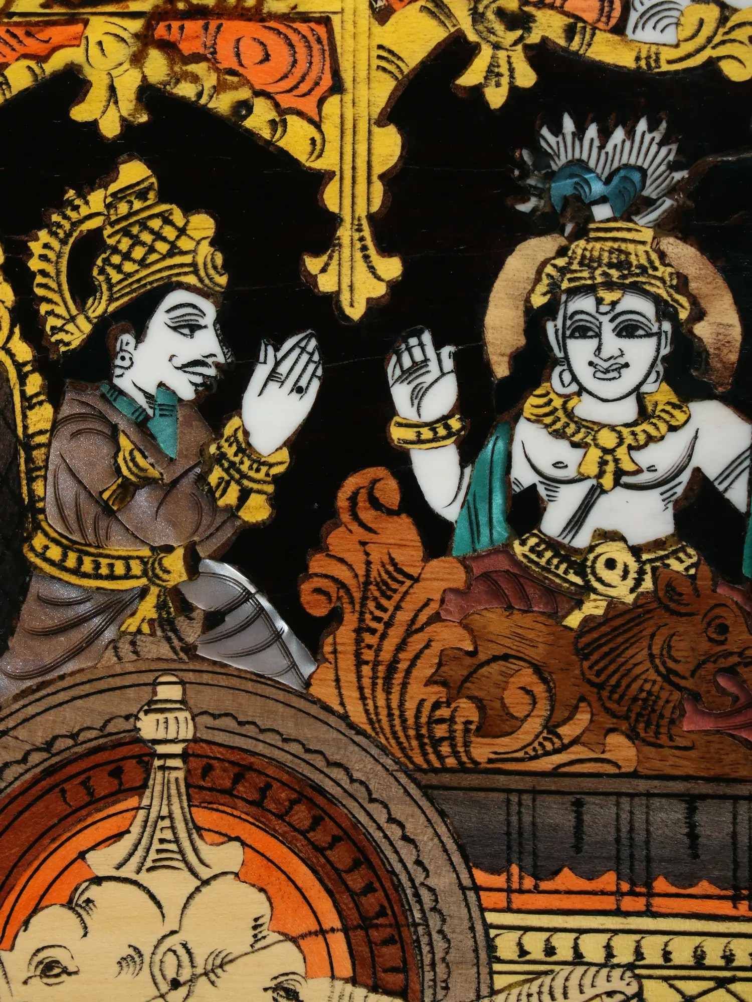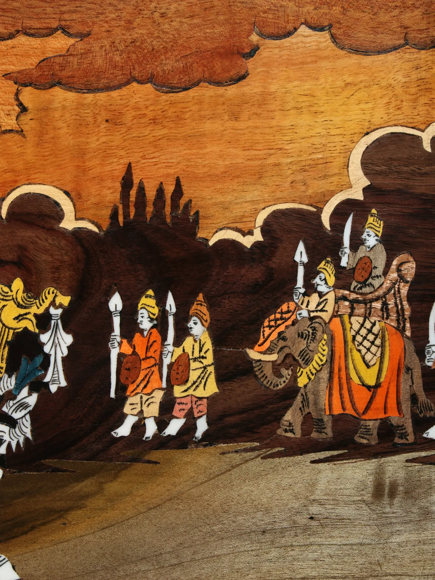 Crafted by artisans whose lineage traces back to generations of skilled craftsmen, this work showcases the revered Mysore tradition of wood inlay painting. Each element is meticulously shaped and placed using natural colors derived from earthly pigments, creating a rich, organic palette. The natural wood panel itself serves as a canvas, its grain and texture enhancing the depth and narrative of the scene, while the inlay work adds a dimension of tactile and visual luxury.