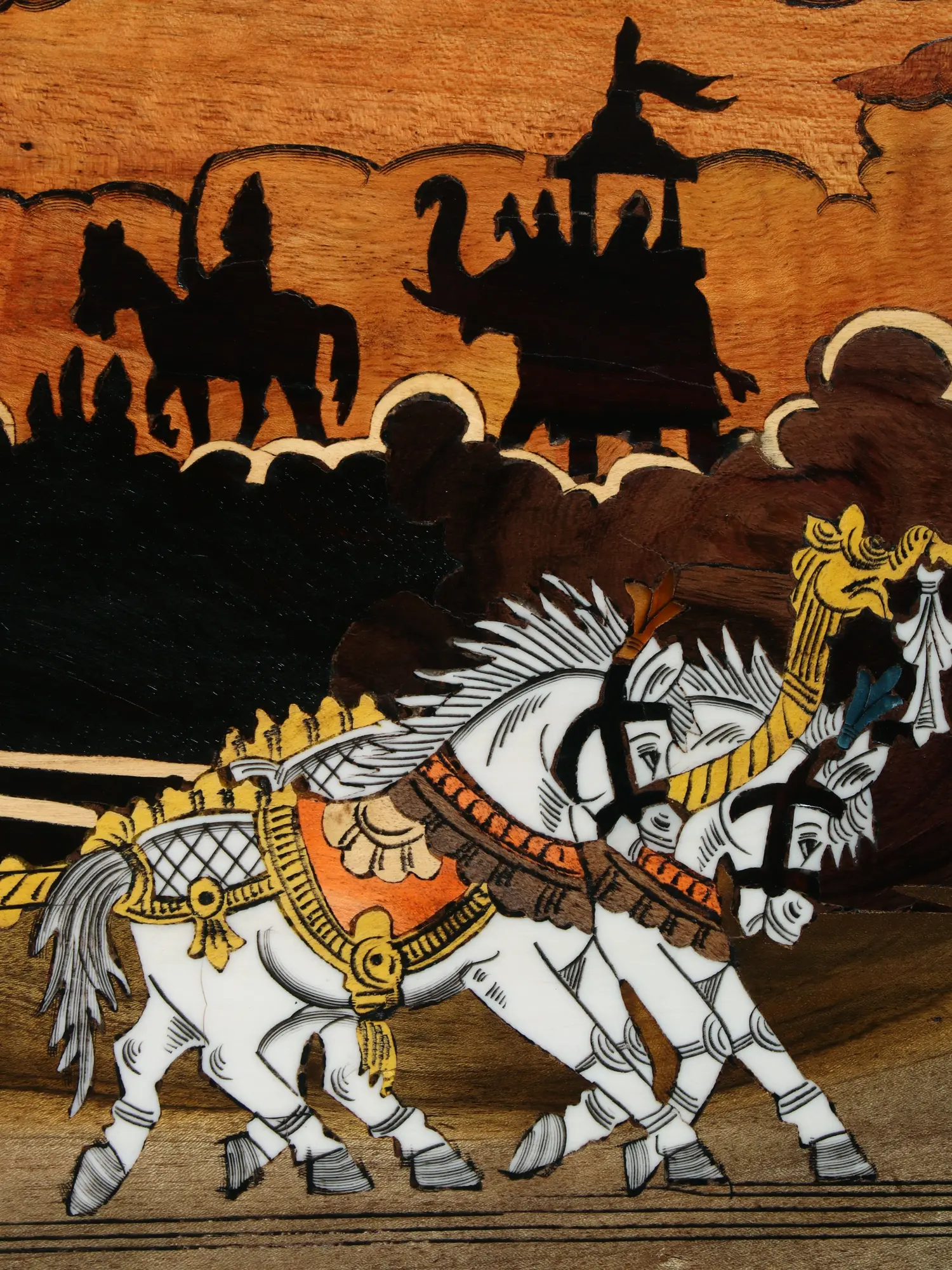 Observe the dynamic composition stretching across a generous 31.2 inches in width, offering a panoramic view of this epic scene. The figures, horses, and chariots are rendered with remarkable detail, each stroke and inlay conveying movement and character. The rich brown of the surrounding wood frame elegantly complements the scene, highlighting the vibrant natural colors and delicate inlay work that make this piece truly exceptional. The depth of the piece, at just 1 inch, allows it to be gracefully integrated into any space.