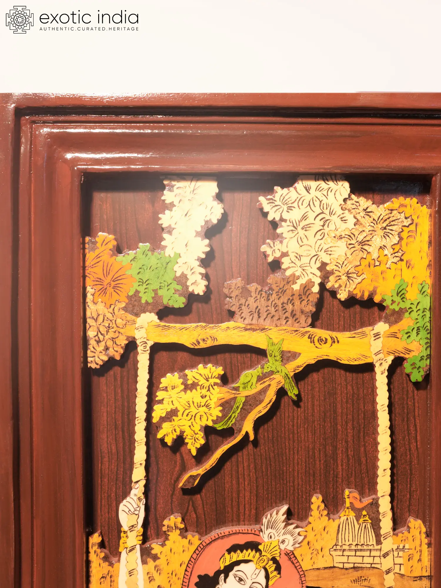 Immerse yourself in the enchanting world of Radha and Krishna with this exquisitely crafted wooden panel. More than just a piece of art, it's a window into the eternal love story that resonates deeply within Hindu mythology. Observe the charming detail in which the divine couple is represented as their love story is a celestial romance and the subject of myriad devotional songs, poems, and artistic expressions. Their relationship embodies the purest form of love – selfless, unconditional, and divine. The intricate detailing evokes a sense of timeless beauty and grace. Note the swing which has been a symbol of romance and youthful delight for centuries and represents the playful spirit of Krishna's Vrindavan. This artwork seeks to capture the very essence of their bond, a connection that transcends the material realm.
