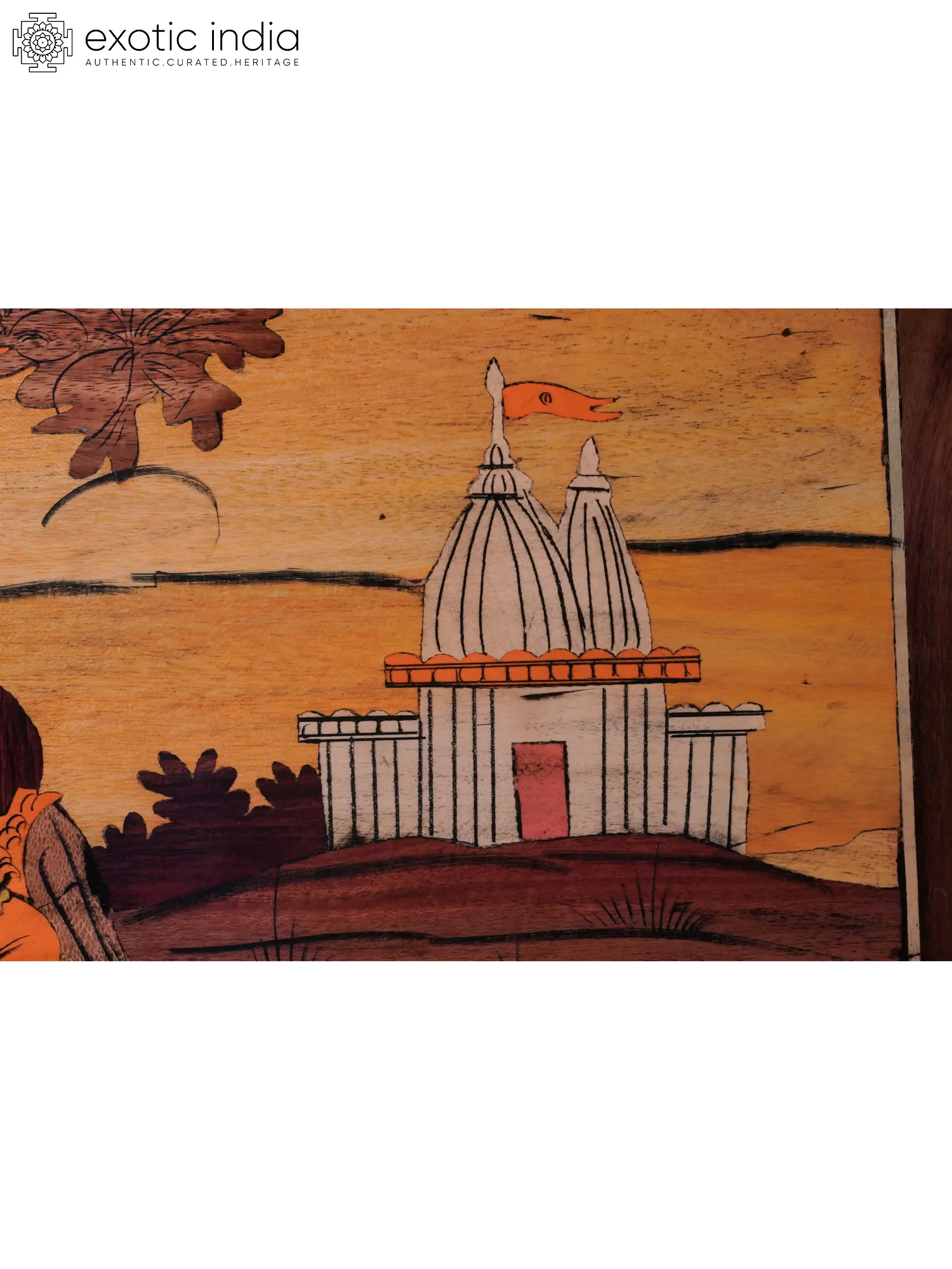 The scene is brought to life through intricate inlay work, a traditional art form that involves embedding different materials into the wooden surface. Each element, from the delicate features of Radha and Krishna to the intricate details of the temple, is meticulously crafted, showcasing the skill and dedication of the artisans. The natural color palette evokes a sense of warmth and tranquility, inviting the viewer to immerse themselves in the divine love and beauty of the scene. The wooden panel itself adds a touch of rustic charm, grounding the celestial scene in the earthly realm.