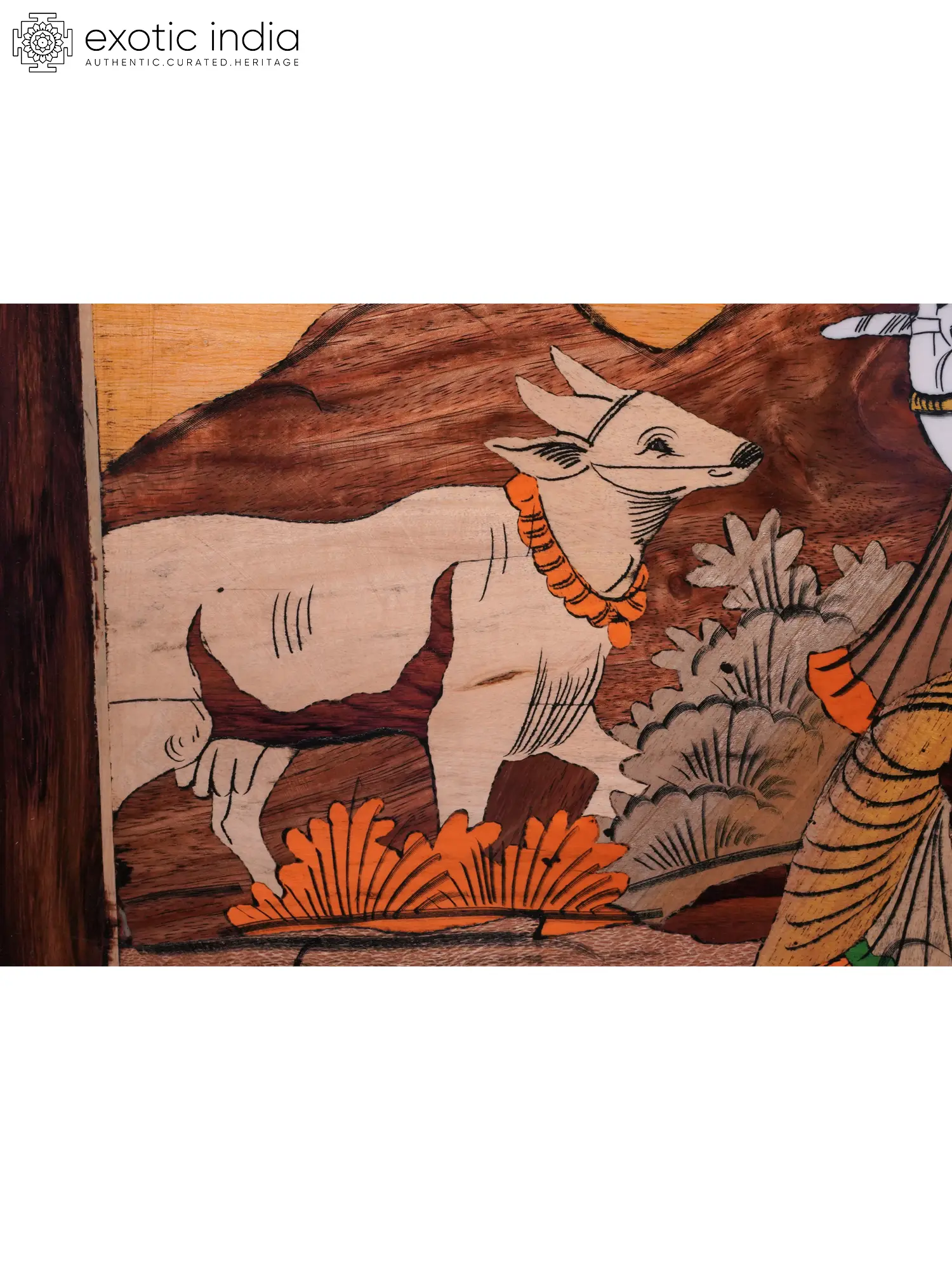 This stunning wooden panel depicts Radha and Krishna in a moment of serene communion, bathed in the warm hues of a setting sun. The scene unfolds on a wooden canvas, the natural colors enhancing the idyllic beauty of Vrindavan, the sacred land where their eternal love story blossomed. Krishna, the divine cowherd, plays his enchanting flute, its melodies weaving a spell of devotion and love. Radha, his eternal consort, sits beside him, her gaze filled with adoration, her presence radiating grace and serenity. A gentle cow, a symbol of abundance and purity, stands nearby, further enriching the pastoral setting. In the backdrop, a Hindu temple stands silhouetted against the horizon, its spires reaching towards the heavens, a testament to the enduring faith and devotion that surrounds the divine couple.