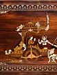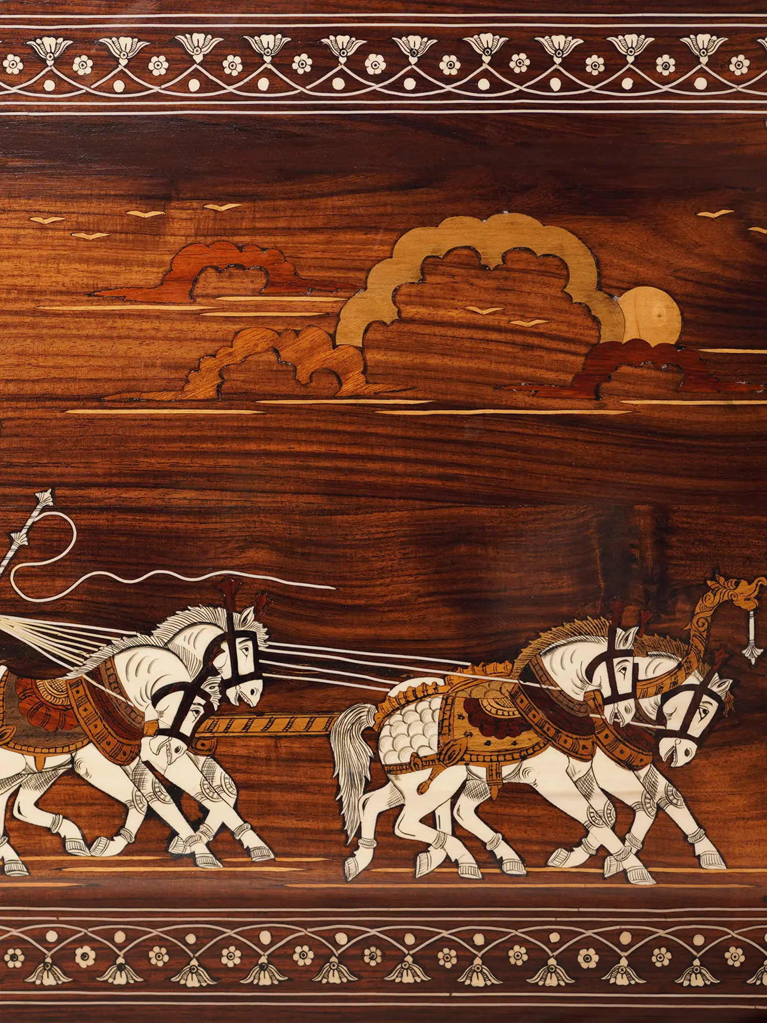 This panel is a testament to the exquisite craftsmanship of Mysore wooden inlay. This art form, with roots stretching back centuries, transforms ordinary wood into extraordinary masterpieces. Delicate pieces of contrasting materials are meticulously set into the rosewood, creating intricate patterns and vibrant imagery. The rosewood's rich, warm hues provide a captivating backdrop for the detailed inlay work, enhancing the overall visual impact. Each piece is carefully placed, reflecting the artisans' skill and dedication. The level of detail in this panel is truly remarkable. The expressions on Krishna and Arjuna, the regal trappings of the chariot, and the powerful steeds pulling it, all come alive through the delicate artistry. Even the surrounding scenery, with its stylized clouds and celestial figures, adds to the sense of otherworldly grandeur. The craftsmanship is not merely decorative; it is a narrative in itself, reflecting the sacred story. This panel stands as a testament to the enduring legacy of Mysore inlay, a legacy celebrated for its beauty, precision, and cultural significance.