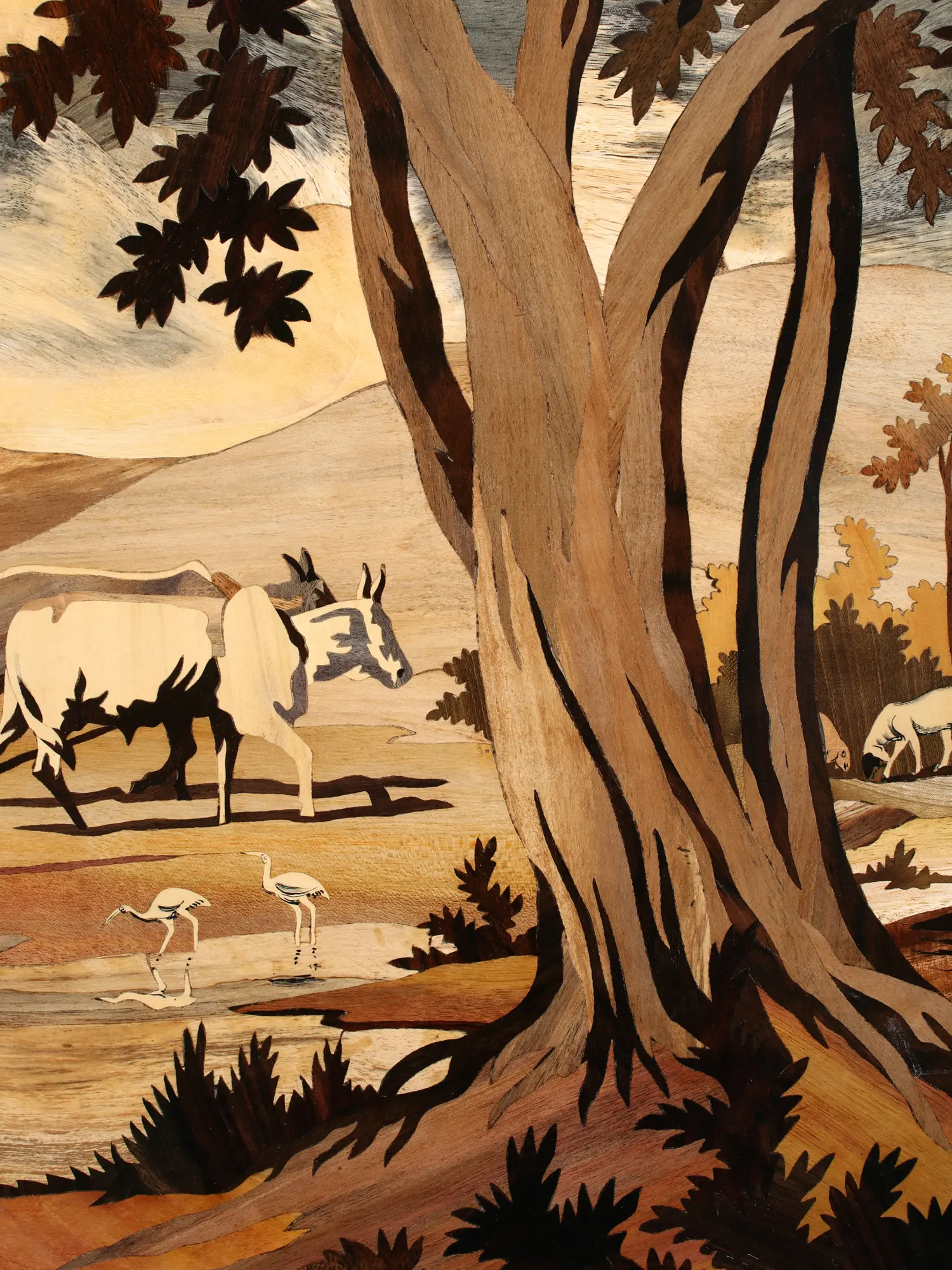 Immerse yourself in the tranquil beauty of pastoral life with this exquisite wooden inlay panel, a testament to enduring traditions and meticulous craftsmanship. It captures a timeless scene, inviting contemplation and a gentle appreciation for the rhythms of nature.