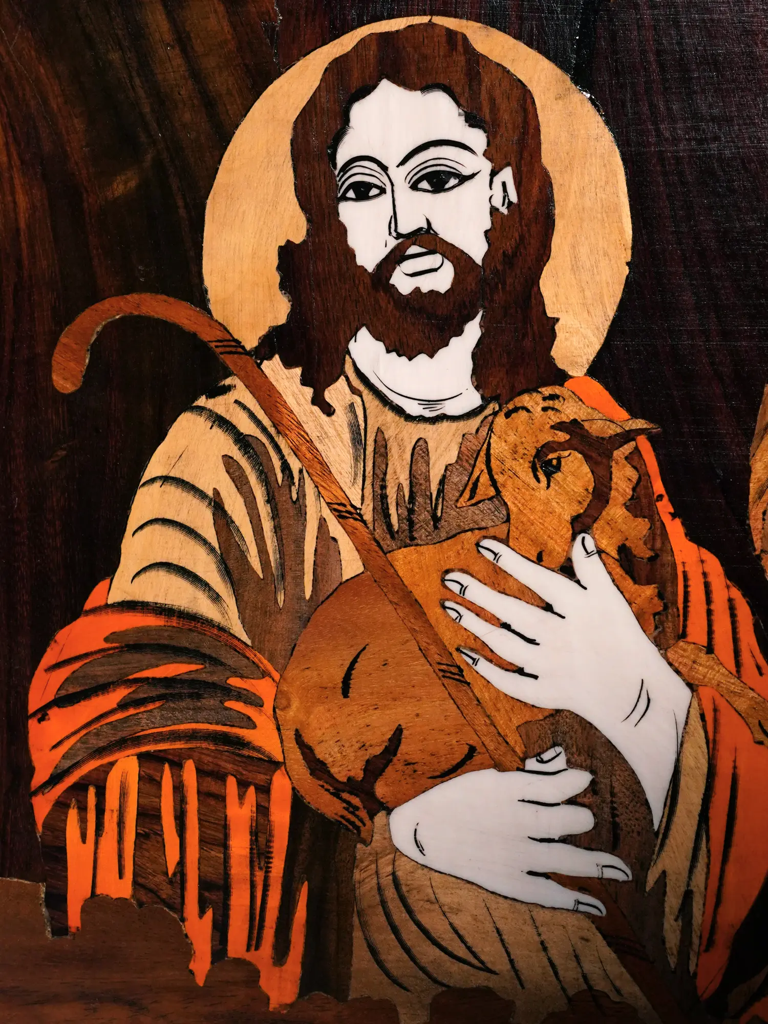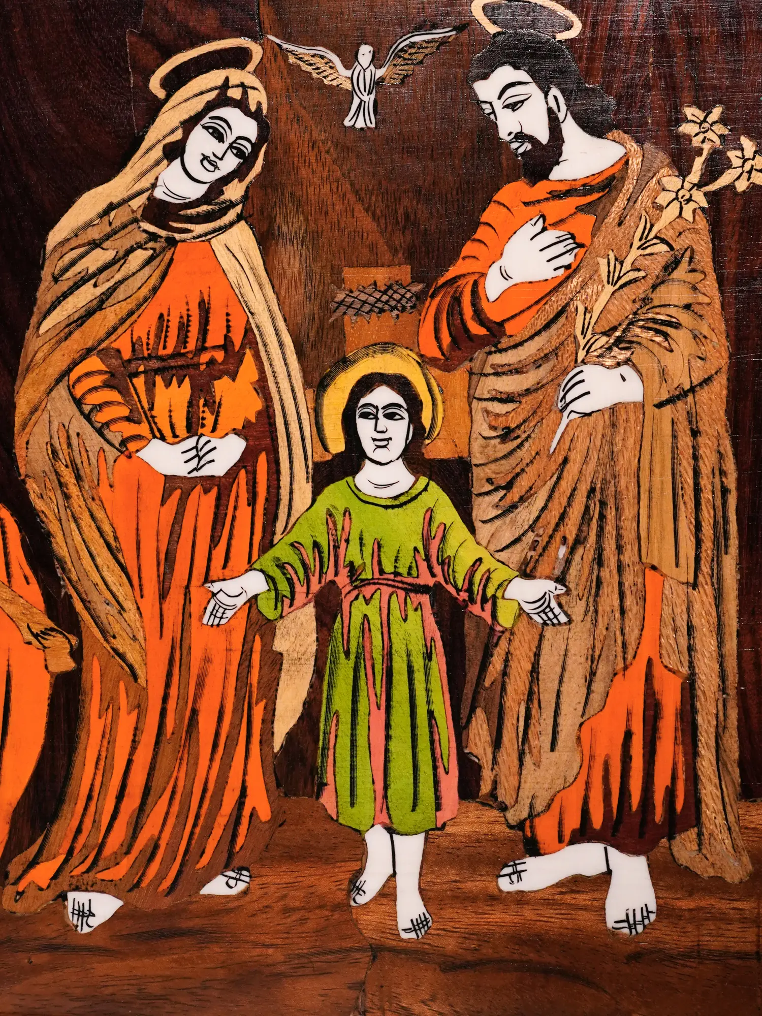 Crafted with meticulous detail, this wooden panel captures a series of poignant moments from the life of Jesus Christ. The artwork, rendered in natural colors, is brought to life through the intricate technique of wood inlay, showcasing the skill and dedication of the artisans. The scenes depicted invite contemplation and reflection on the teachings and significance of the Christian faith. Each character is thoughtfully represented, their expressions and gestures conveying a sense of peace, compassion, and divine purpose. The artistry displayed here is not merely decorative; it is a visual meditation on core Christian beliefs. It's an opportunity to bring the essence of faith into your living space or offer a meaningful gift that resonates with spiritual depth.