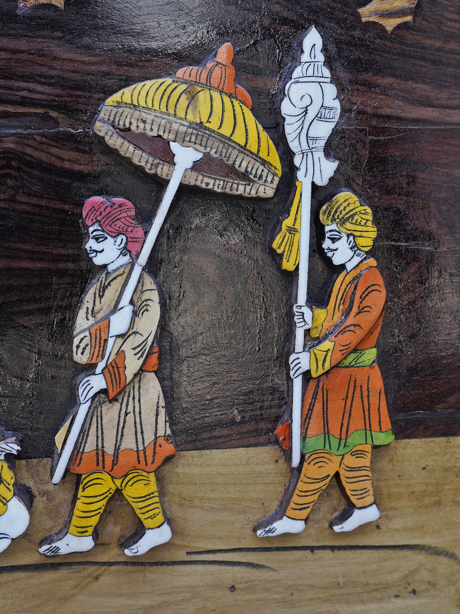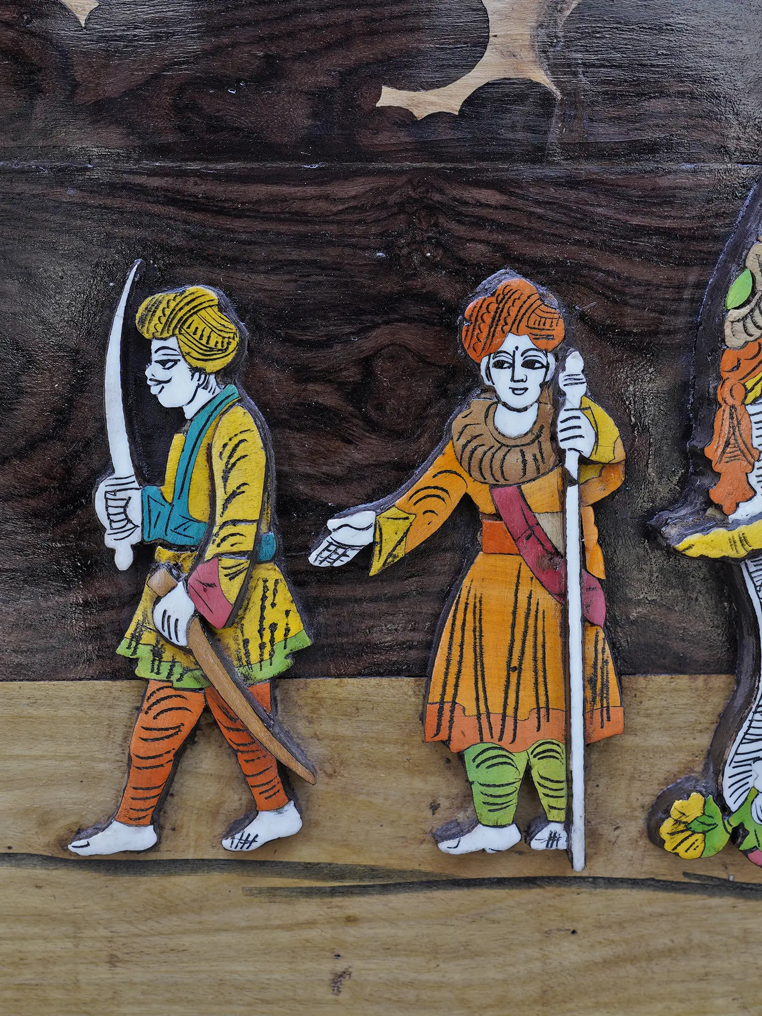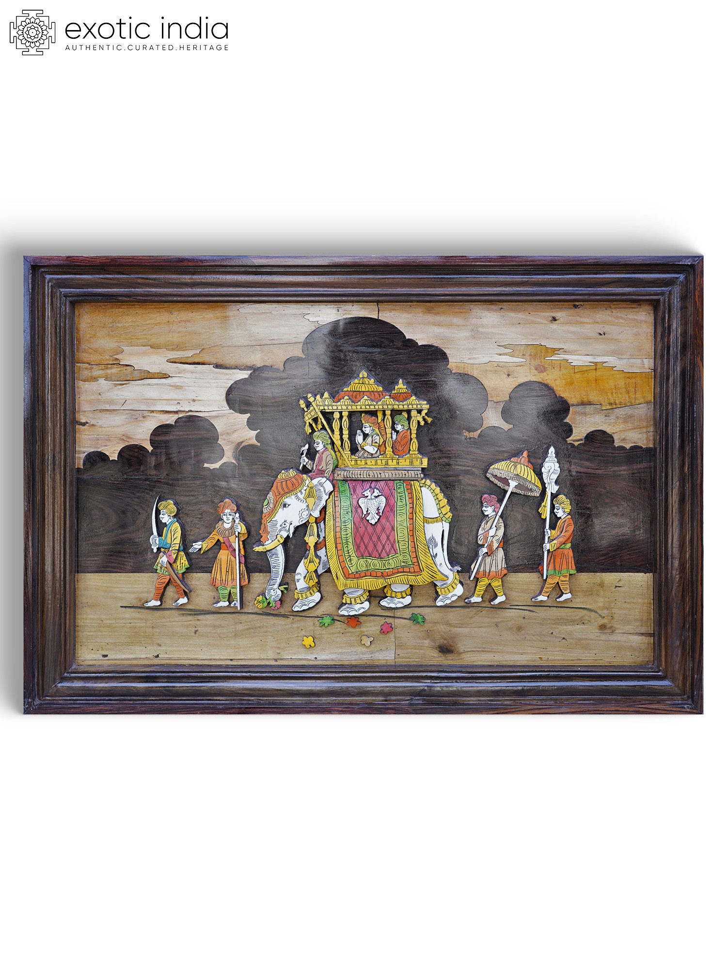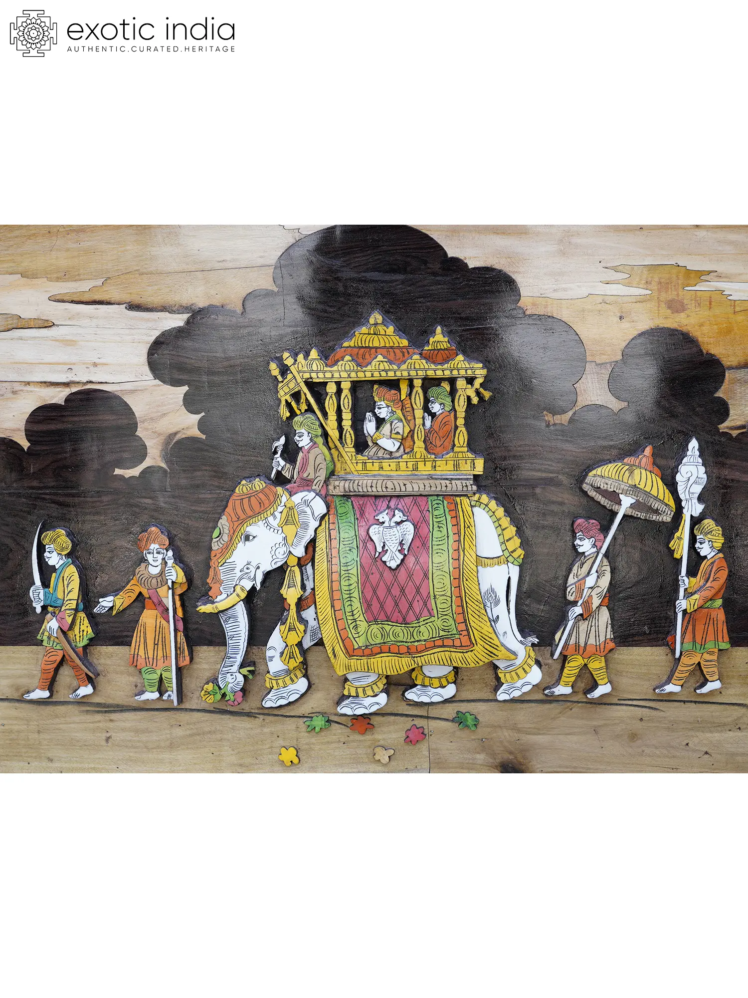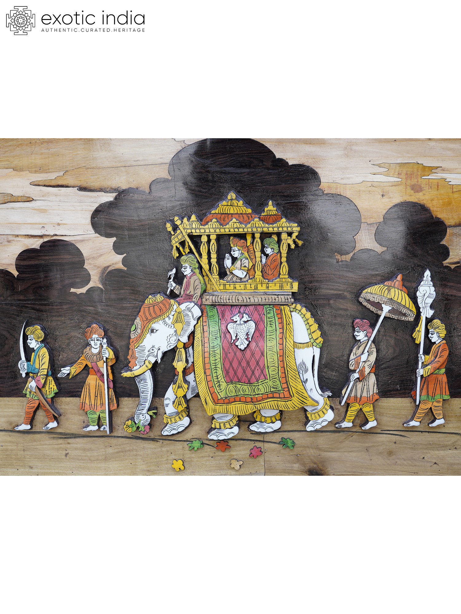 48" Royal Ride Of King On Elephant | Natural Color On Wood Panel With Inlay Work