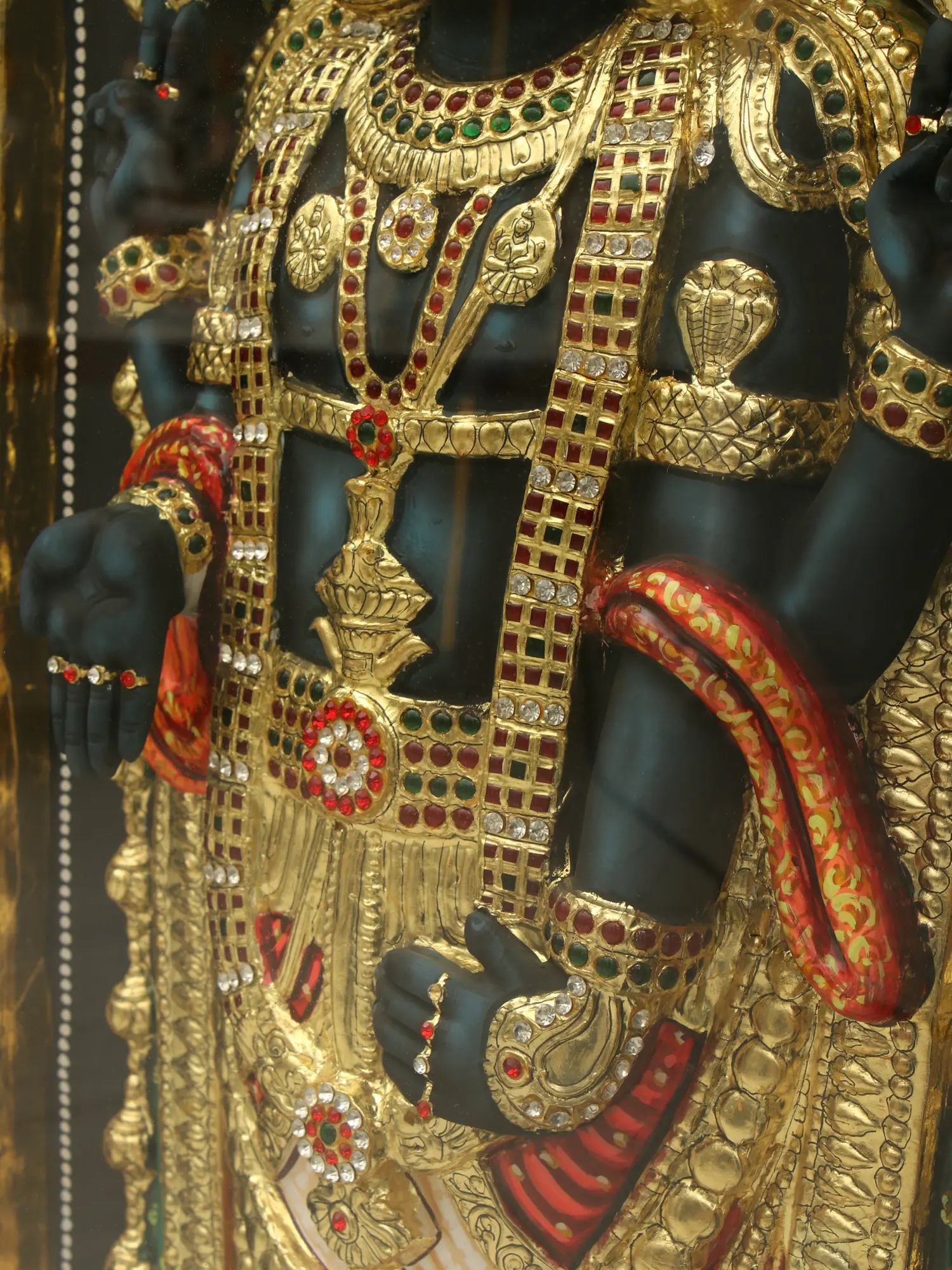 A masterpiece that captures the divine magnificence of Lord Venkateshwara— this resplendent Tanjore Painting adorned with lustrous gold leaf work, invites you to bask in the abundant grace of the Lord of Seven Hills. Swami Venkateshwara radiates an aura of celestial majesty and compassion, beckoning devotees into his divine presence. As it graces your abode, may it inspire you to embrace the abundance and blessings that flow from the Lord's divine presence.