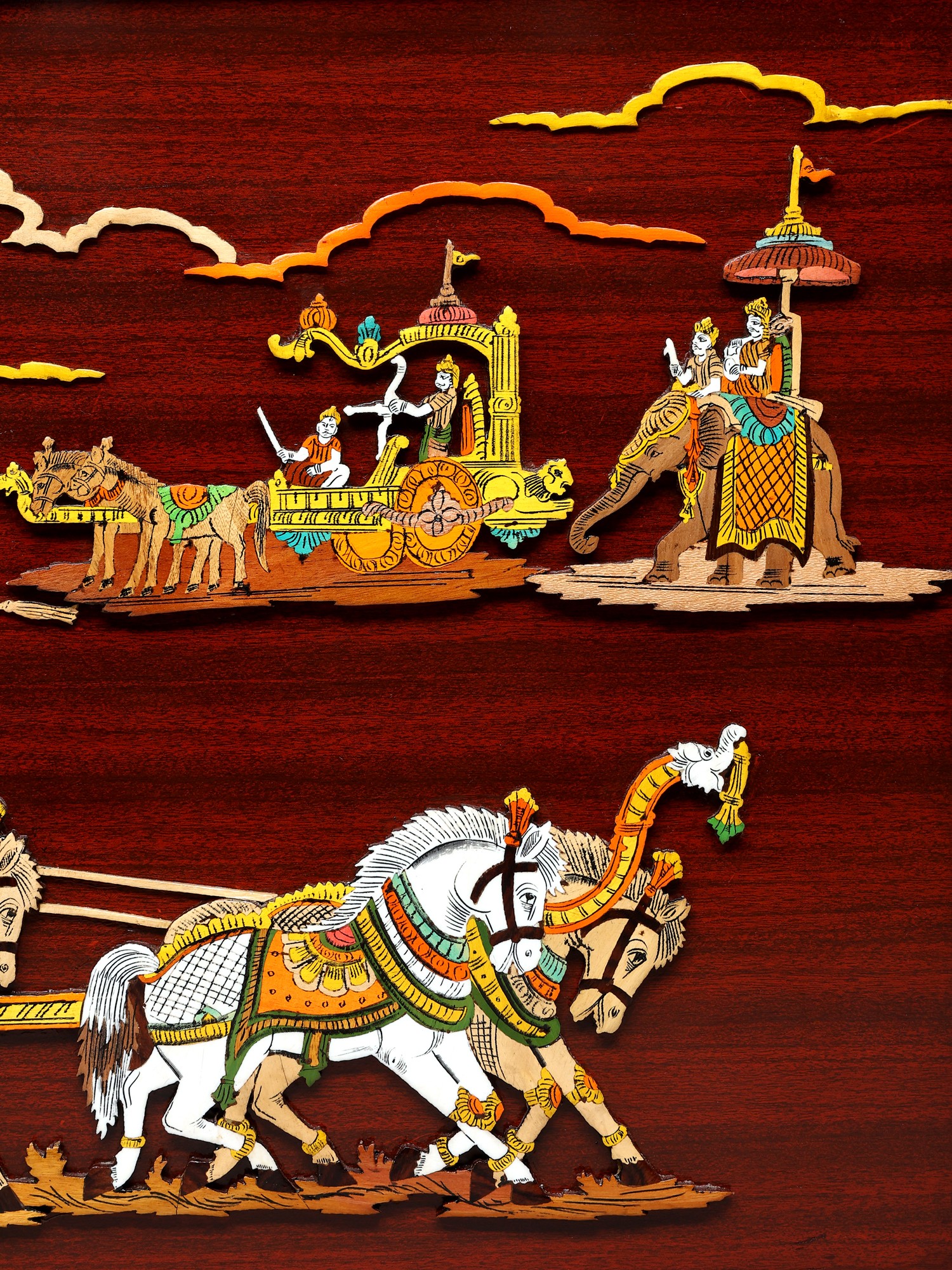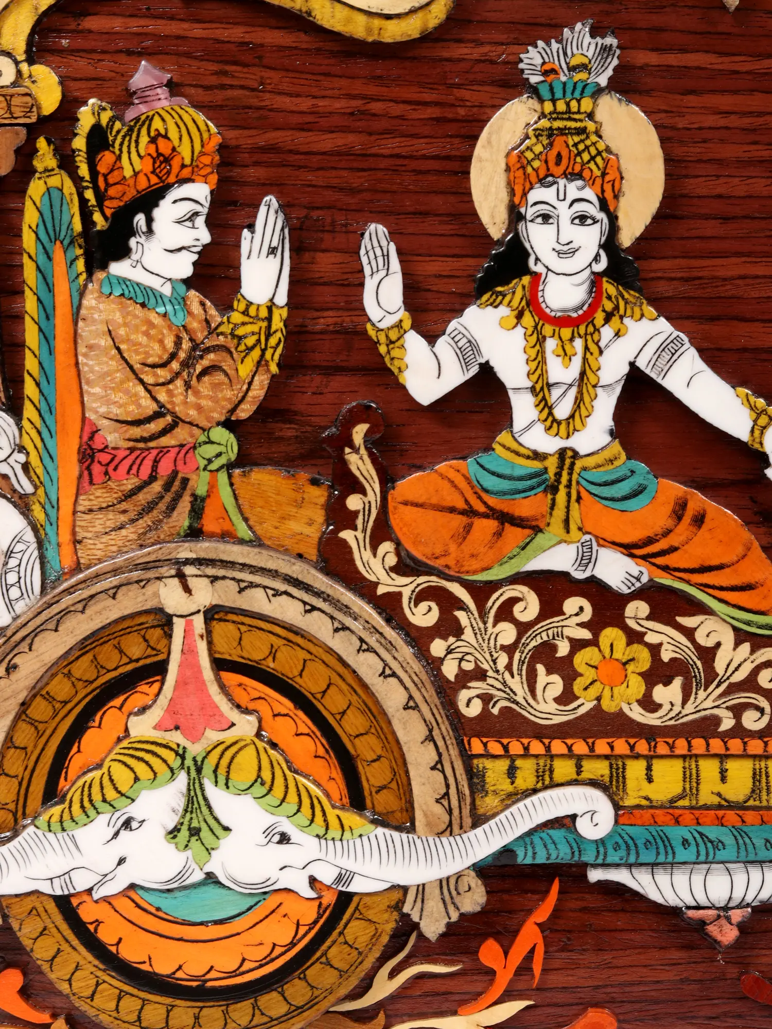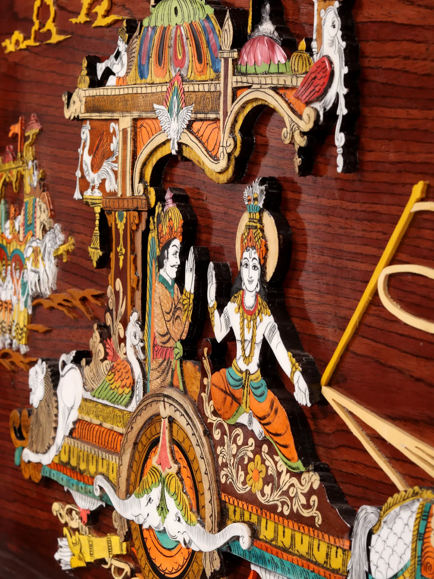 48" Mahabharata War View With Geeta Updesh | Natural Color On 3D Wood Painting With Inlay Work
