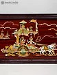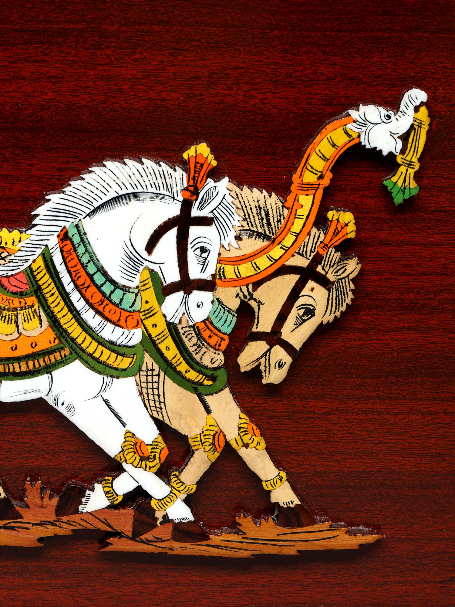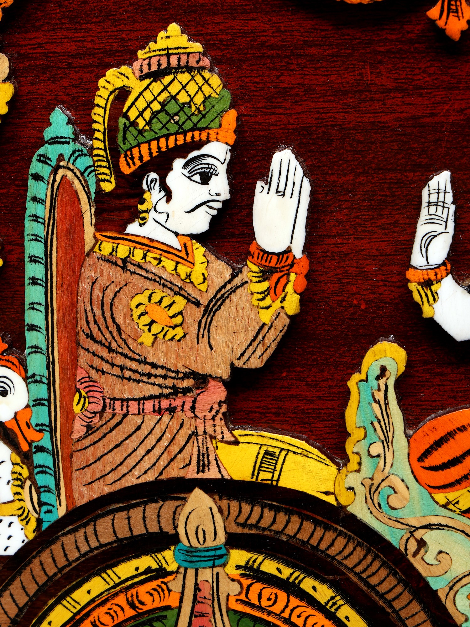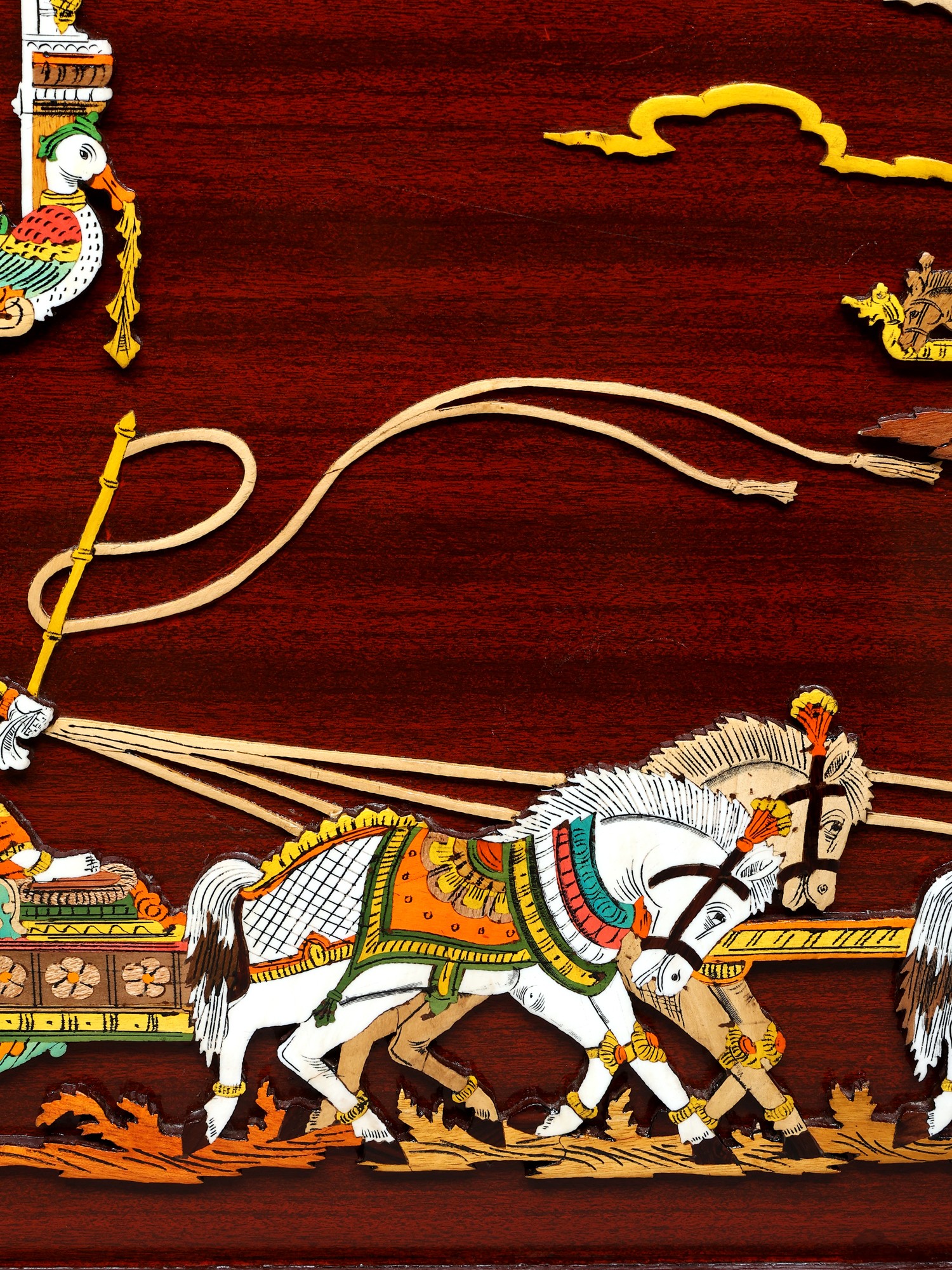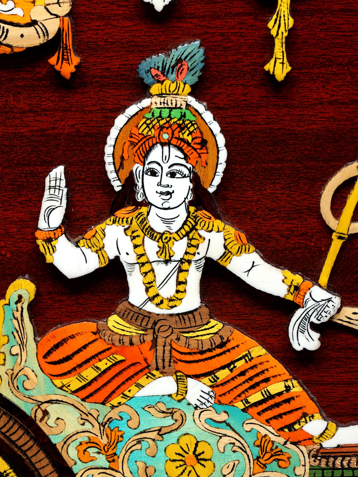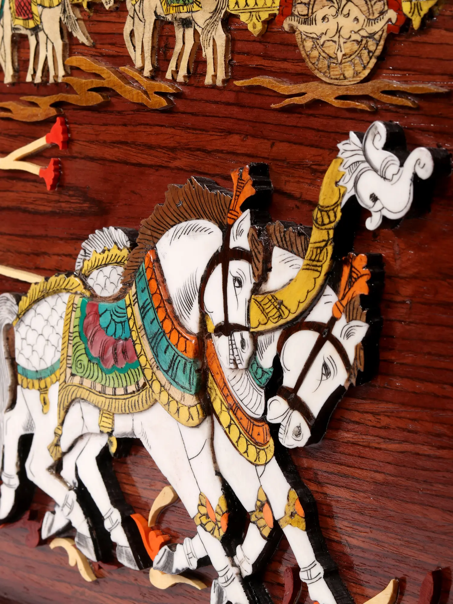 This breathtaking 48-inch-wide Mysore wooden inlay painting brings to life the epic saga of the Mahabharata, a cornerstone of Indian culture and mythology. The meticulously crafted piece showcases a dramatic scene from the war, capturing the intensity and grandeur of this timeless tale. Lord Krishna, the divine charioteer and guide to Arjuna, is depicted in his iconic role, counseling the warrior prince amidst the chaos of battle. The intricate detail extends to the battlefield itself, with chariots, elephants, and warriors rendered with stunning accuracy, all within a rich, natural wood frame. Each element of the scene is beautifully rendered, giving life to the characters and the drama of the moment. The use of natural colours and the shimmering inlay work create a luminescent effect, elevating this piece beyond mere artistry into a truly evocative experience.
