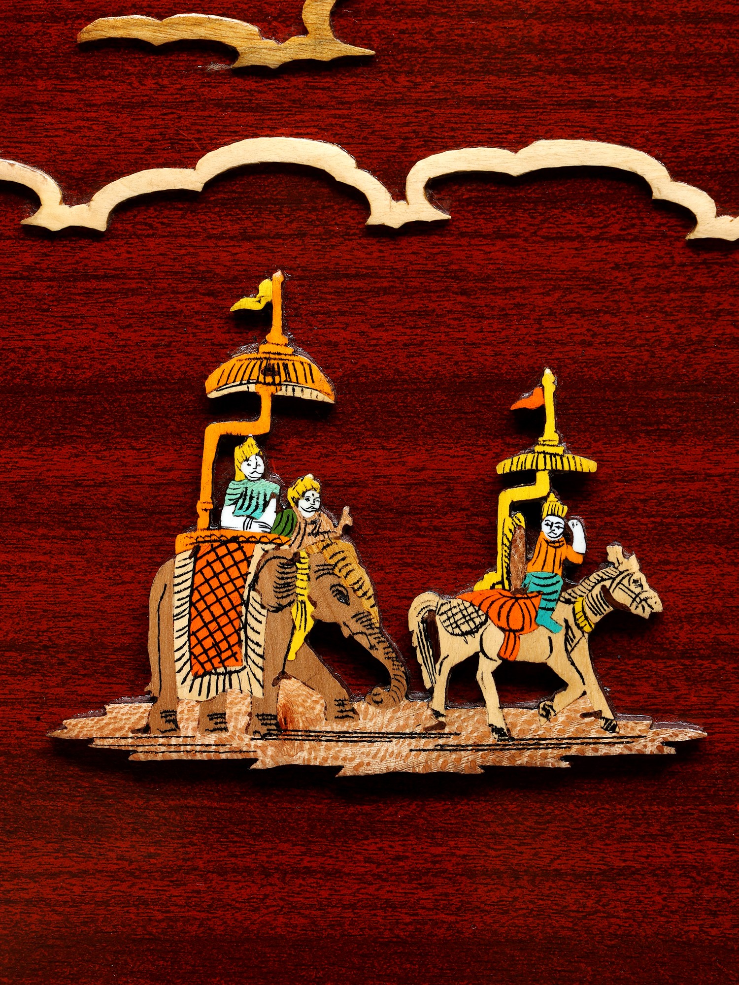 Wood inlay is a historically significant art form from the 18th century. It arrived in India through Srirangaptnam in Mysore from Persia but has become an inevitable part of the Indian heritage. Tipu Sultan and the Wodeyars/Wadiyars are credited with the growth of this 400-year-old art form in Mysore and its neighboring areas. Wood inlay work is usually done on a Mysore rosewood base, and other woods are used, like mango, kadam, jackfruit, rubber, doodhi, etc. Pieces of wood are adorned with beautiful motifs and patterns made from various materials. From wall hangings and paintings to jewelry boxes and furniture, many items are made using the Mysore wood inlay technique. An outline is etched on a piece of rosewood with a sharp tool. Then, the area inside the outline is hollowed out, and materials like lacquer, enamel, contrasting wood, and sometimes even gold and silver are placed inside it. A sandpaper is used to give a smooth finish to the surface.