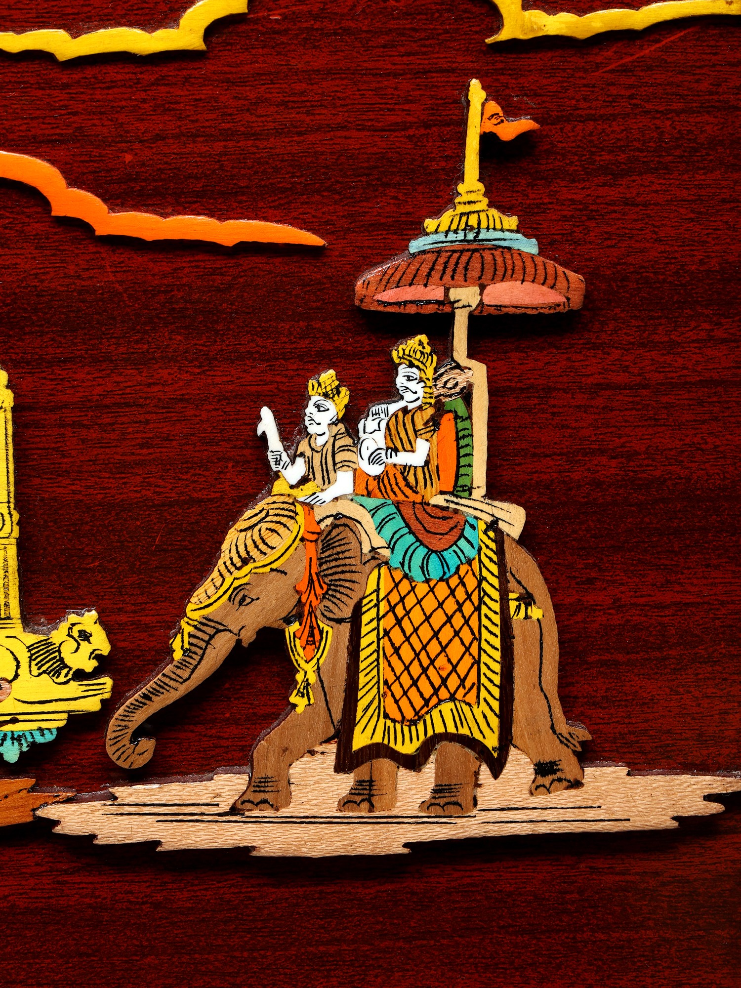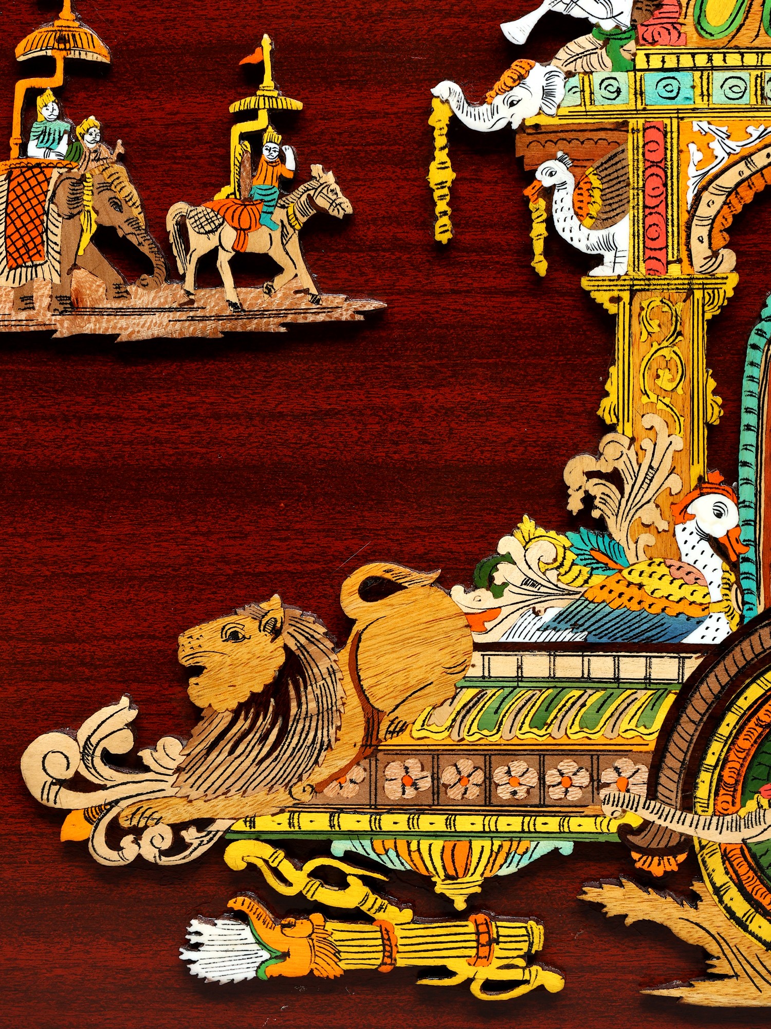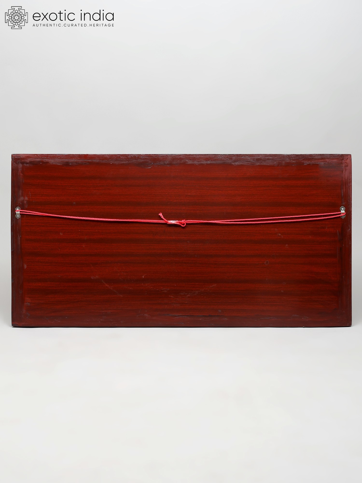 The creation of this magnificent artwork involves the time-honored technique of Mysore wooden inlay. This ancient Indian craft, handed down through generations, involves the precise insertion of small pieces of wood and other materials (often bone or ivory, though this piece uses wood) of contrasting colors into a base wood to create detailed designs and patterns. The intricate process requires exceptional skill and patience, with each tiny piece carefully selected and placed to achieve the overall effect. The artisans of Mysore have a long history of mastery in this intricate art form, making this piece a testament to their skill and dedication. This ancient craft contributes not only to the beauty of the work, but also to the preservation of a cultural tradition. This painting is not merely a decorative piece but an heirloom that captures the essence of a rich cultural legacy.
