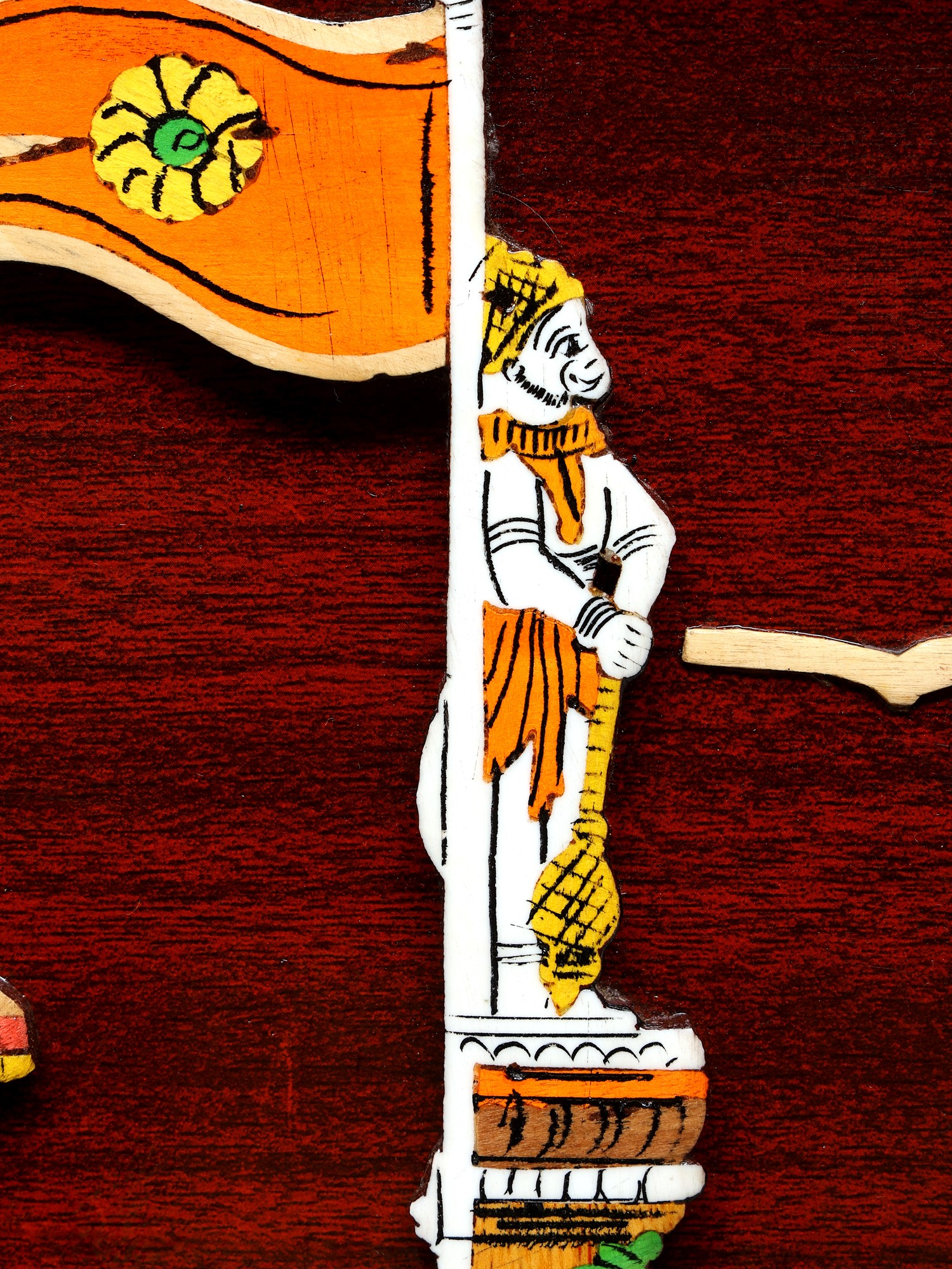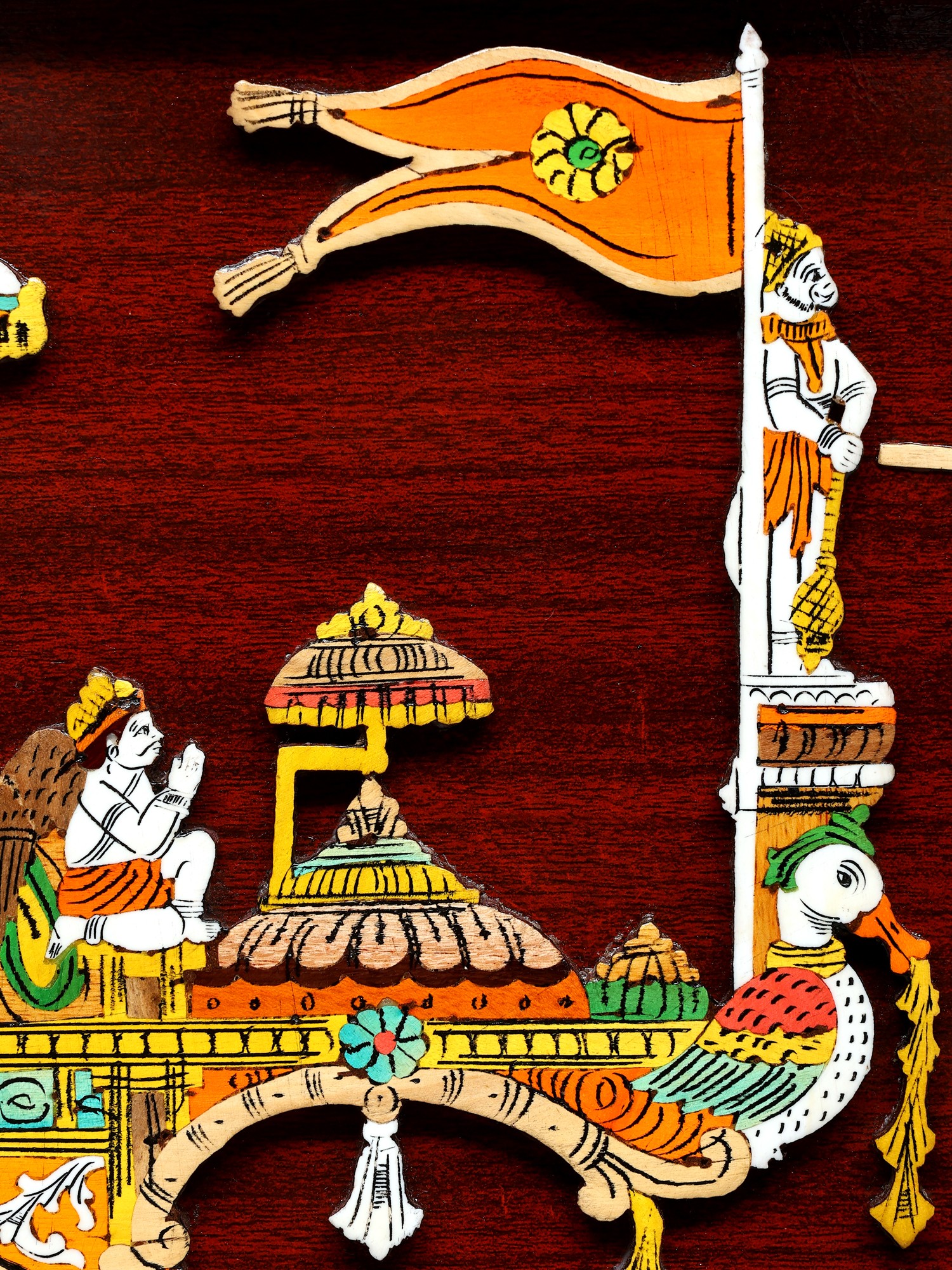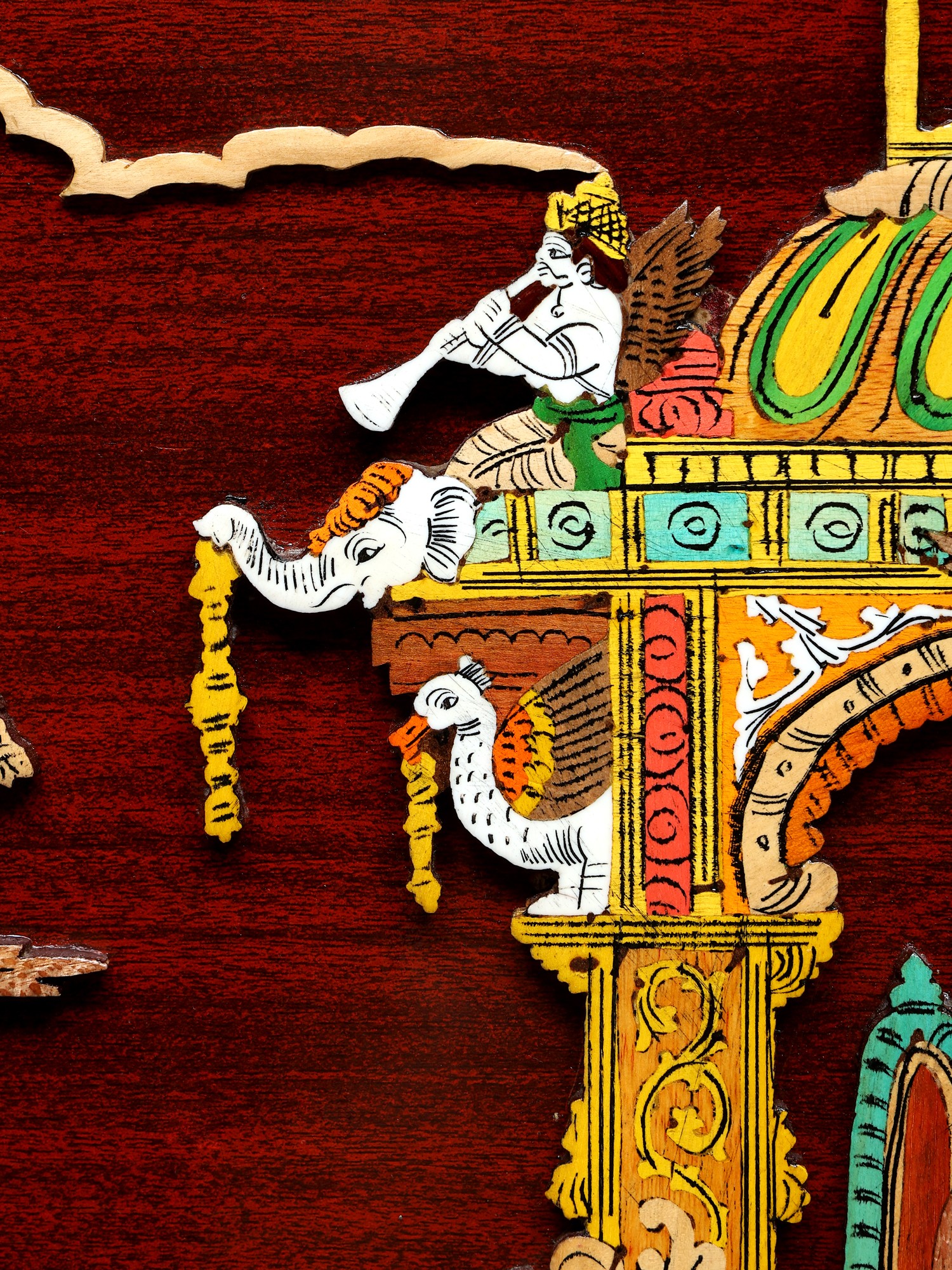 The creation of this magnificent artwork involves the time-honored technique of Mysore wooden inlay. This ancient Indian craft, handed down through generations, involves the precise insertion of small pieces of wood and other materials (often bone or ivory, though this piece uses wood) of contrasting colors into a base wood to create detailed designs and patterns. The intricate process requires exceptional skill and patience, with each tiny piece carefully selected and placed to achieve the overall effect. The artisans of Mysore have a long history of mastery in this intricate art form, making this piece a testament to their skill and dedication. This ancient craft contributes not only to the beauty of the work, but also to the preservation of a cultural tradition. This painting is not merely a decorative piece but an heirloom that captures the essence of a rich cultural legacy.