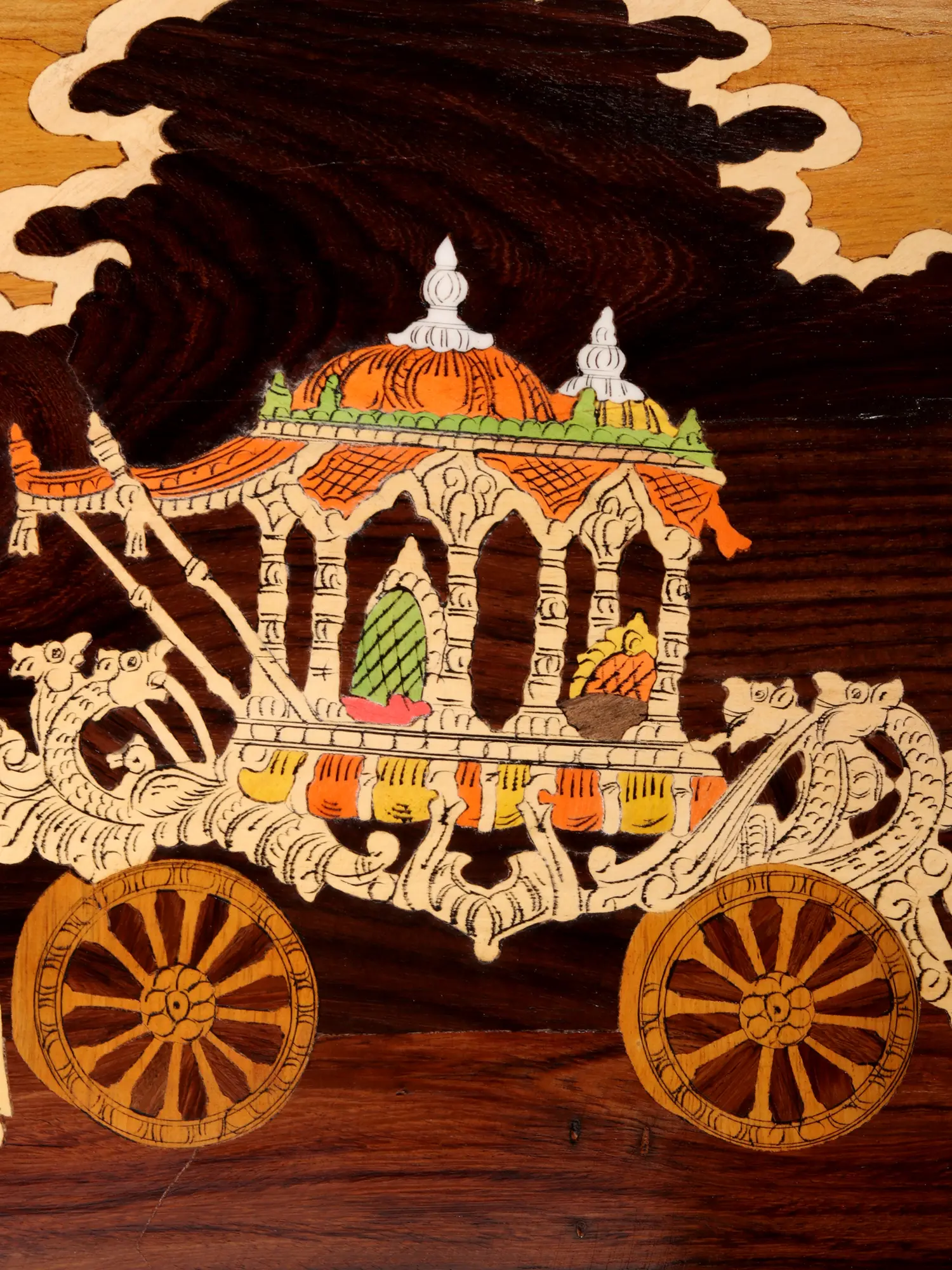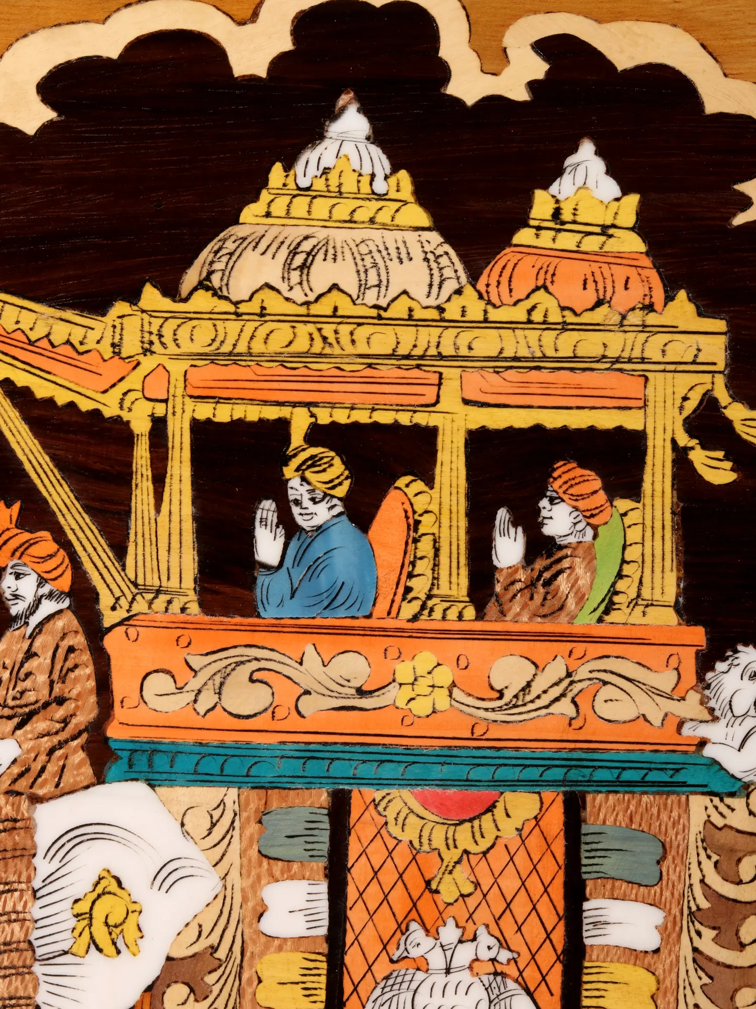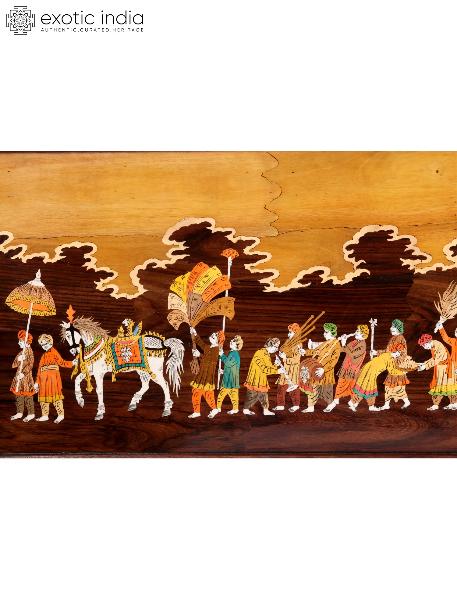 The elongated format, measuring a generous 60 inches in width by 18 inches in height, allows for a panoramic unfolding of the scene, drawing the viewer into its narrative. The natural colors, thoughtfully chosen, create a harmonious palette that enhances the richness of the wood and the intricate details of the figures and their accoutrements. The depth of the inlay work, approximately 2 inches, adds a tangible dimensionality that elevates the artwork beyond a mere flat surface, offering a tactile as well as a visual experience. The skilled composition guides your eye through the diverse elements of the procession, from the noble elephant to the elaborately adorned chariot.