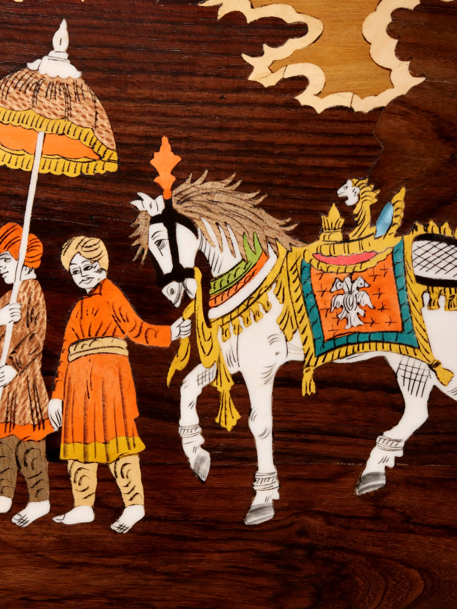 Immerse yourself in a scene of regal splendor and captivating artistry. This expansive wooden inlay panel invites you to witness a majestic procession, a timeless narrative brought to life through meticulous craftsmanship. Its commanding presence will undoubtedly become a focal point in any refined space.