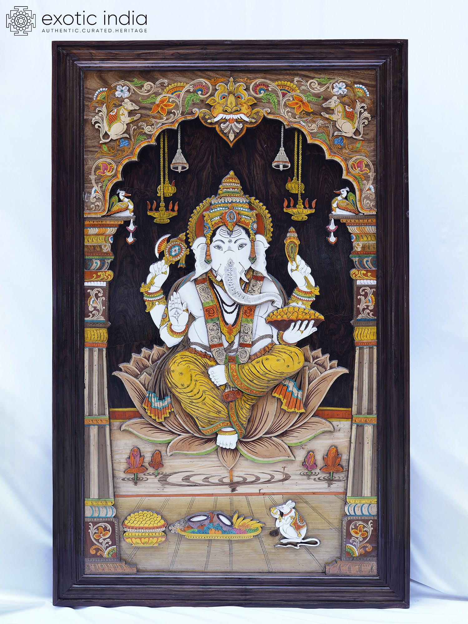 19" Lord Ganesha With Mushaka | Natural Color On Wood Panel With Inlay Work