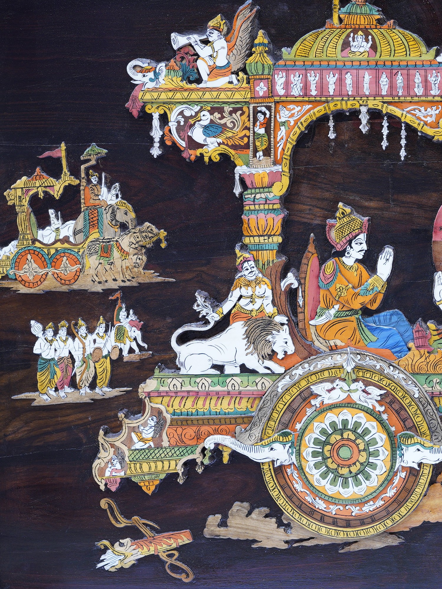36" Lord Krishna Preaching Geeta To Arjuna | Natural Color On 3D Wood Painting With Inlay Work