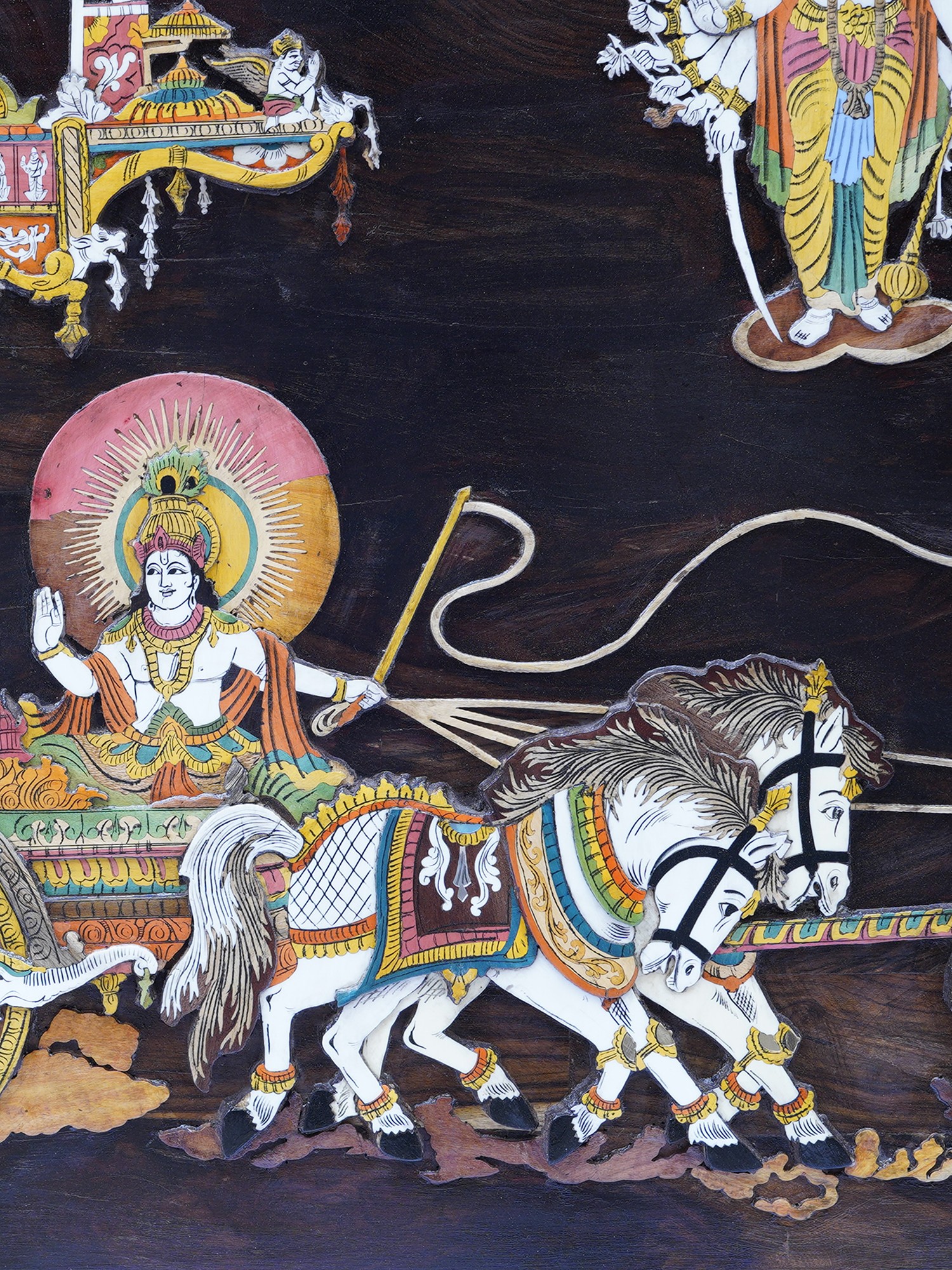 19" Lord Krishna Guide To Arjuna For War | Natural Color On Wood Panel With Inlay Work