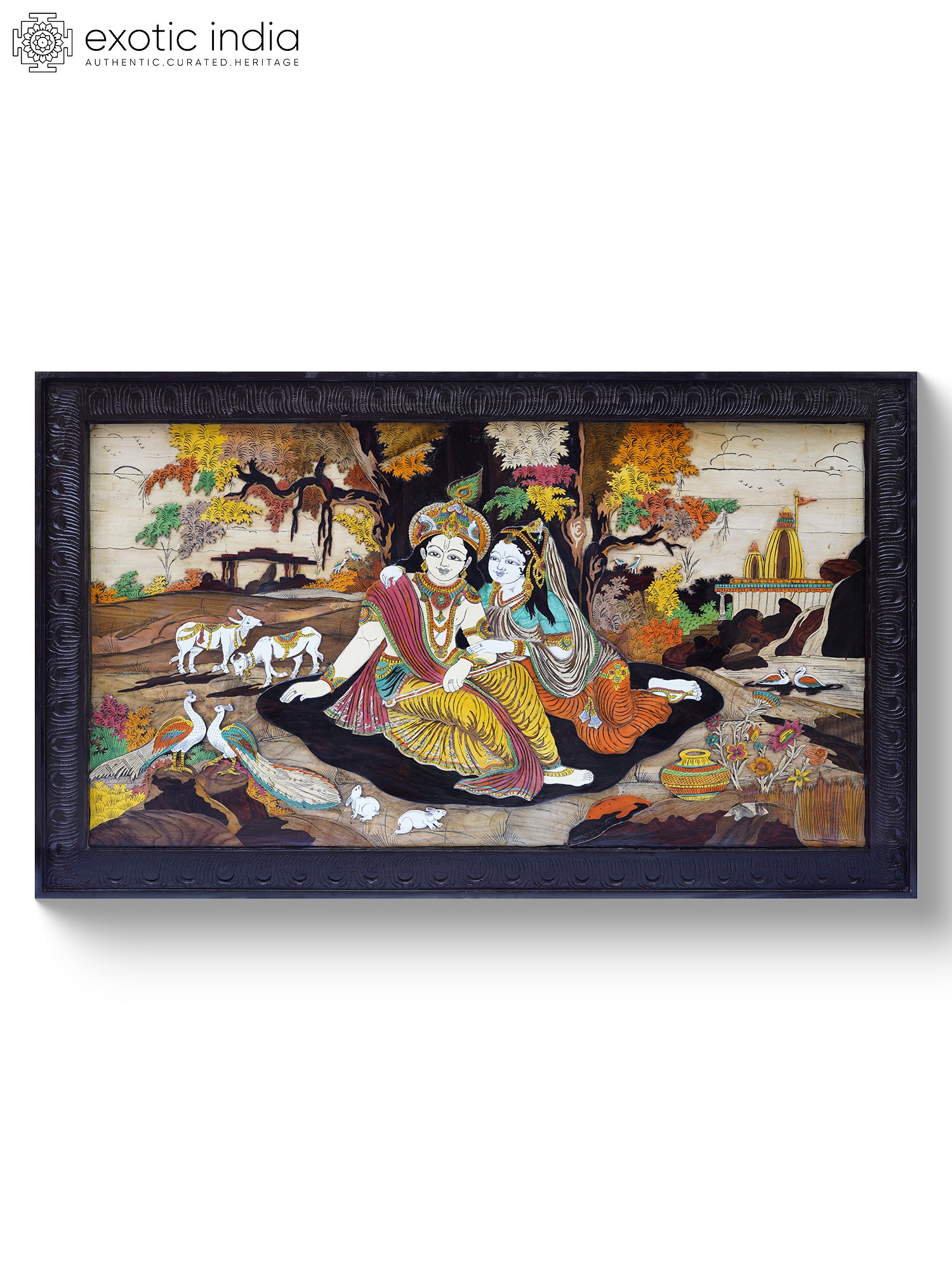 48" Divine Radha And Krishna In Vrindavan | Natural Color On 3D Wood Painting With Inlay Work