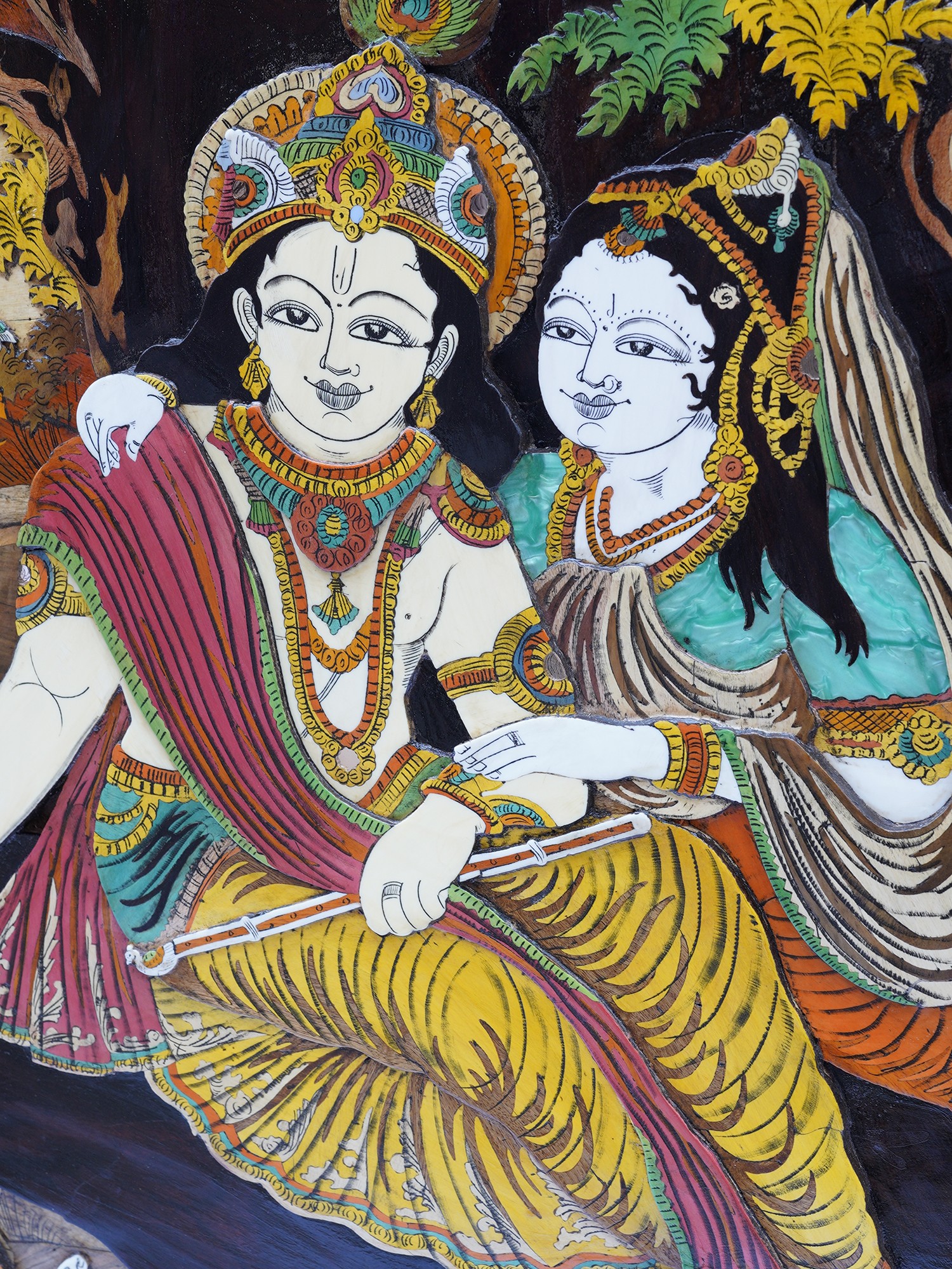 61" Lord Krishna Seated with Radha Rani | Rosewood 3D Panel with Inlay Work