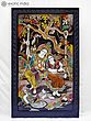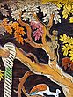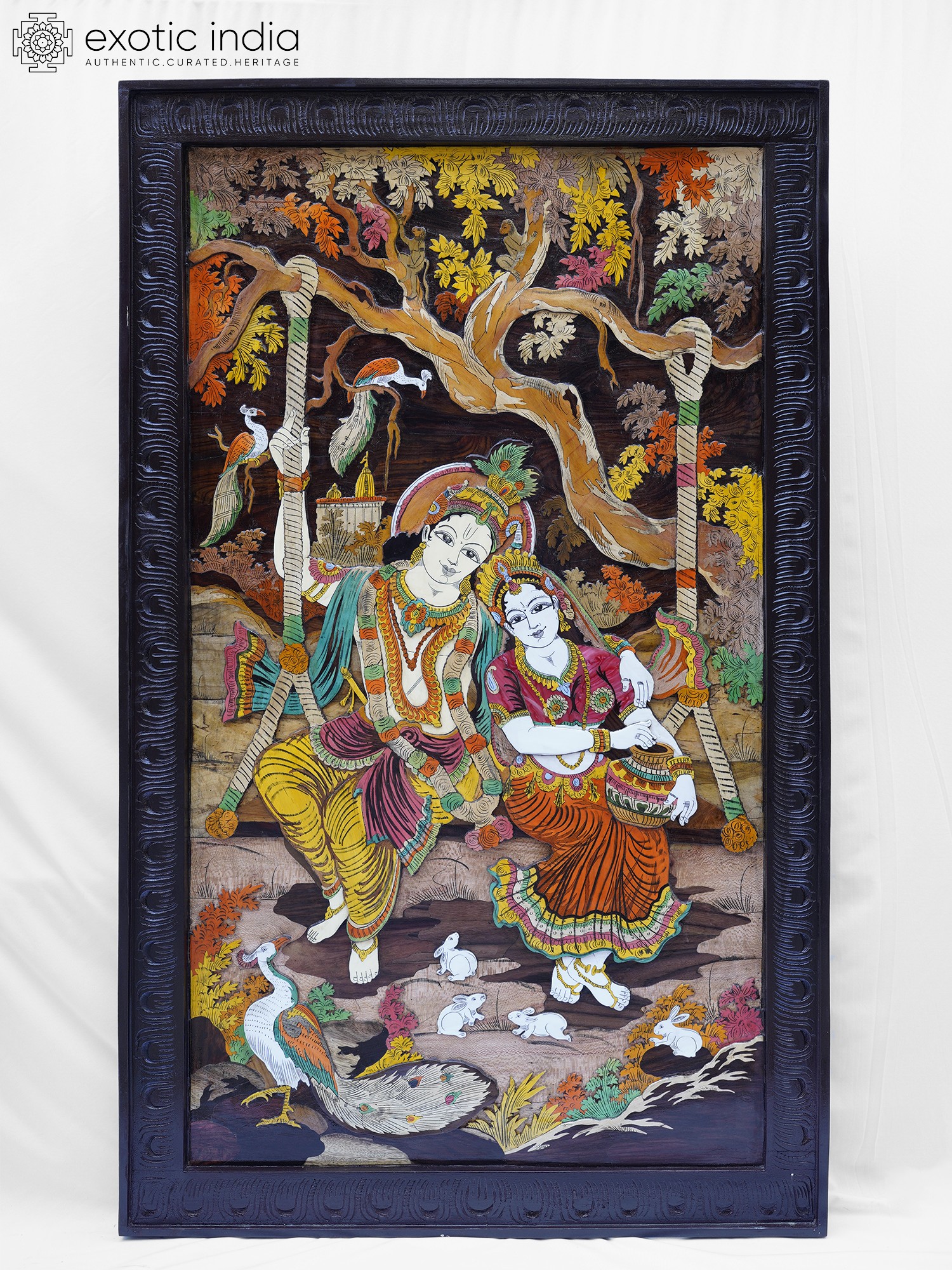 The grand scale of this artwork, measuring 37 inches in height and a sweeping 61 inches in width, allows for an immersive visual experience. You’ll appreciate the delicate rendering of the figures, adorned in flowing garments embellished with the characteristic patterns of Indian classical art. The lush arboreal setting, complete with a majestic tree and a vibrant tapestry of foliage in autumnal tones, forms a captivating backdrop. Every detail, from the gentle sway of the swing to the watchful gaze of the peacocks and the playful presence of the rabbits, is rendered with extraordinary care, creating a tableau that is both harmonious and richly detailed.