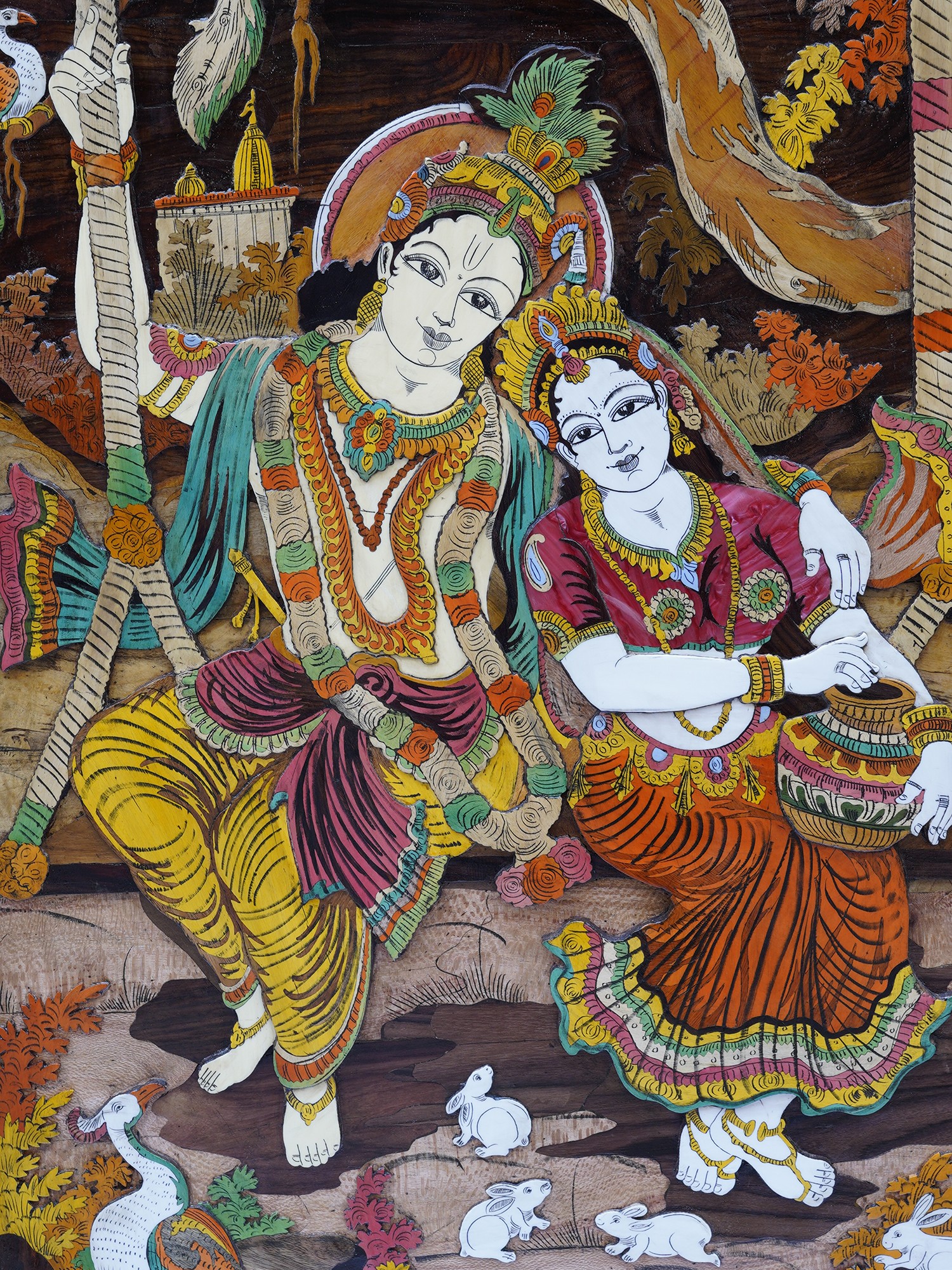 61" Radha Krishna Swinging in the Vana | Rosewood 3D Panel with Inlay Work