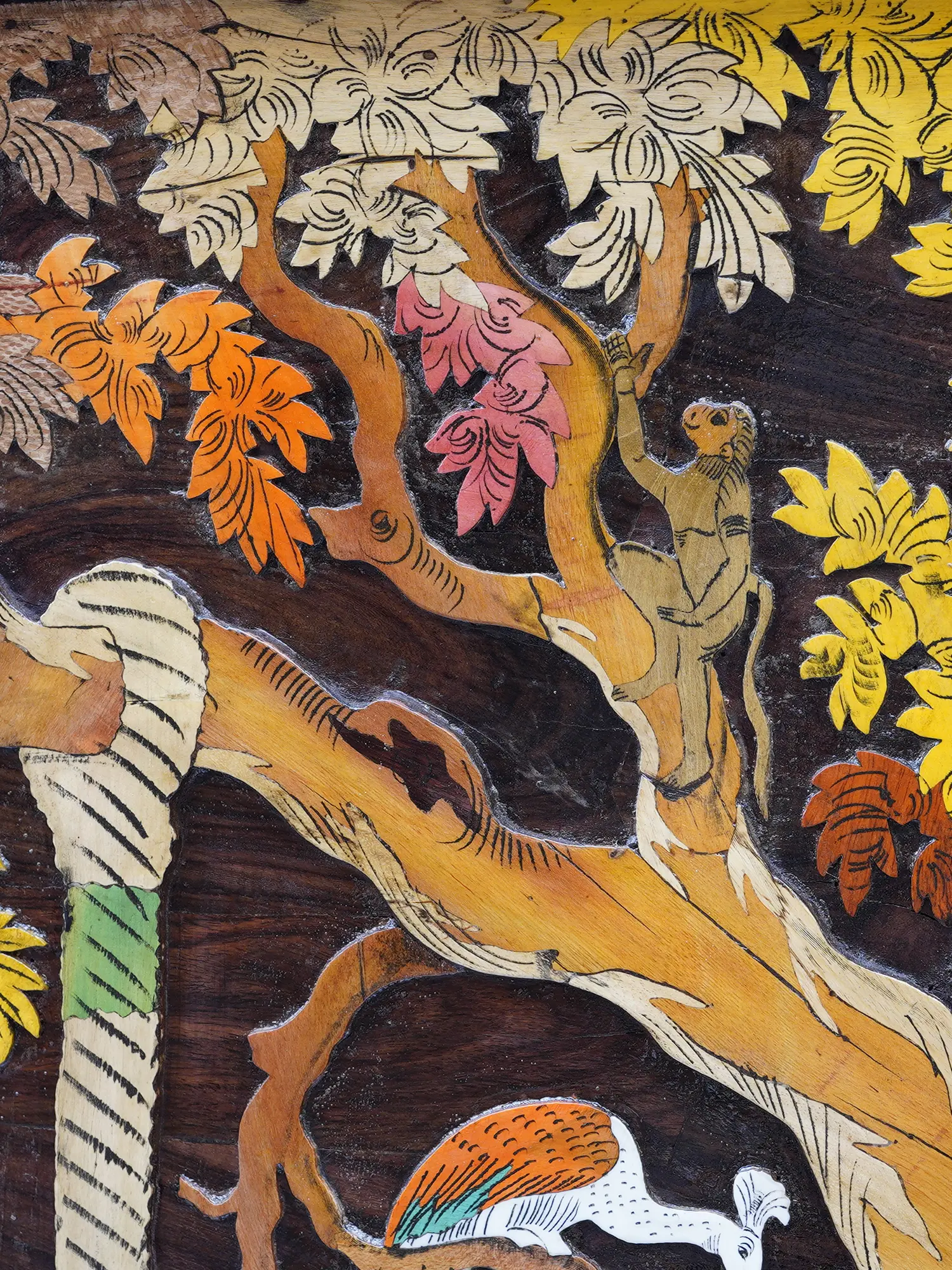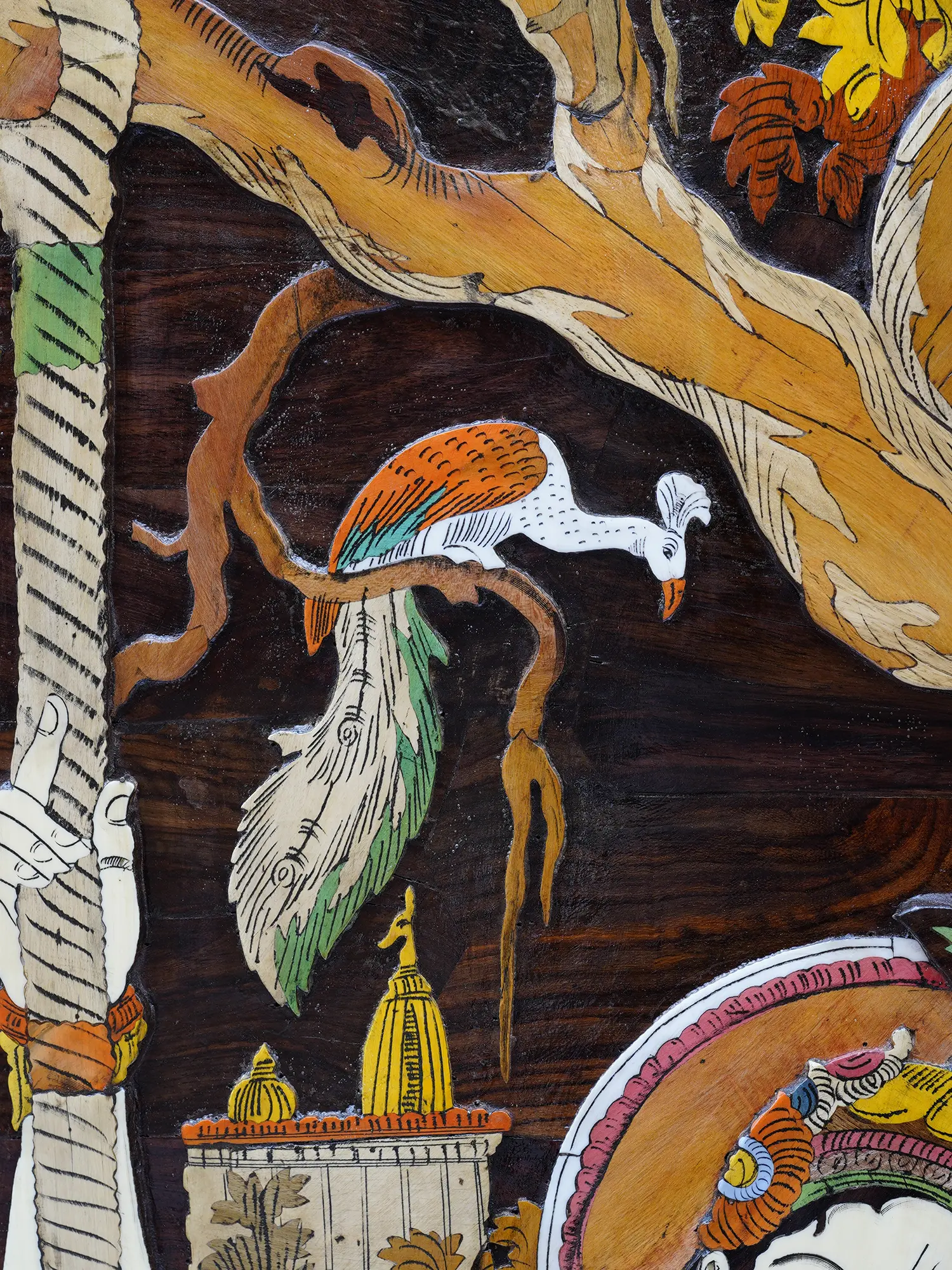 This exquisite rendition is a testament to the intricate artistry of Mysore wooden inlay work, a craft steeped in tradition and demanding unparalleled precision. Each element is meticulously carved from the rich, dark hues of rosewood, serving as the canvas for vibrant inlay details. Skilled artisans have painstakingly selected and embedded a variety of natural materials, their expertise evident in the seamless integration and the subtle textural variations that lend depth and life to the scene. The 2-inch depth of the panel allows for a remarkable three-dimensional quality, drawing you into the narrative with its tangible presence.