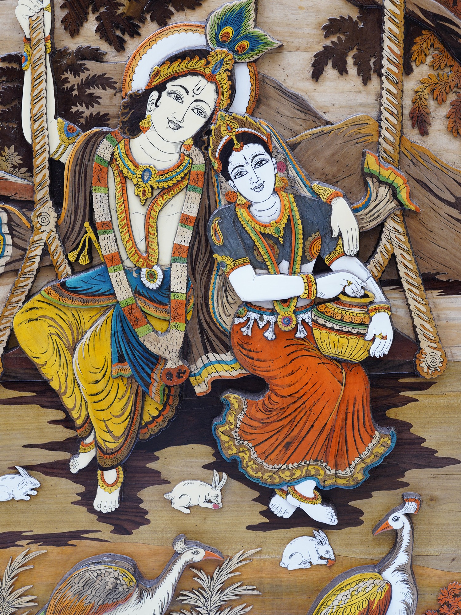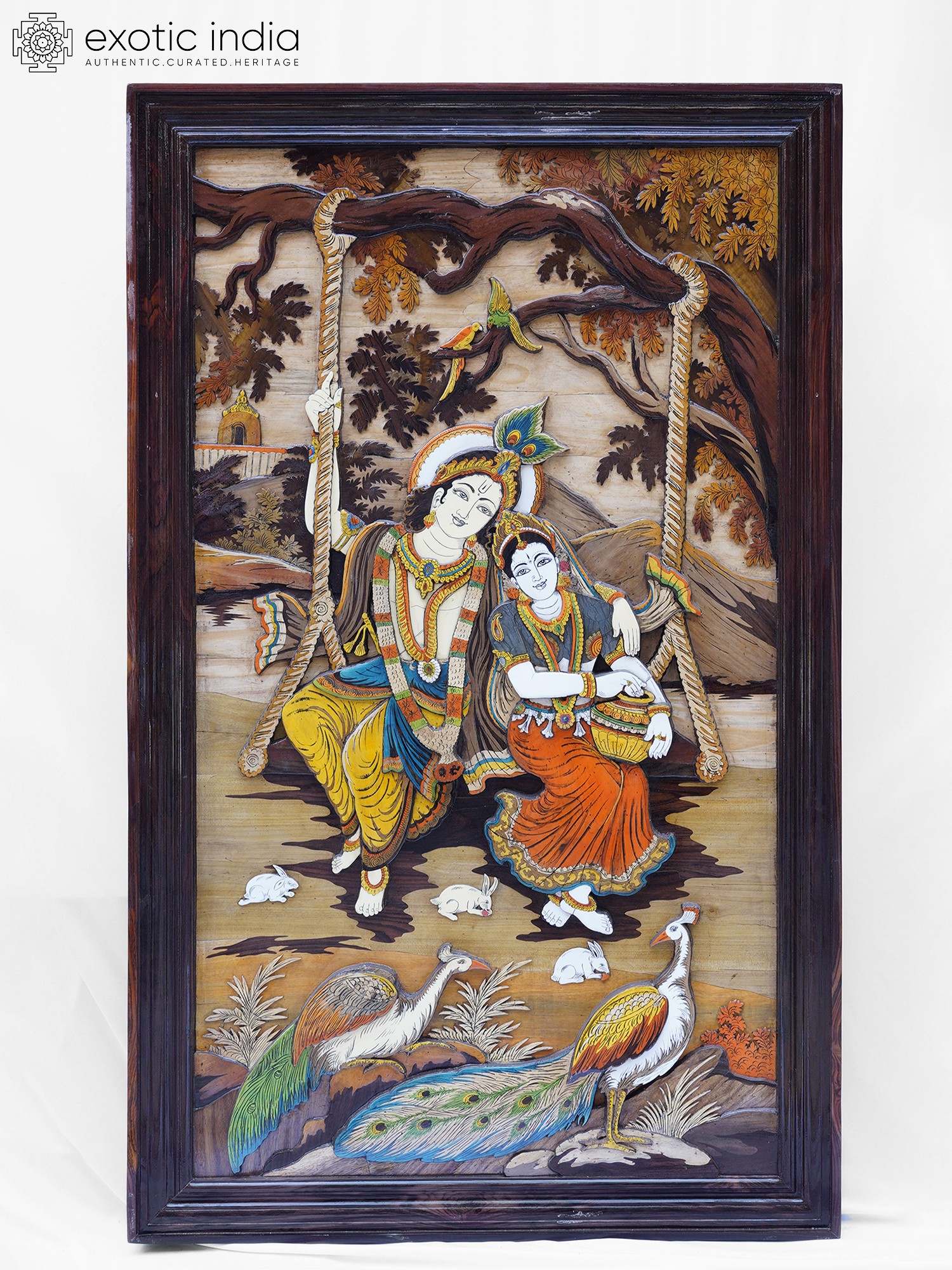 61" Radha Krishna Swinging in the Vana | Rosewood 3D Panel with Inlay Work