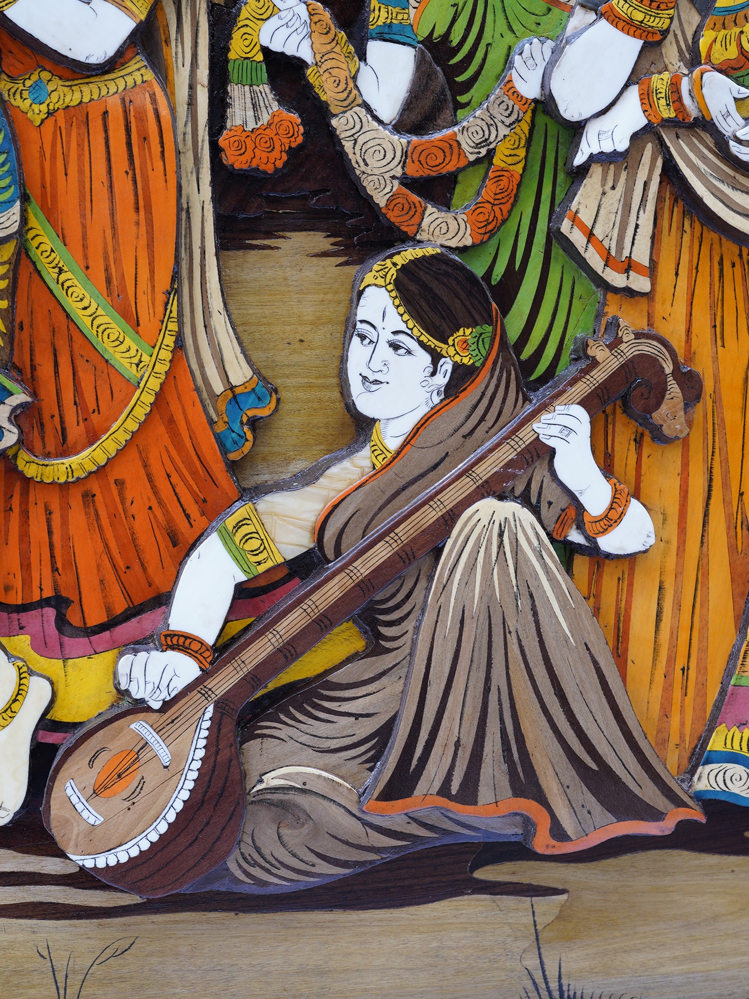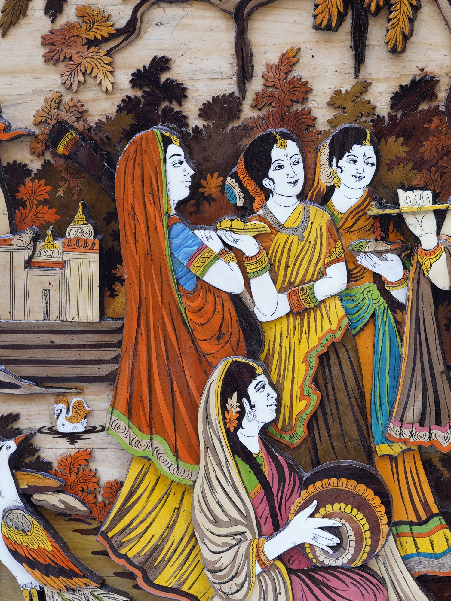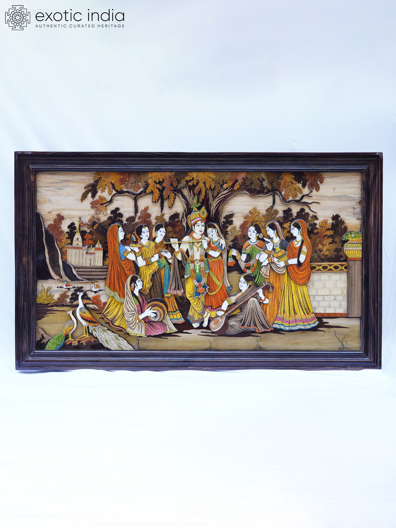 61" Radha Krishna with Gopis in Group | Rosewood 3D Panel with Inlay Work