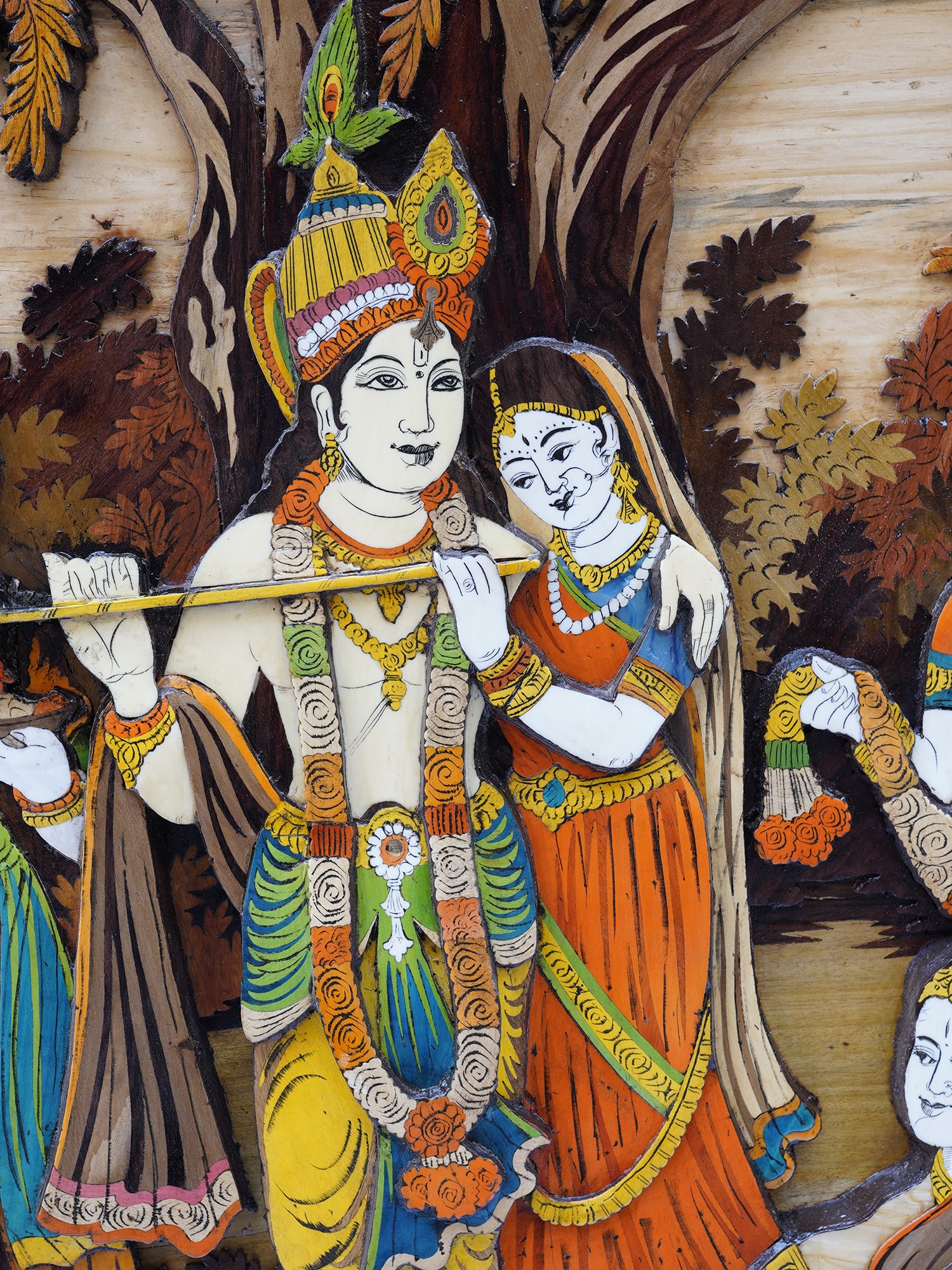 48" Divine Radha And Krishna In Vrindavan | Natural Color On 3D Wood Painting With Inlay Work