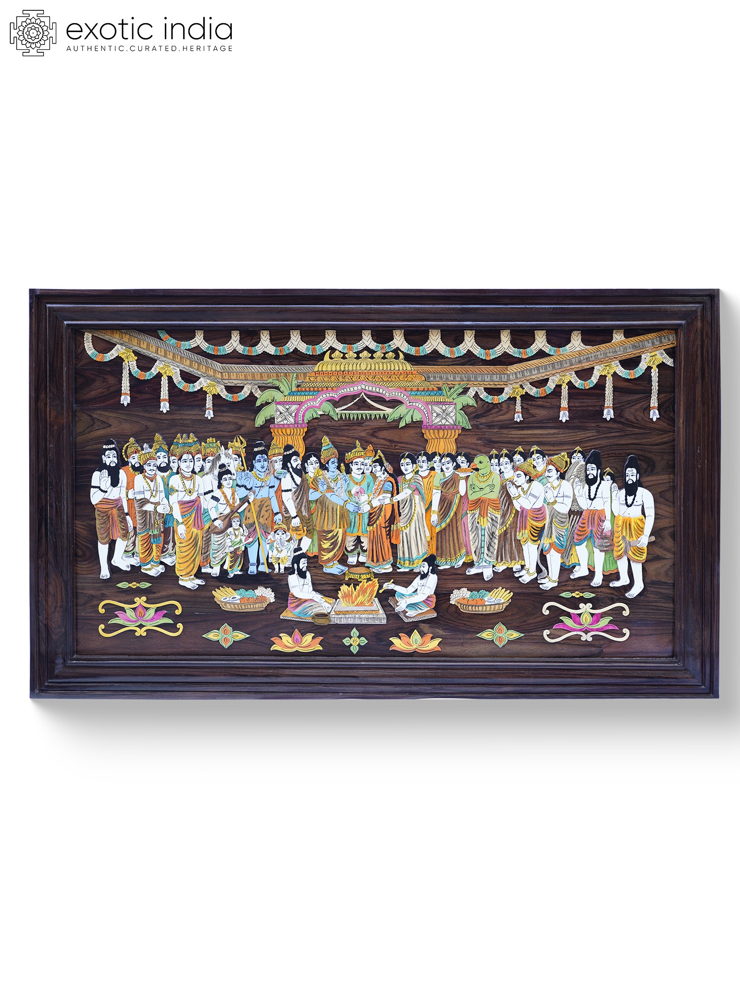 48" Large Srinivasa Kalyanam | Colorful 3D Wall Panel in Rosewood with Inlay Work