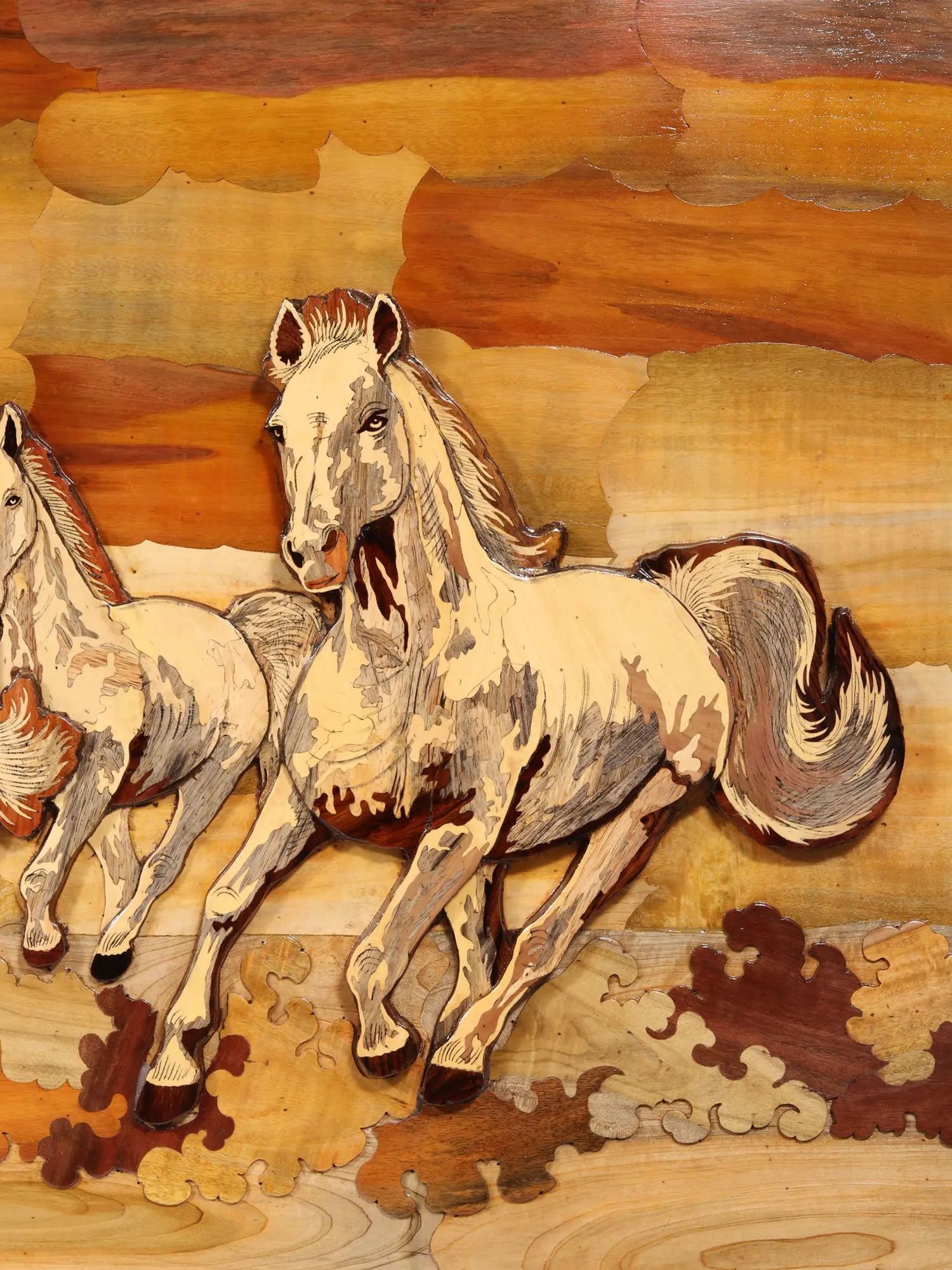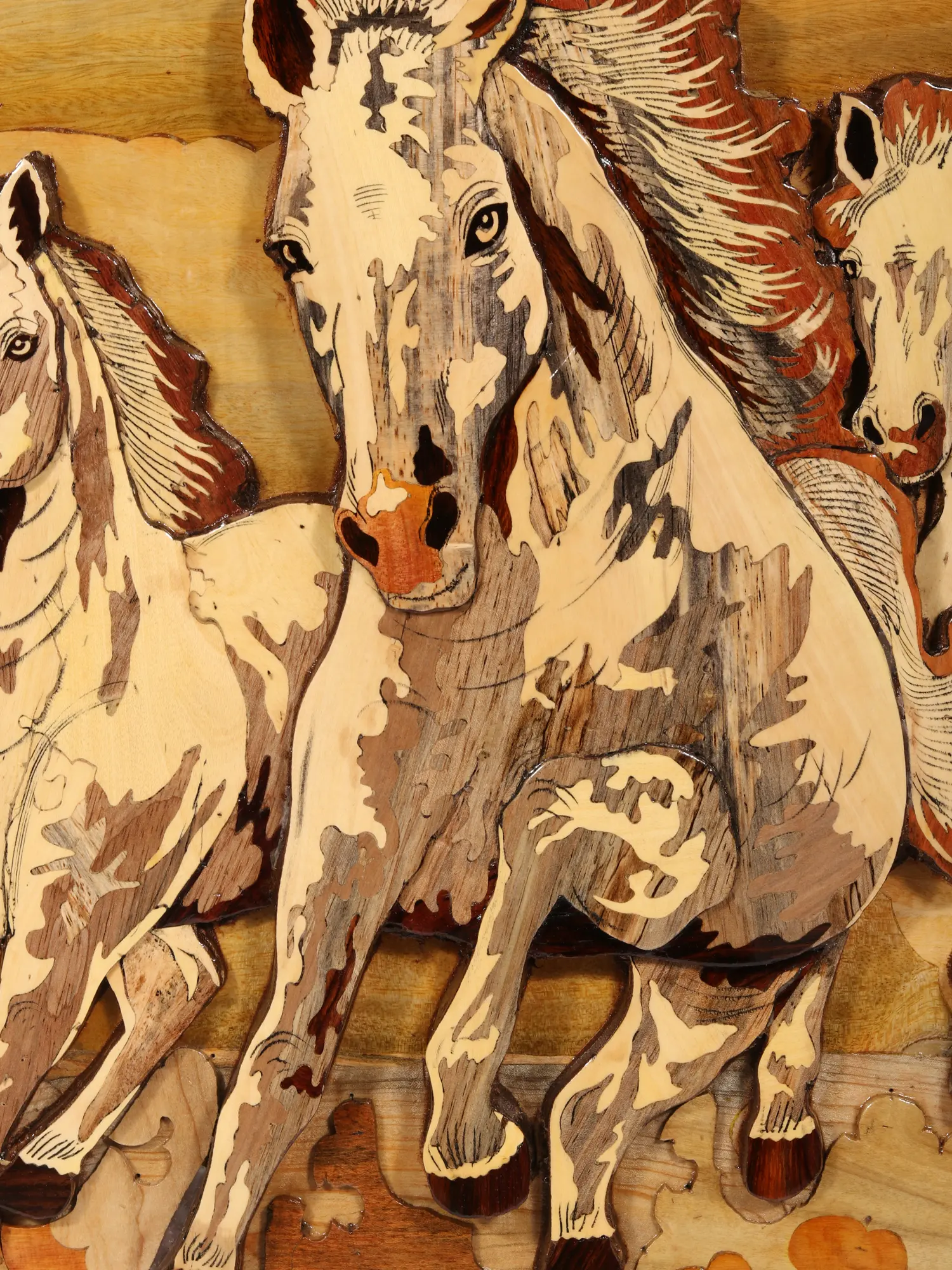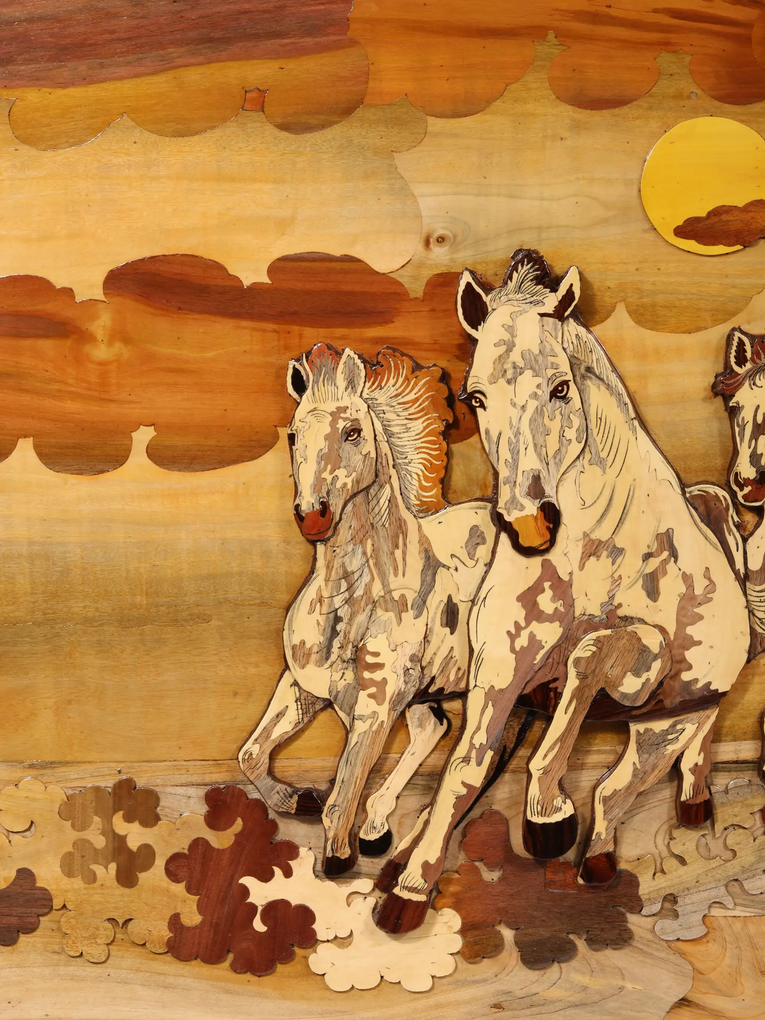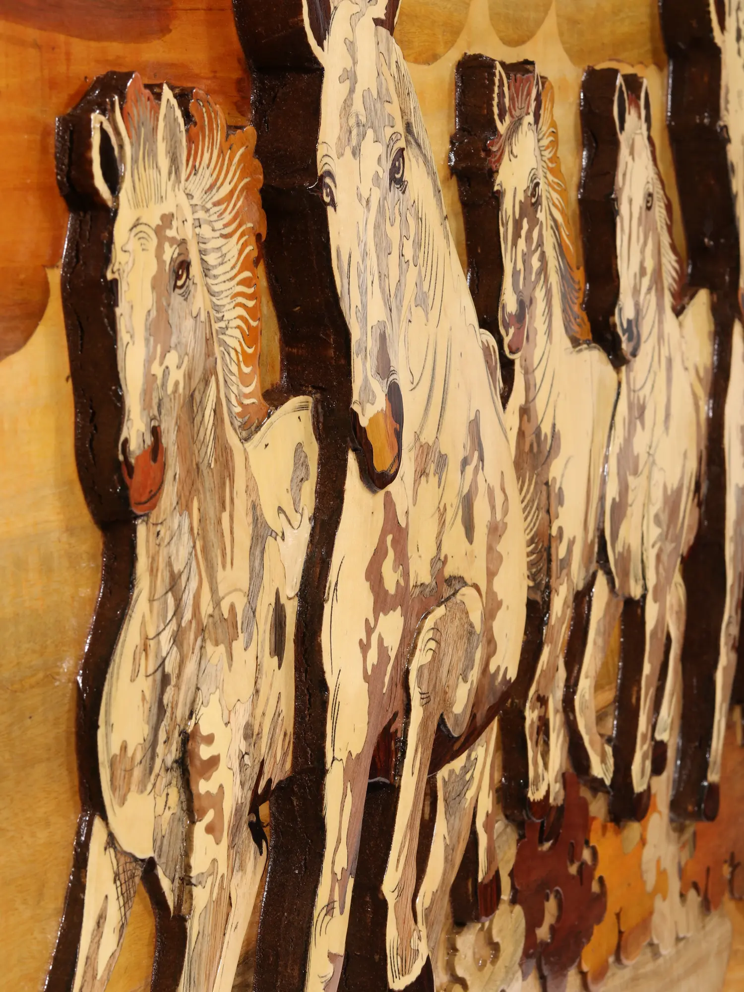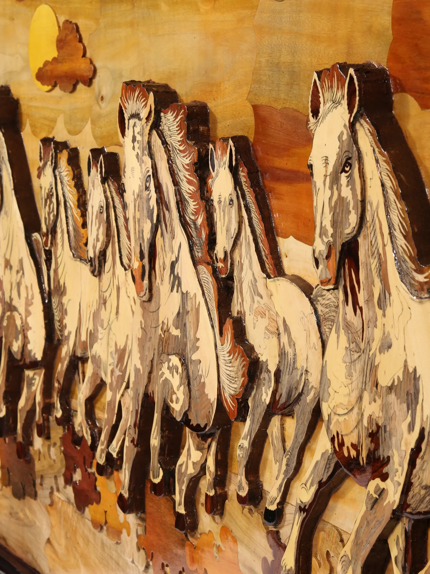 72" 3D Seven Vastu Horses | Natural Color On Wood Panel With Inlay Work