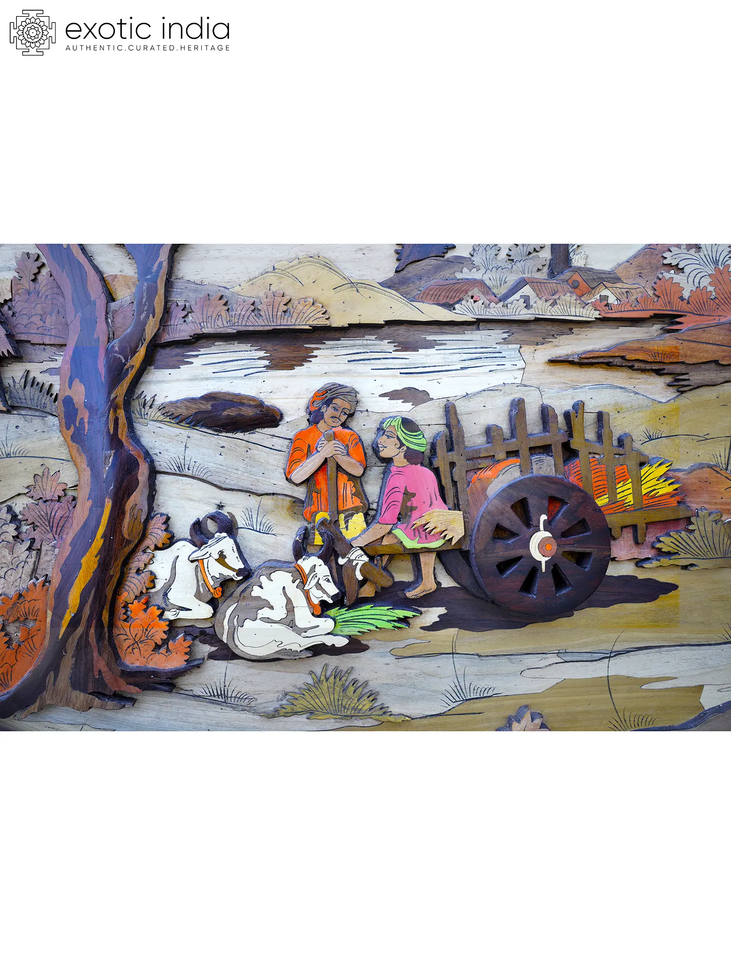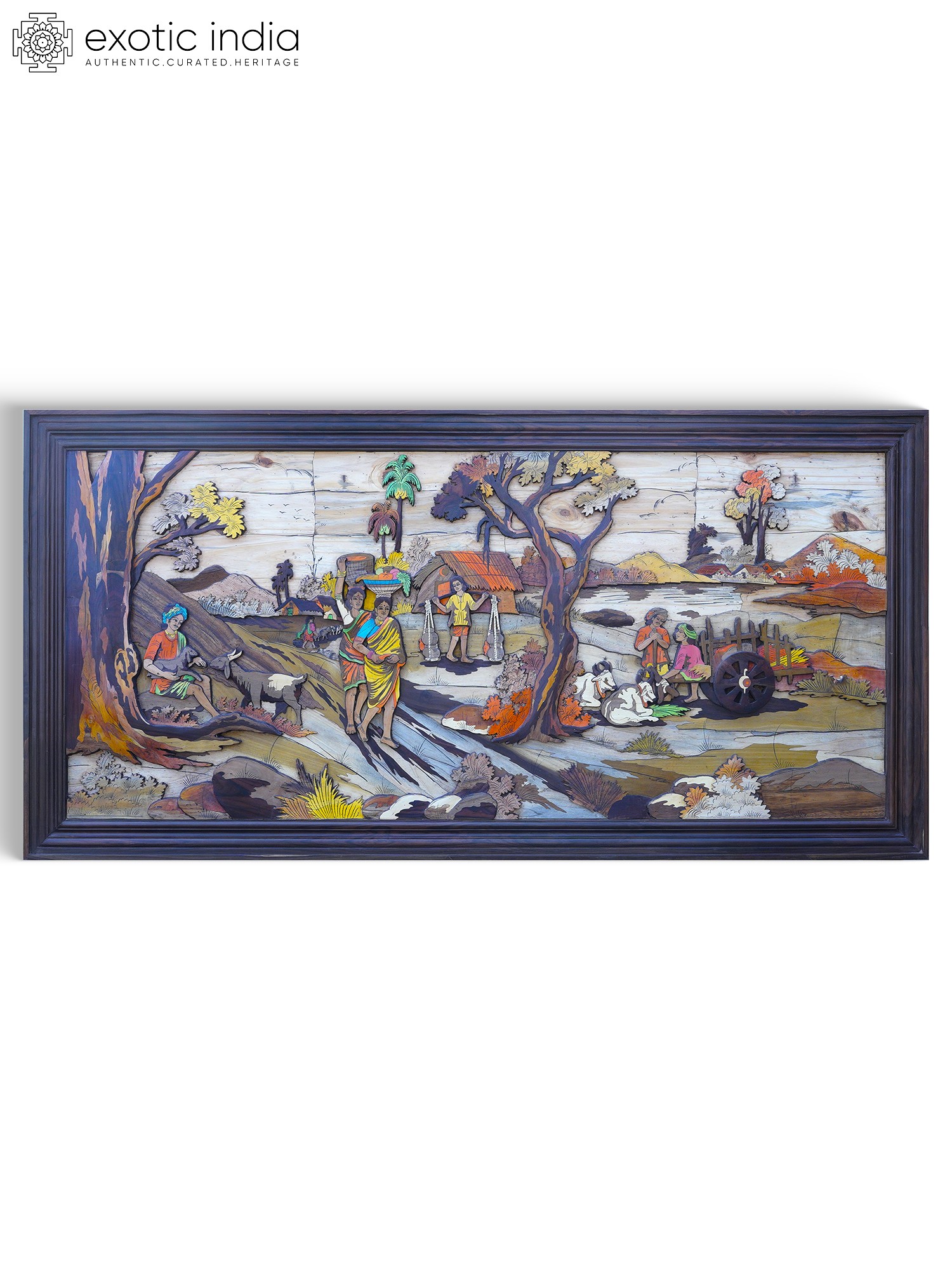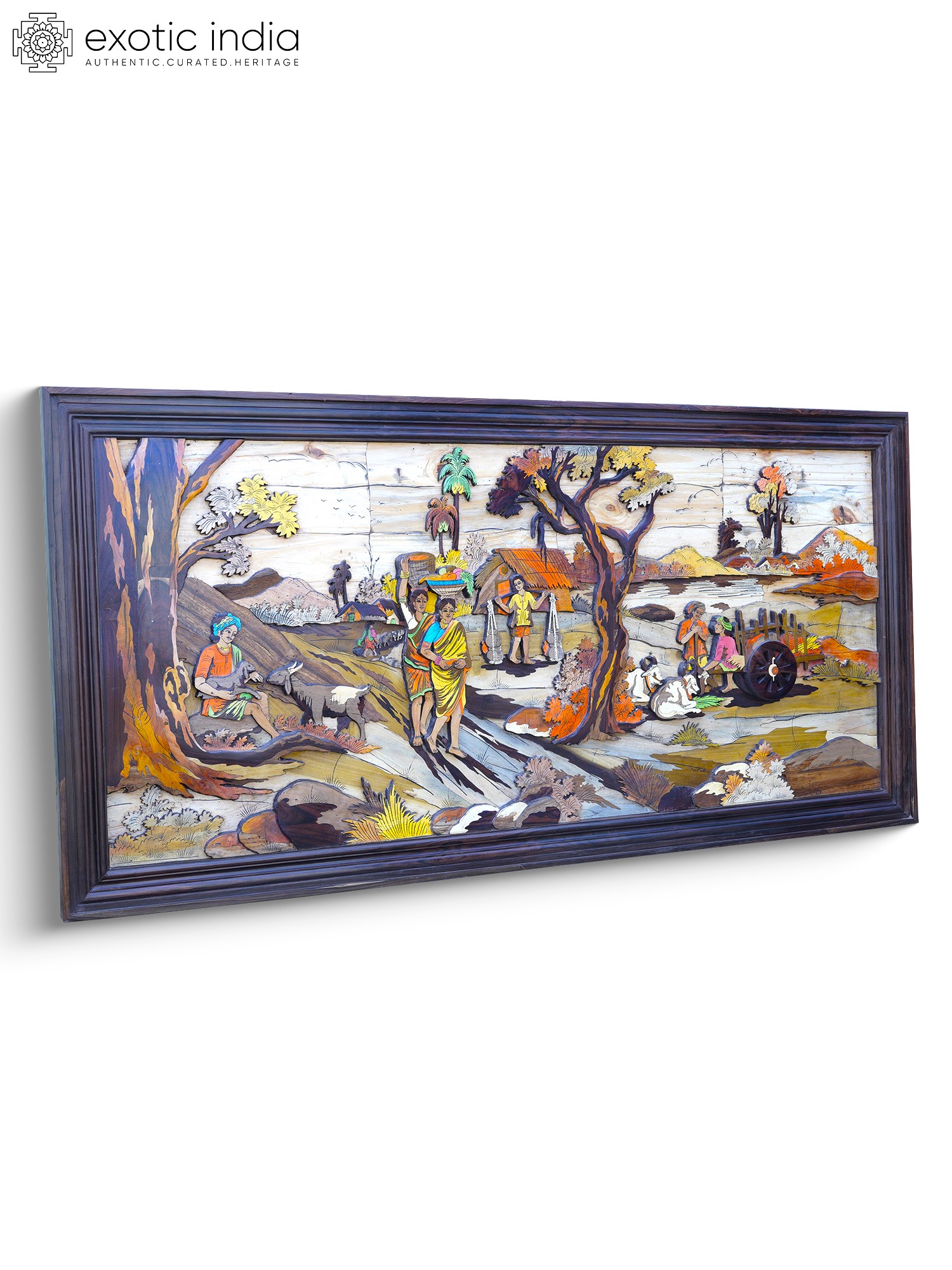 30" Working Farmers - Rural View of Village | 3D Wood Panel with Inlay Work