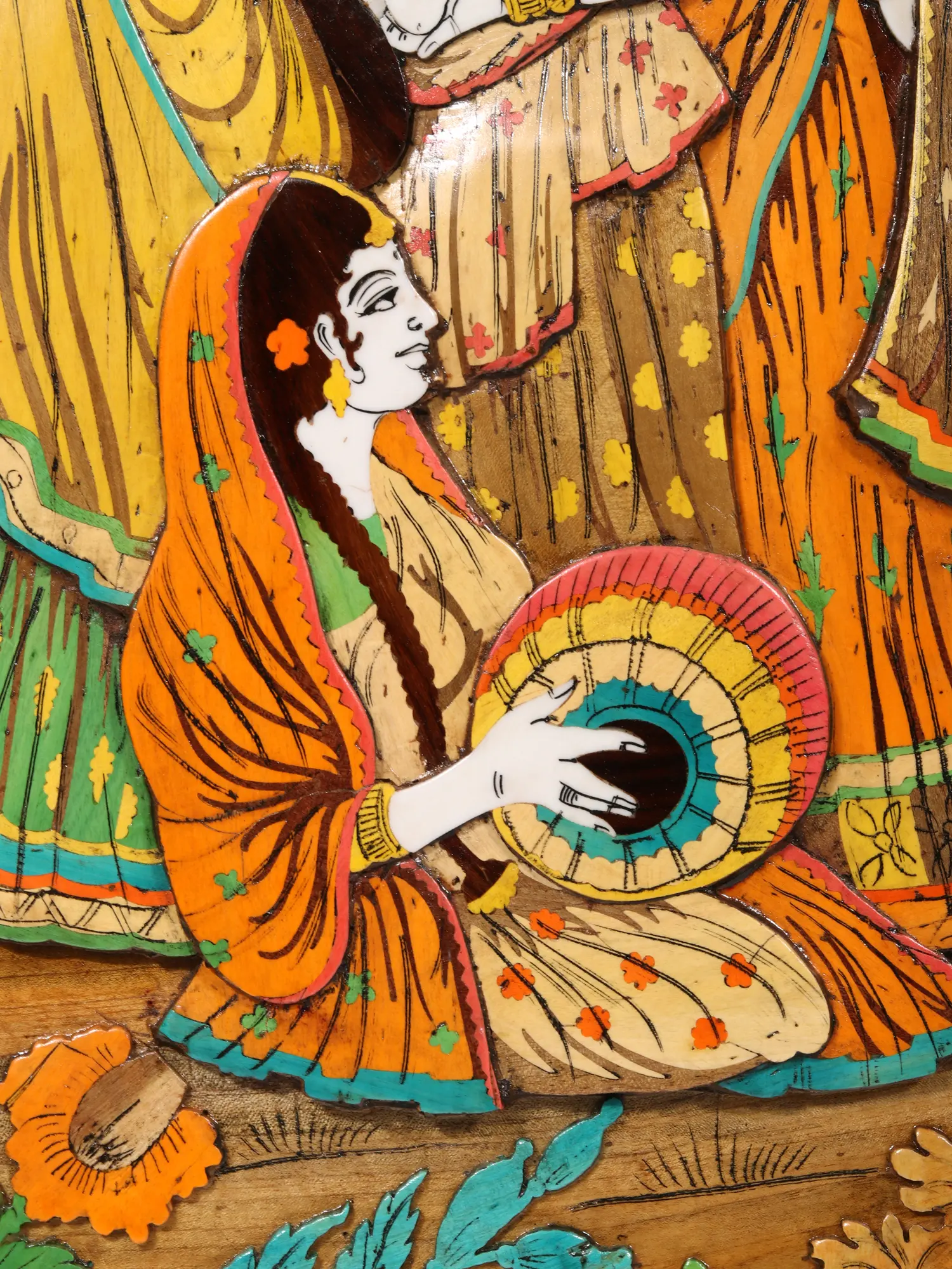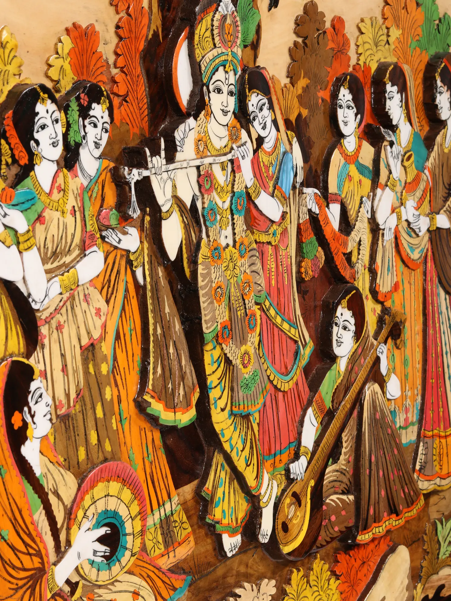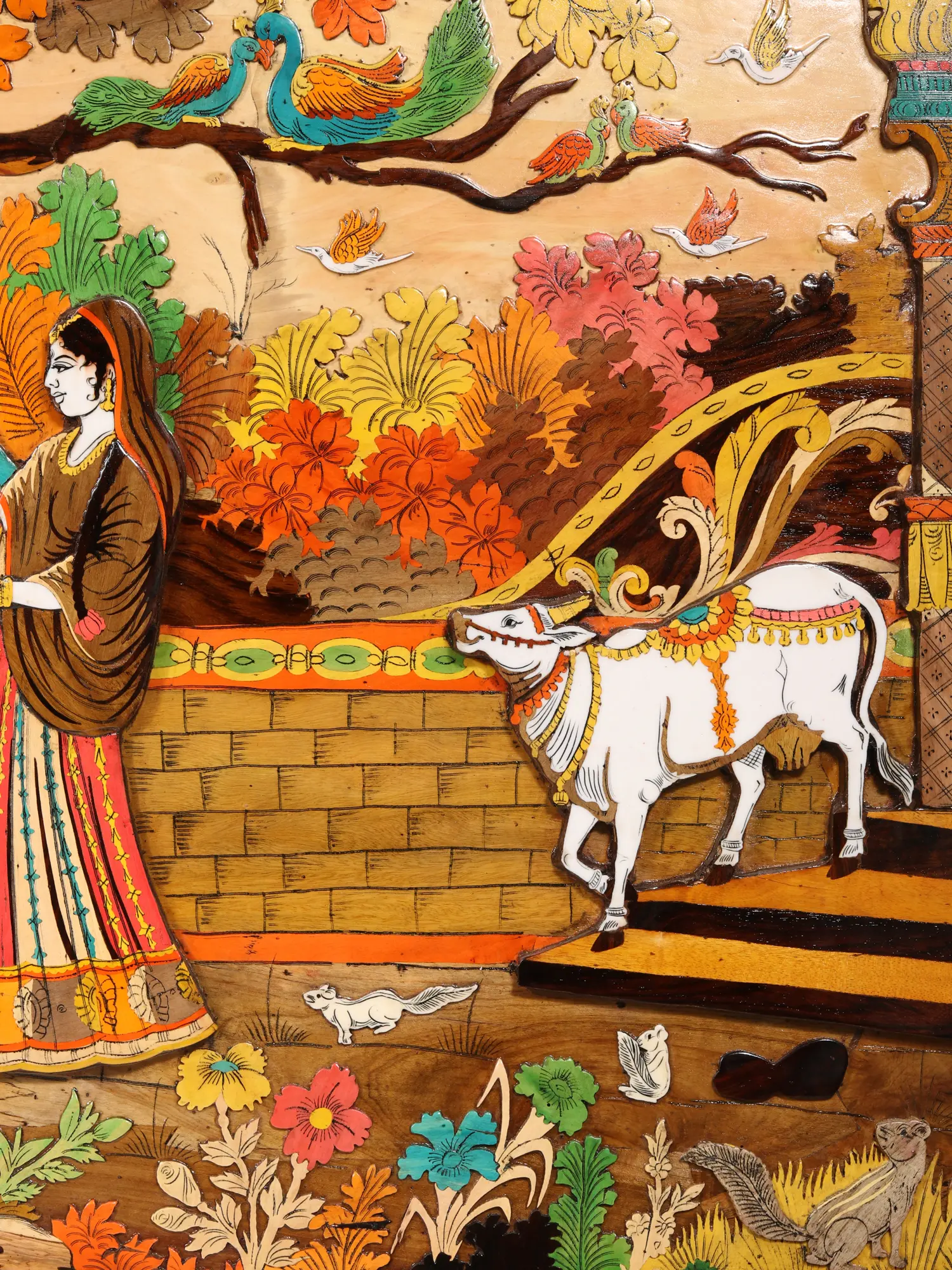 72" Radha And Krishna - 3D View Of Vrindavan Story | Natural Color On Wood Panel With Inlay Work