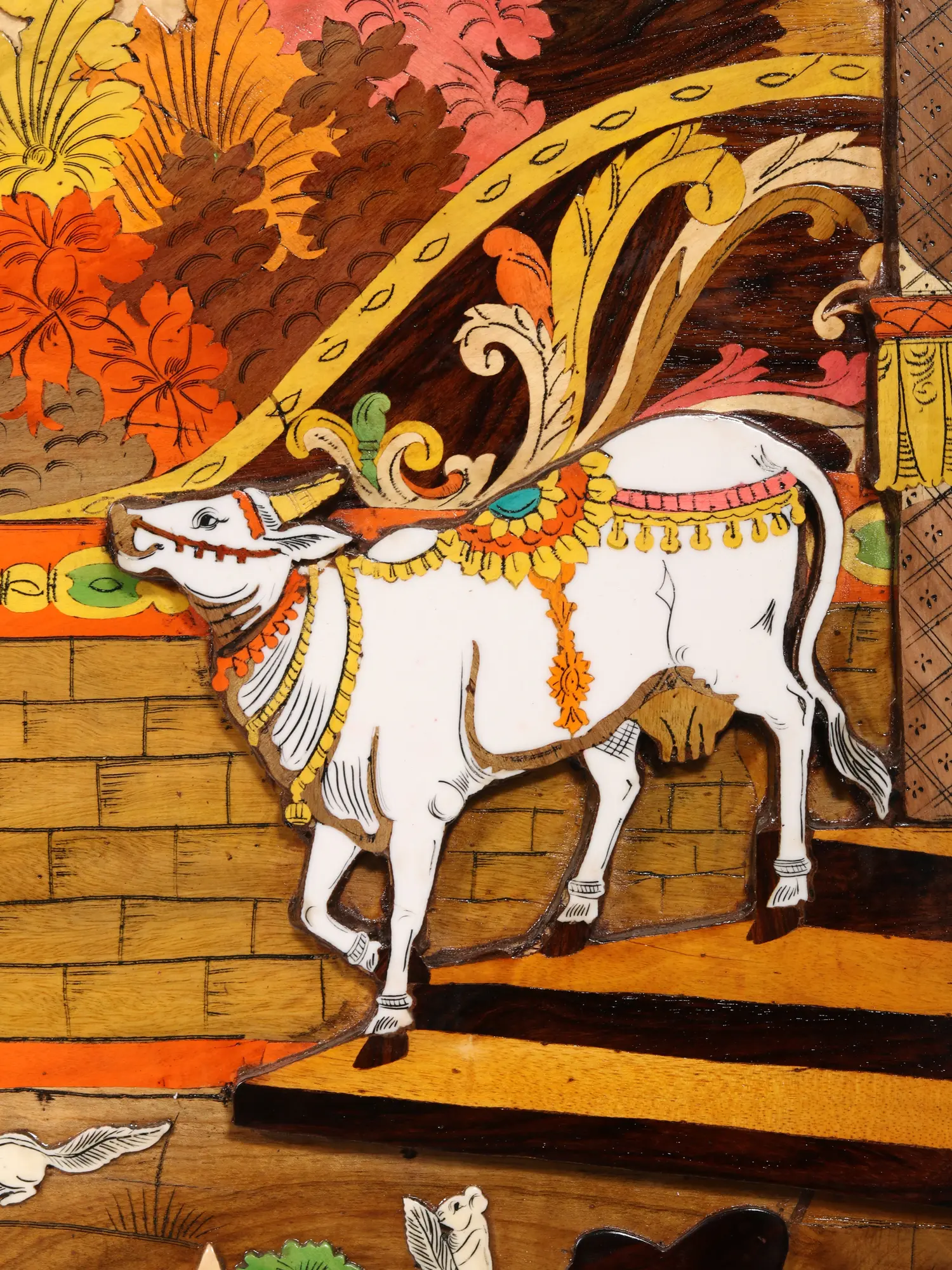 This artwork exemplifies the exquisite artistry of Mysore's traditional wooden inlay technique. Generations of artisans have perfected this craft, skillfully embedding pieces of colored wood into a base to create breathtakingly detailed images. Each piece is meticulously selected and placed, revealing a level of precision and patience rarely seen in contemporary art forms. The vibrant colors used are all natural, and the wood itself adds a warm and organic quality to the piece. Owning this artwork is not just acquiring a decorative object, it's acquiring a piece of living history, a testament to a skill that has been passed down through countless generations.