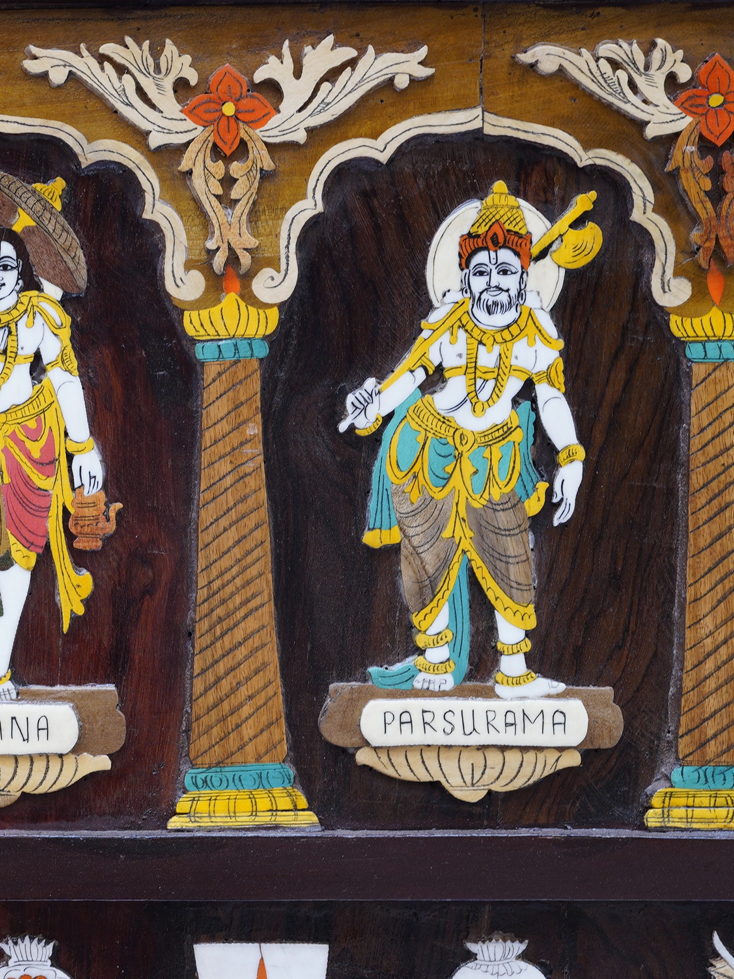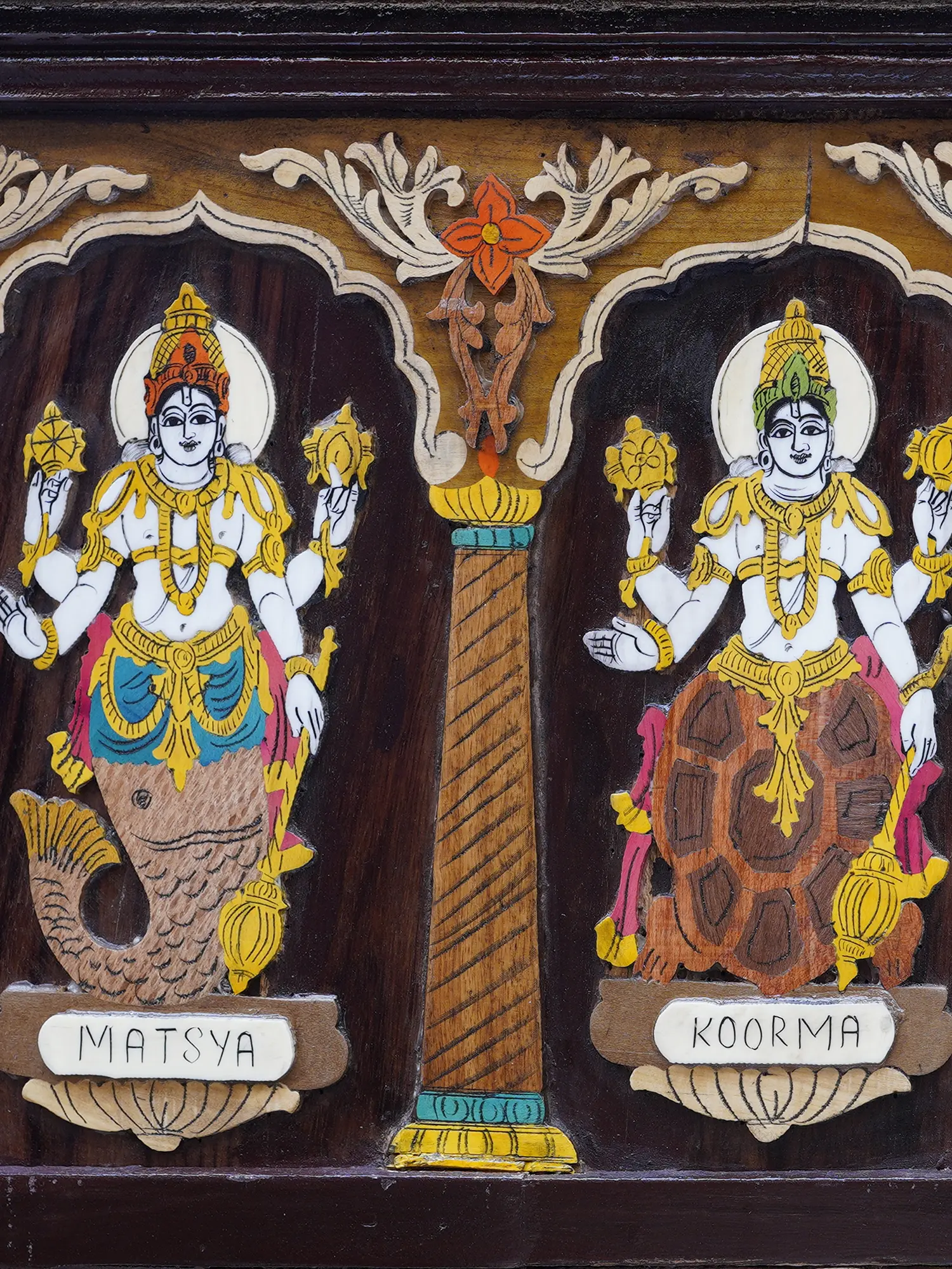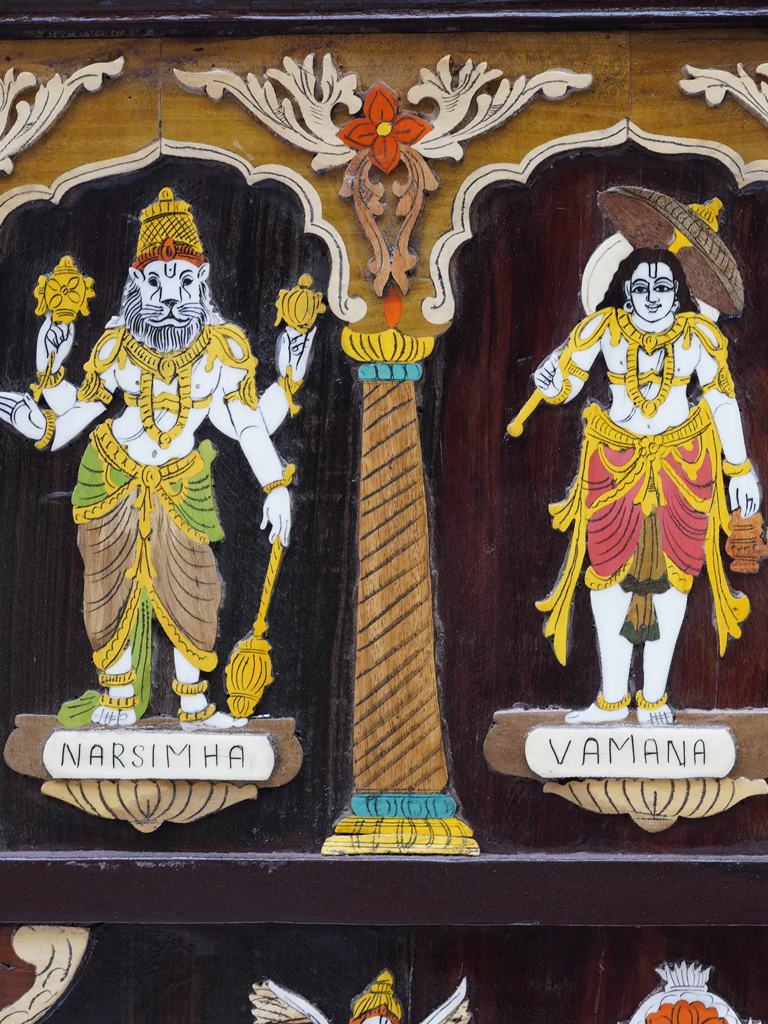 This panel draws inspiration from the profound tales of Vaishnavism, celebrating the divine descent of Lord Vishnu in various forms to restore dharma and protect creation. The depiction of the Srinivasa Kalyanam is particularly significant, representing the auspicious union that symbolizes prosperity and divine blessing. This piece resonates with the devotional spirit and the artistic heritage of South India, particularly the Mysore school of art known for its intricate inlay work.